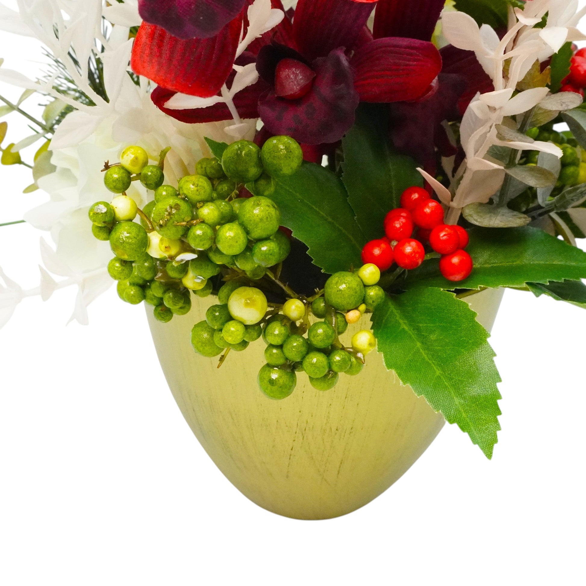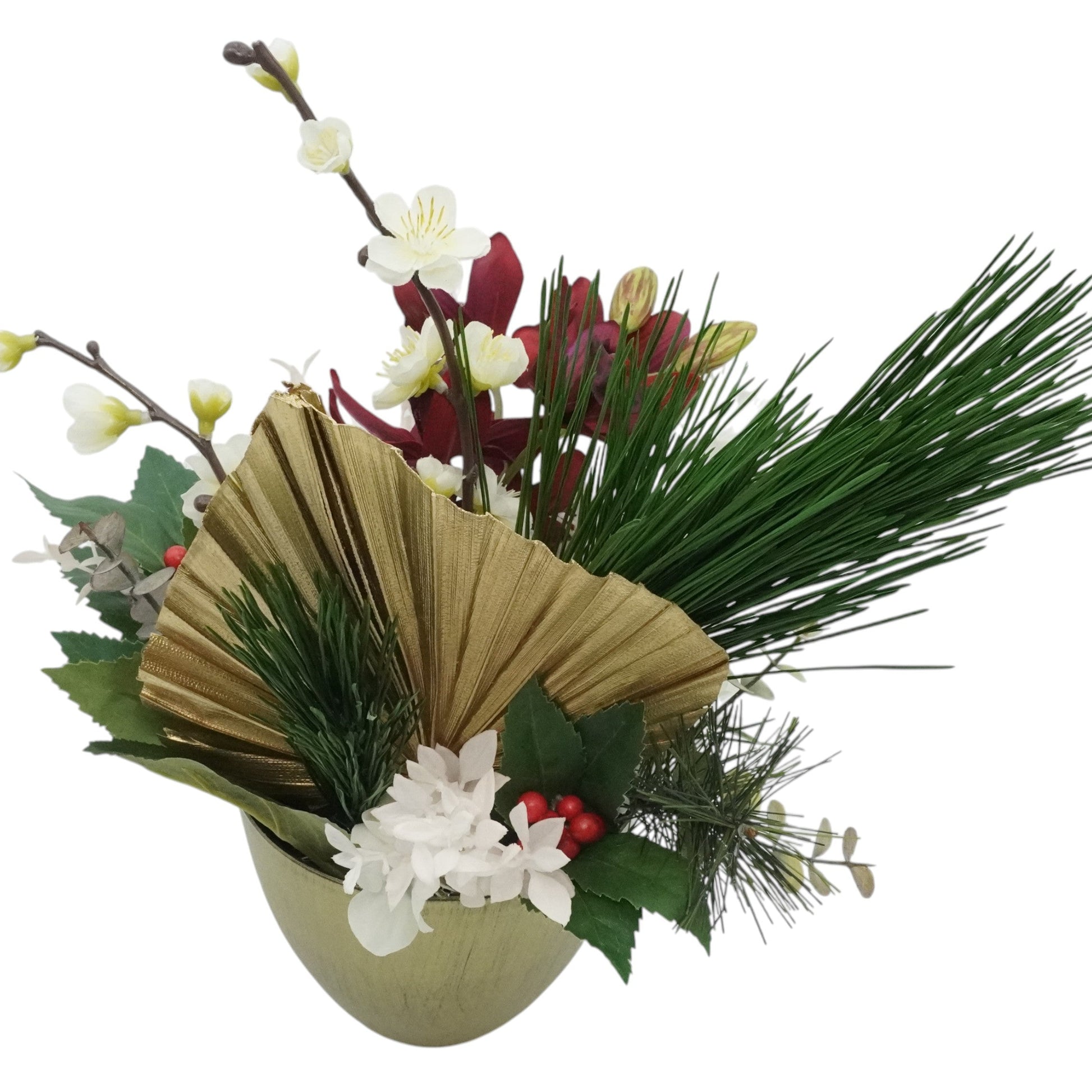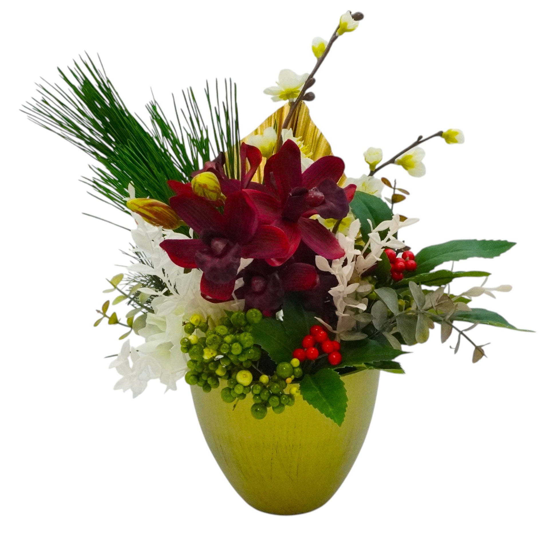 金色の器がアクセントとなり、玄関やリビングに飾るだけで新年らしい華やぎを演出します。