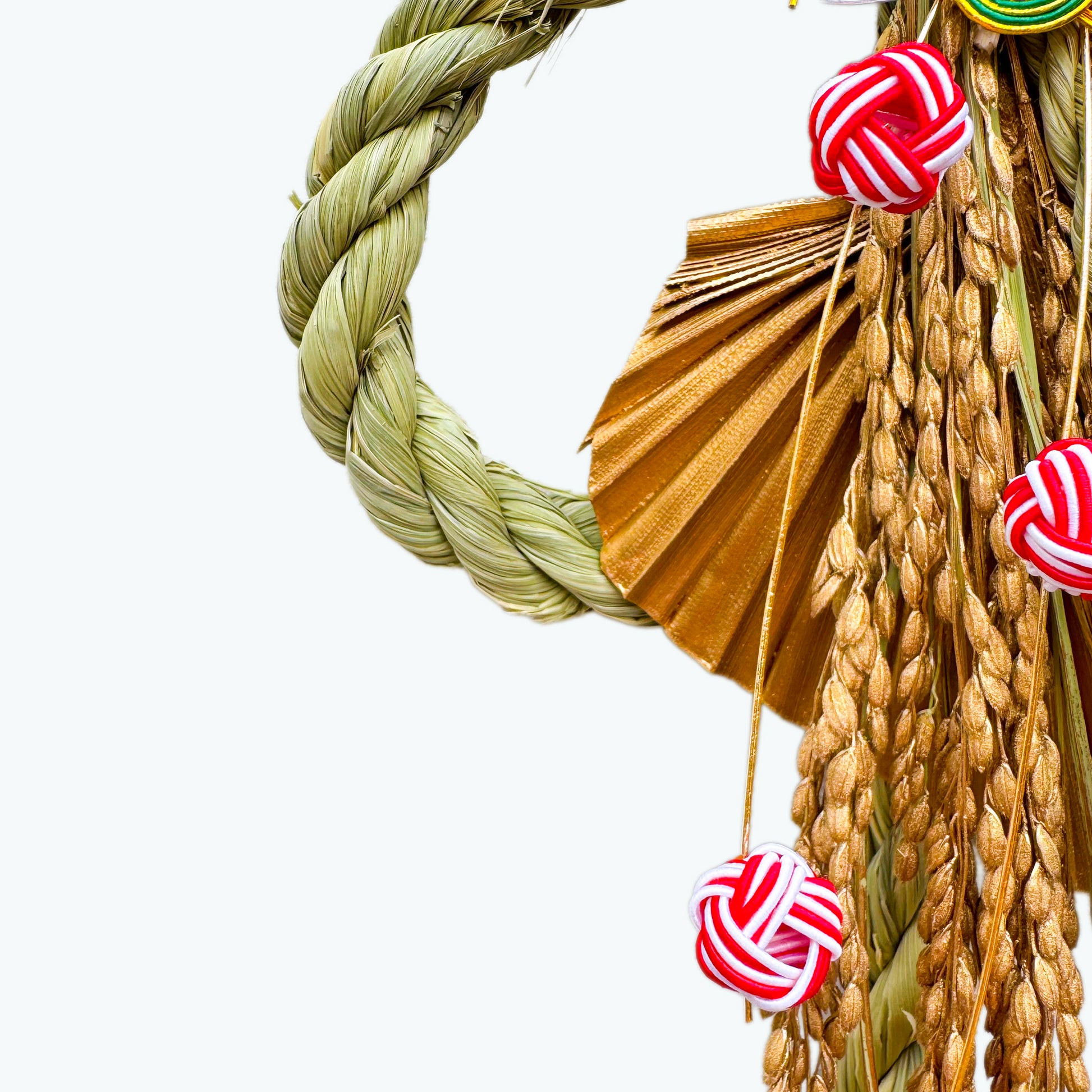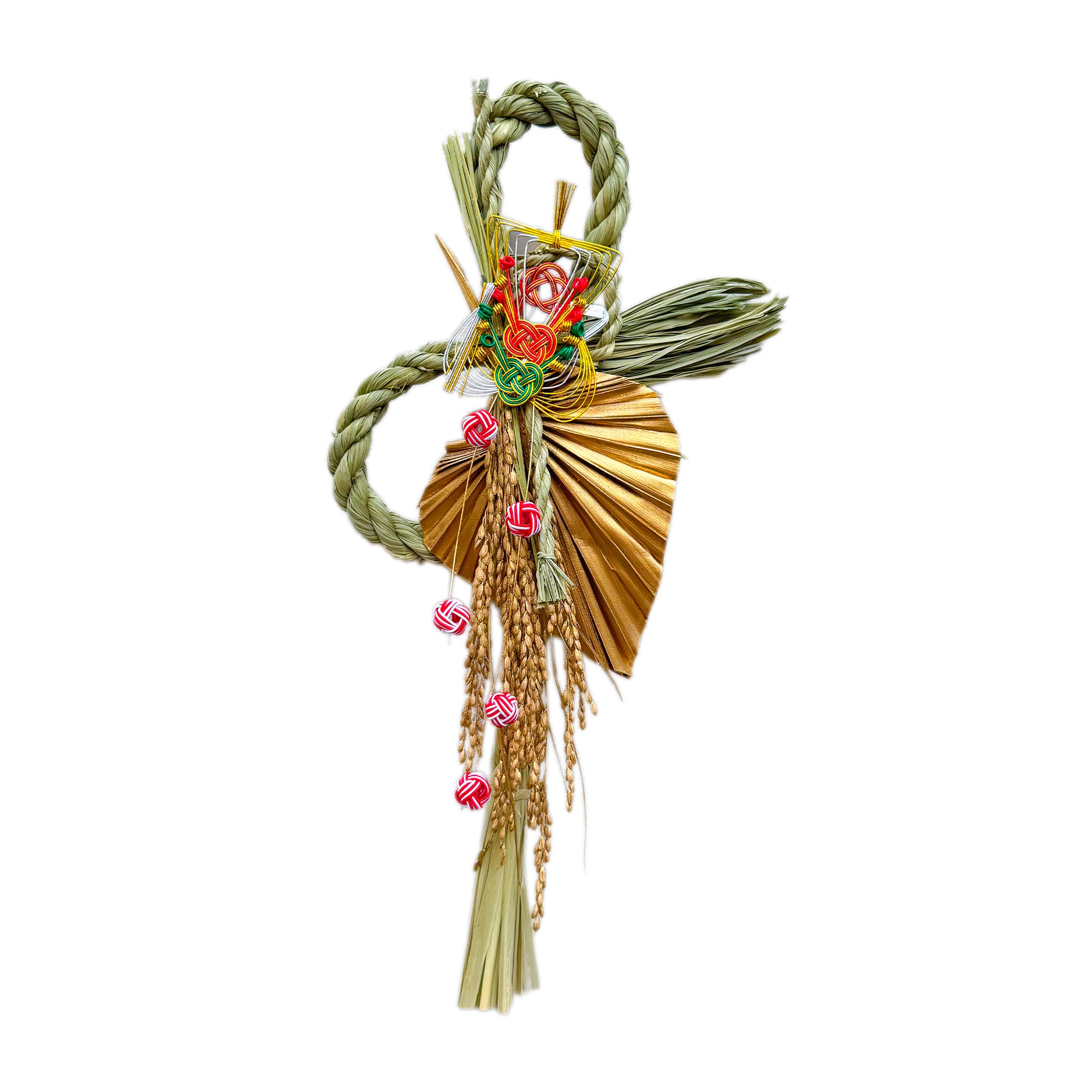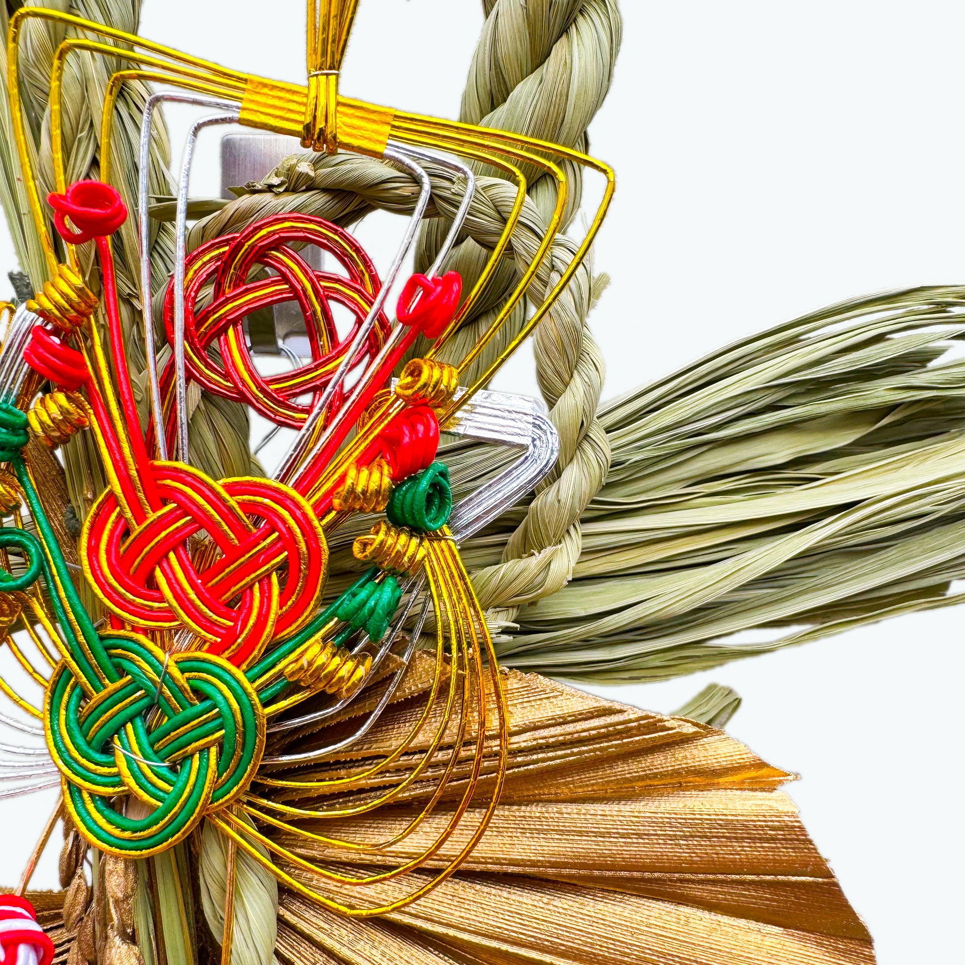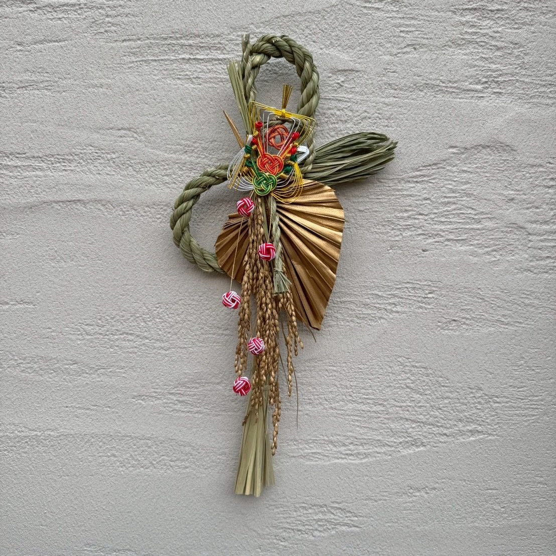 金色の扇と水引飾りを組み合わせた、華やかで上品なしめ飾りです。
