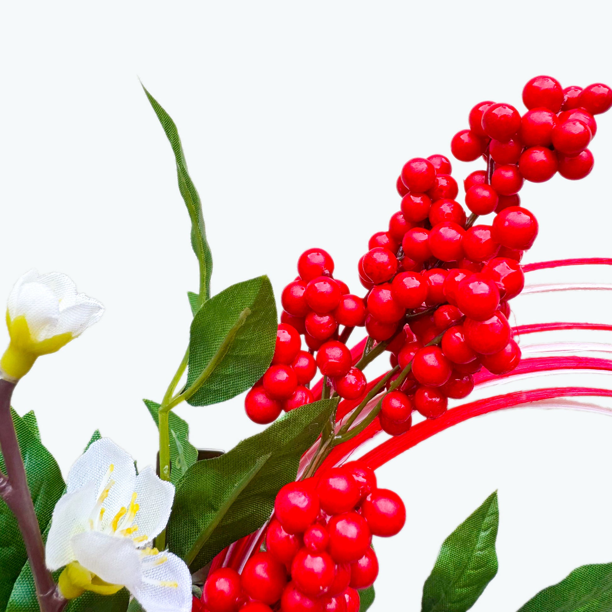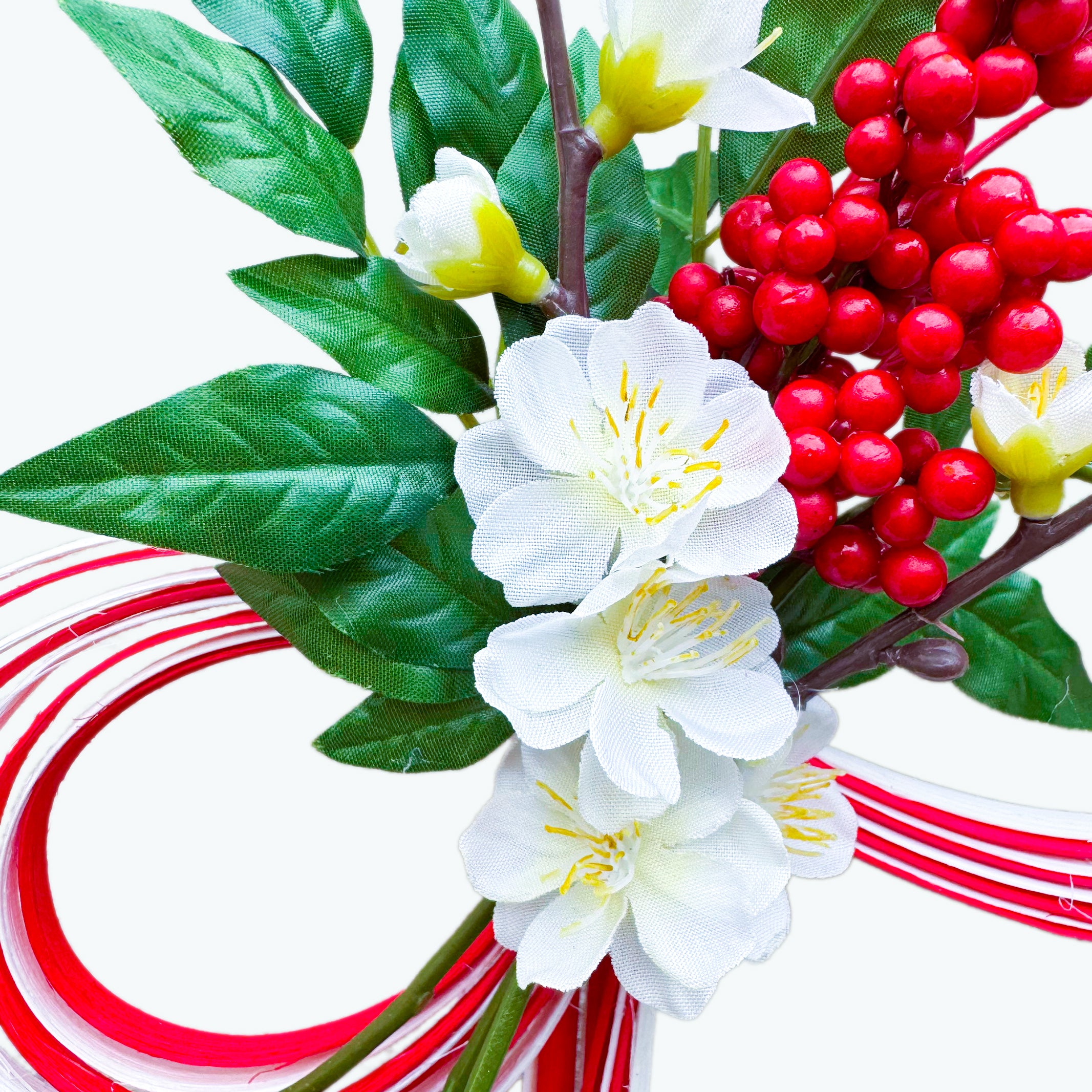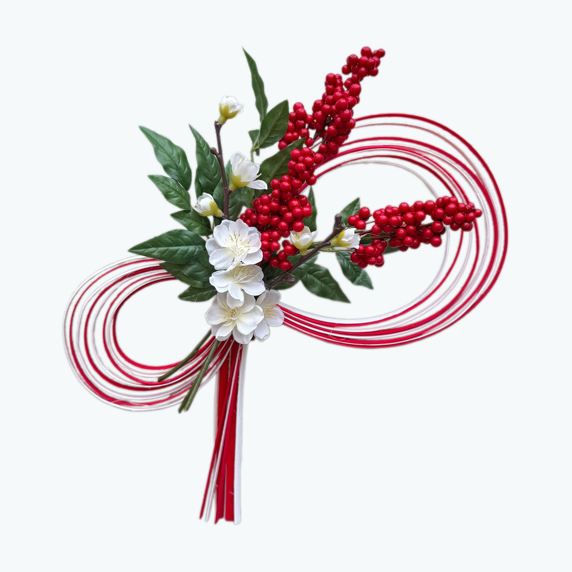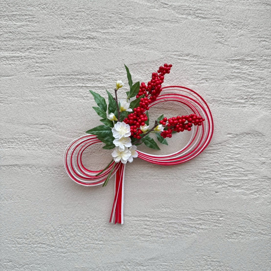 紅白の水引に、実のたっぷりついた南天と白い梅を合わせた華やかなデザインのしめ飾りです。