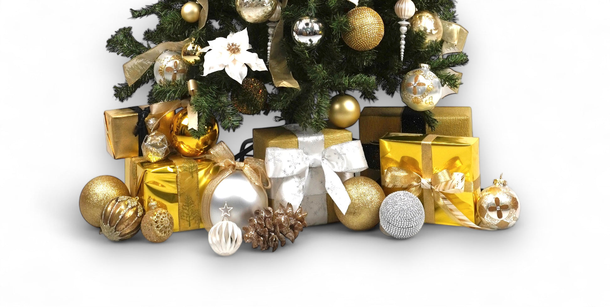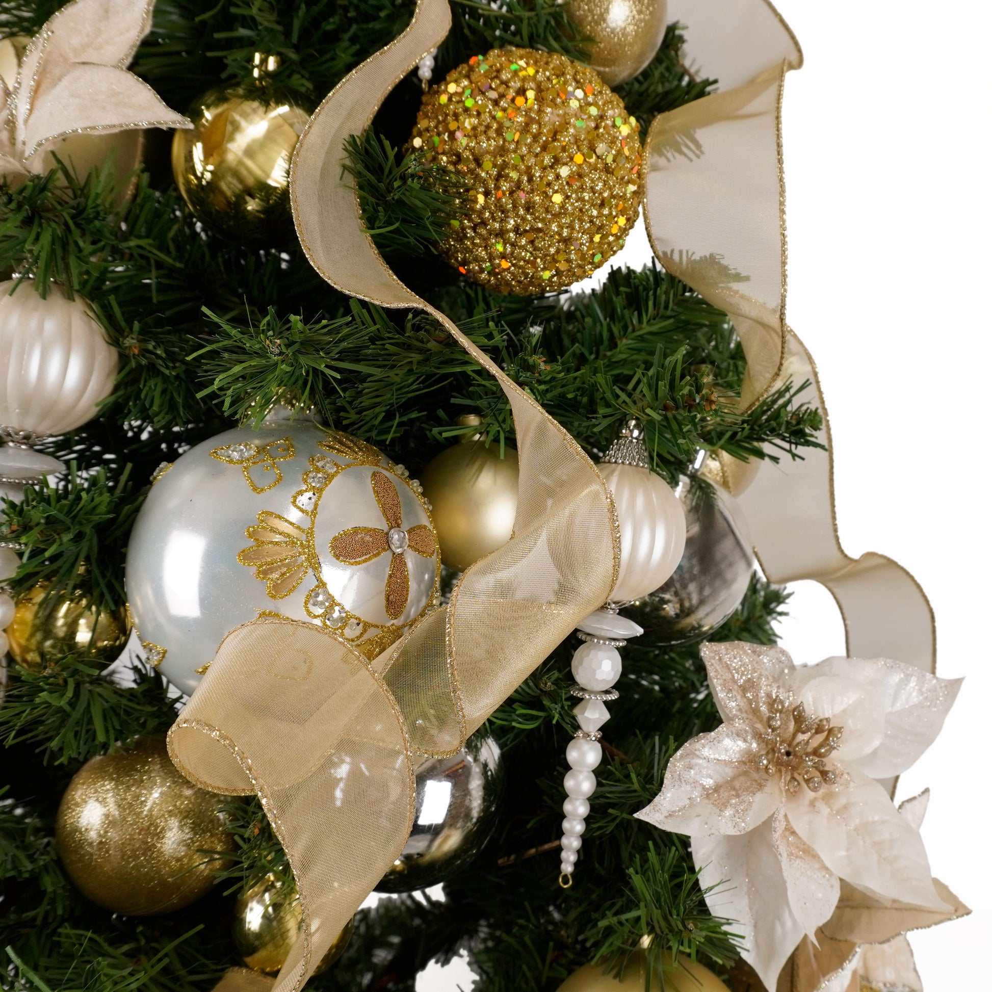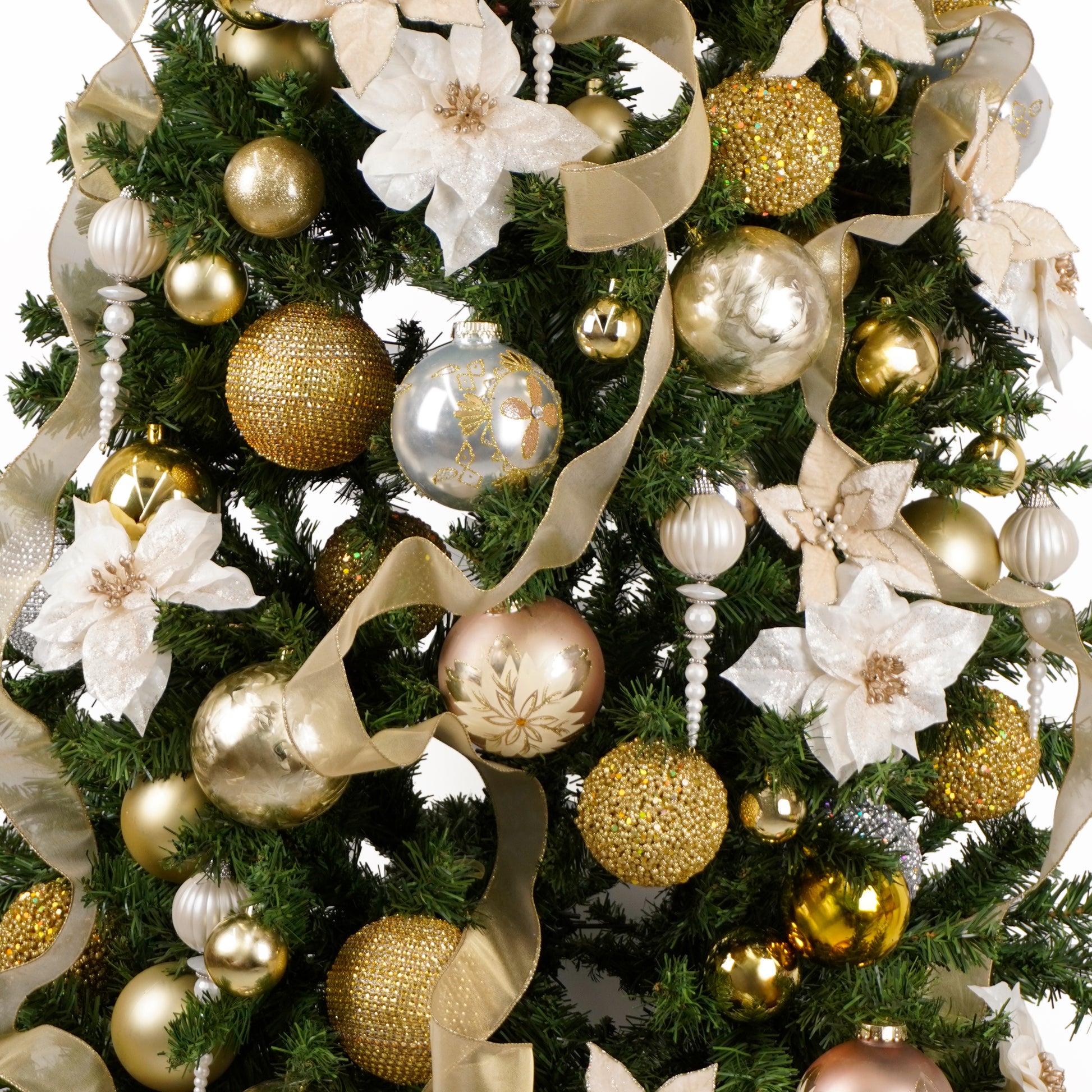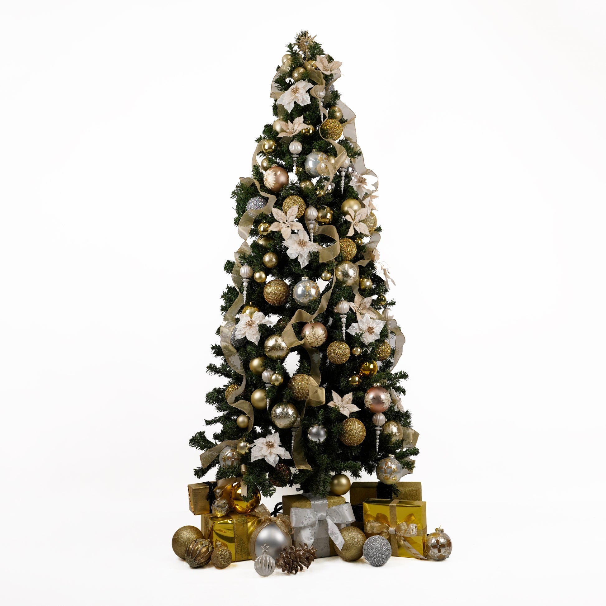 シャンパンゴールドとホワイトのポインセチアが贅沢に敷き詰められた2mのゴージャスツリー。質感や素材の違うゴールドやシルバーのオーナメントも充分なほど装飾され、豪華さと華やかさをお部屋にもたらします。ホームパーティーや特別なイベントで特別な雰囲気を演出。華やかなディスプレイで、クリスマスの魔法をお部屋に引き込みましょう。<注:足元のギフトボックスやオーナメントは付属しません。別途オプションにてセット購入可能です。><注:送料無料対象外>