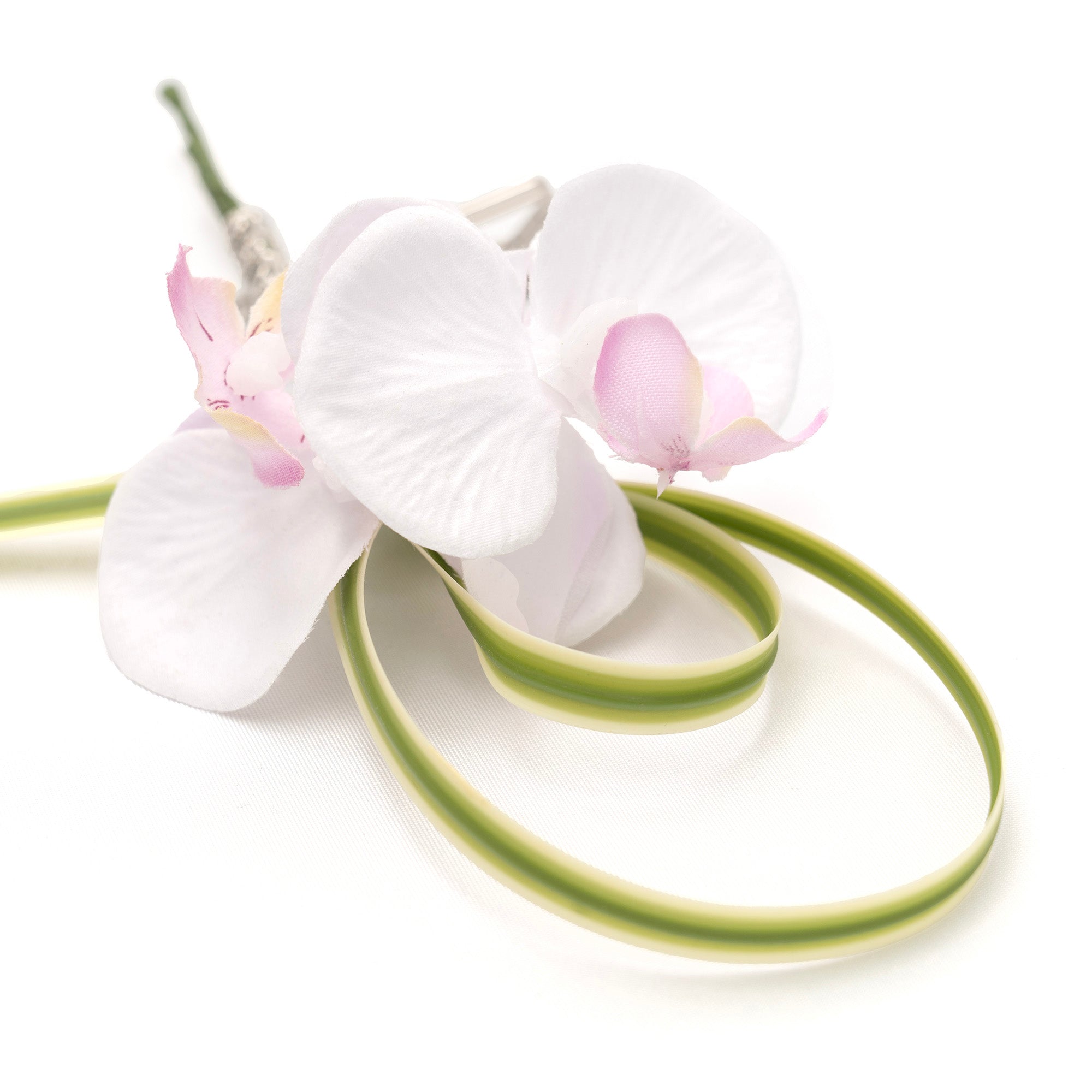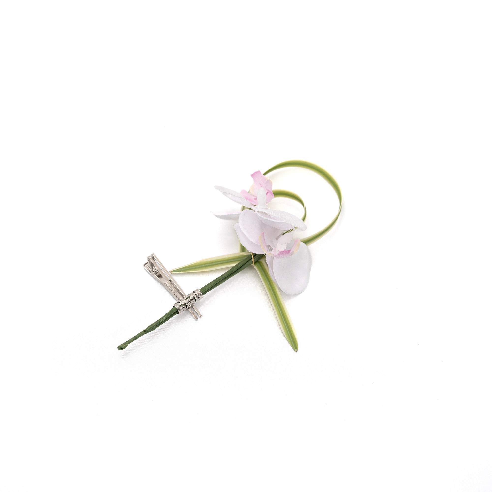 ブートニアは、卒業式や結婚式の際に新郎が胸元に使用するなどお祝いのシーンで用いられることが多いアイテムです。花言葉が「美しい淑女」「優雅」「愛情」「上品」である蘭は、その見た目もゴージャスであり、ブートニアとして華やかなシーンに映えるお花です。優美な蘭で胸元を華麗に彩りましょう。仕様(サイズ、重さ、素材)