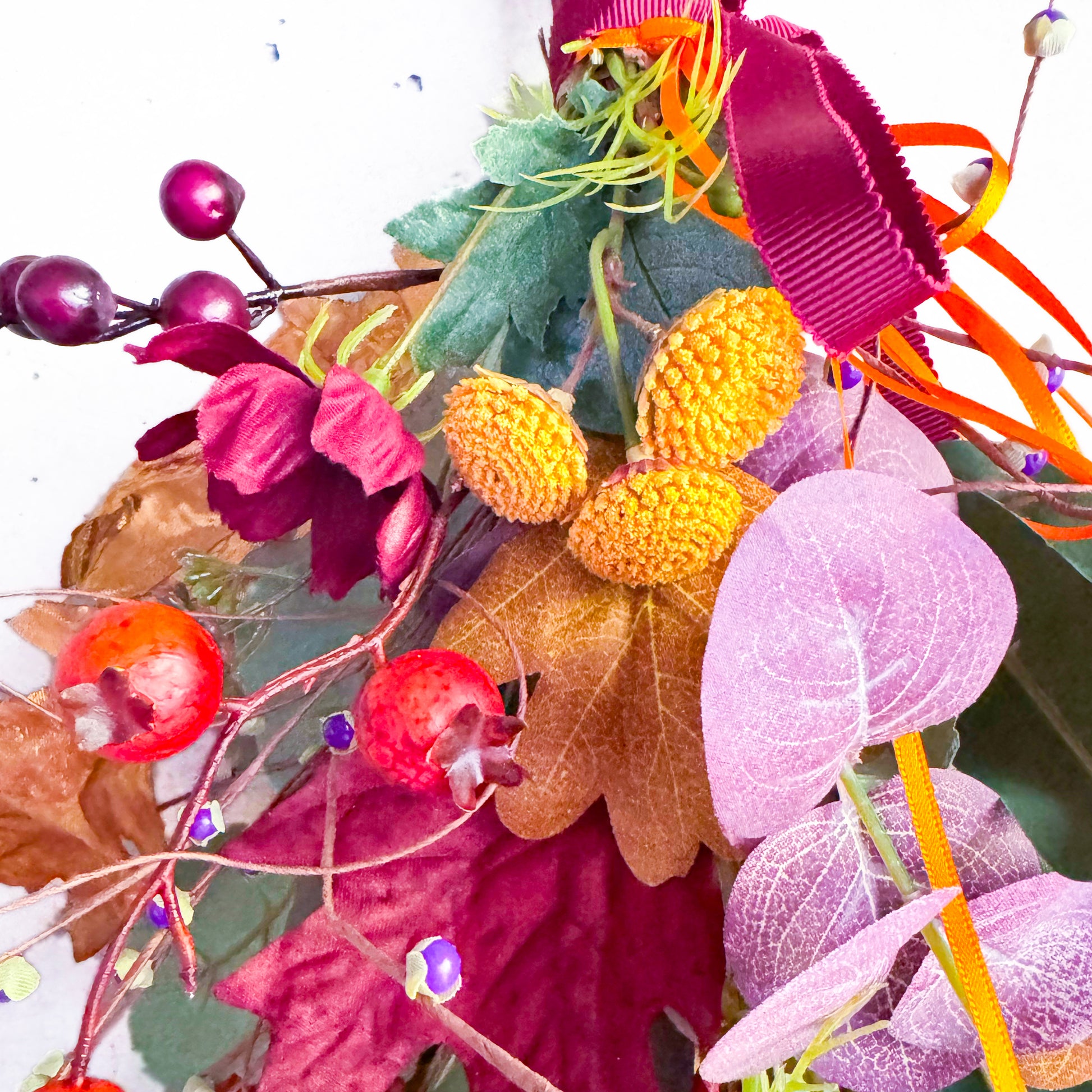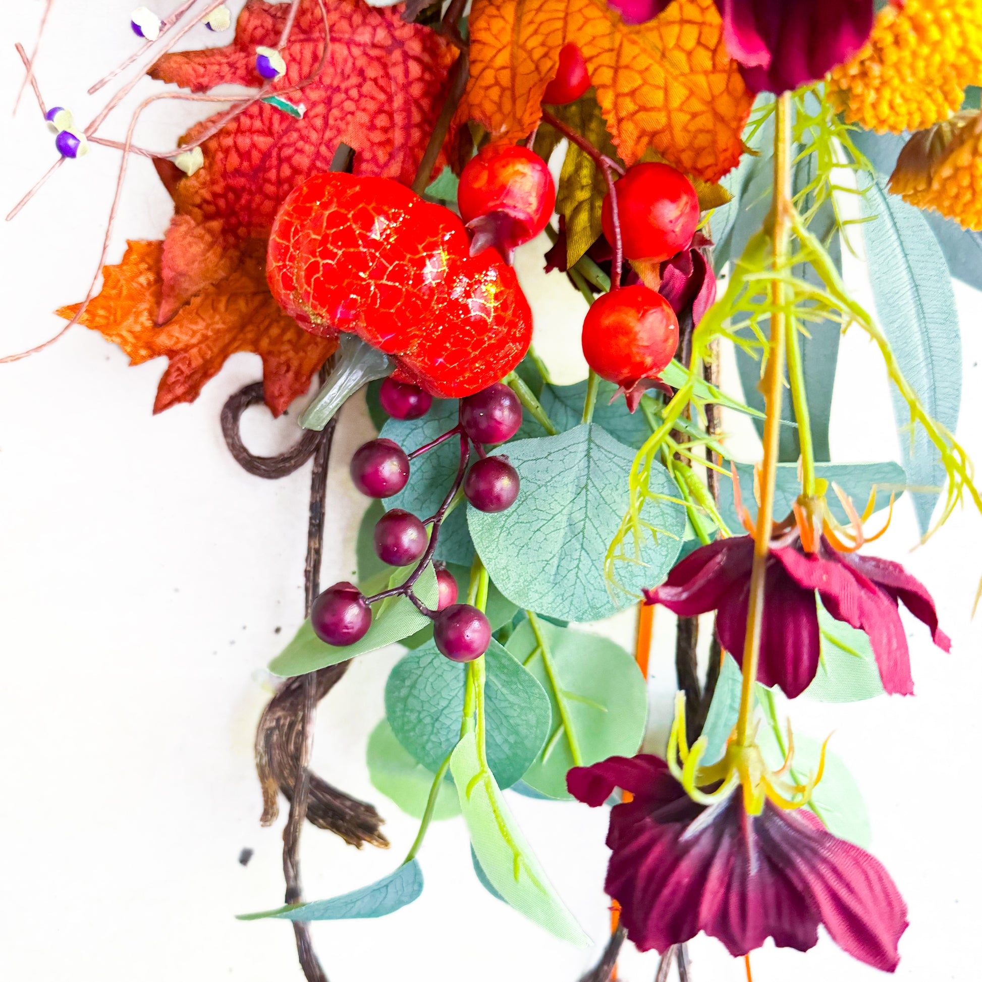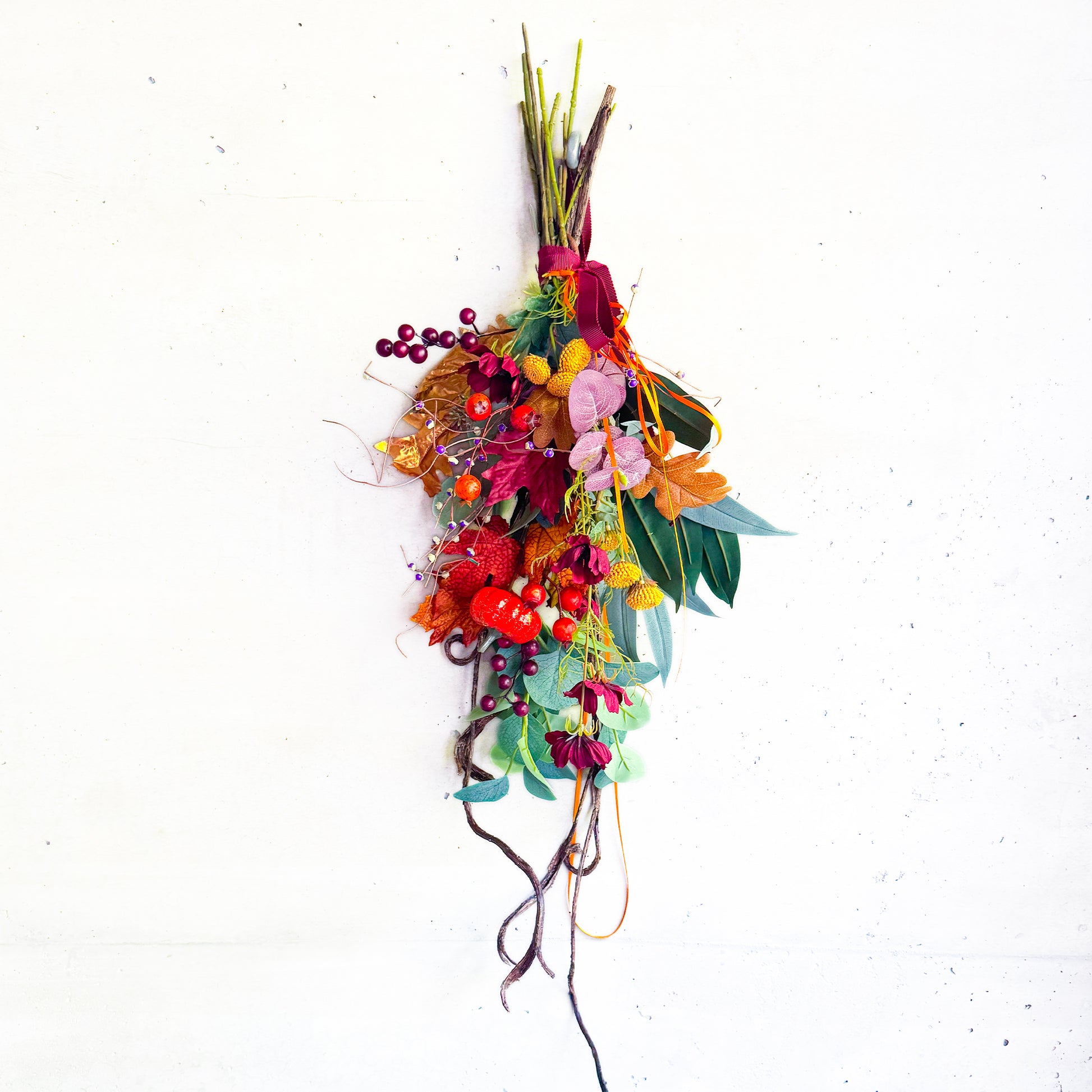 実りの季節を感じさせる、深みのあるレッド・オレンジ・ゴールドを基調にした秋色スワッグ。
