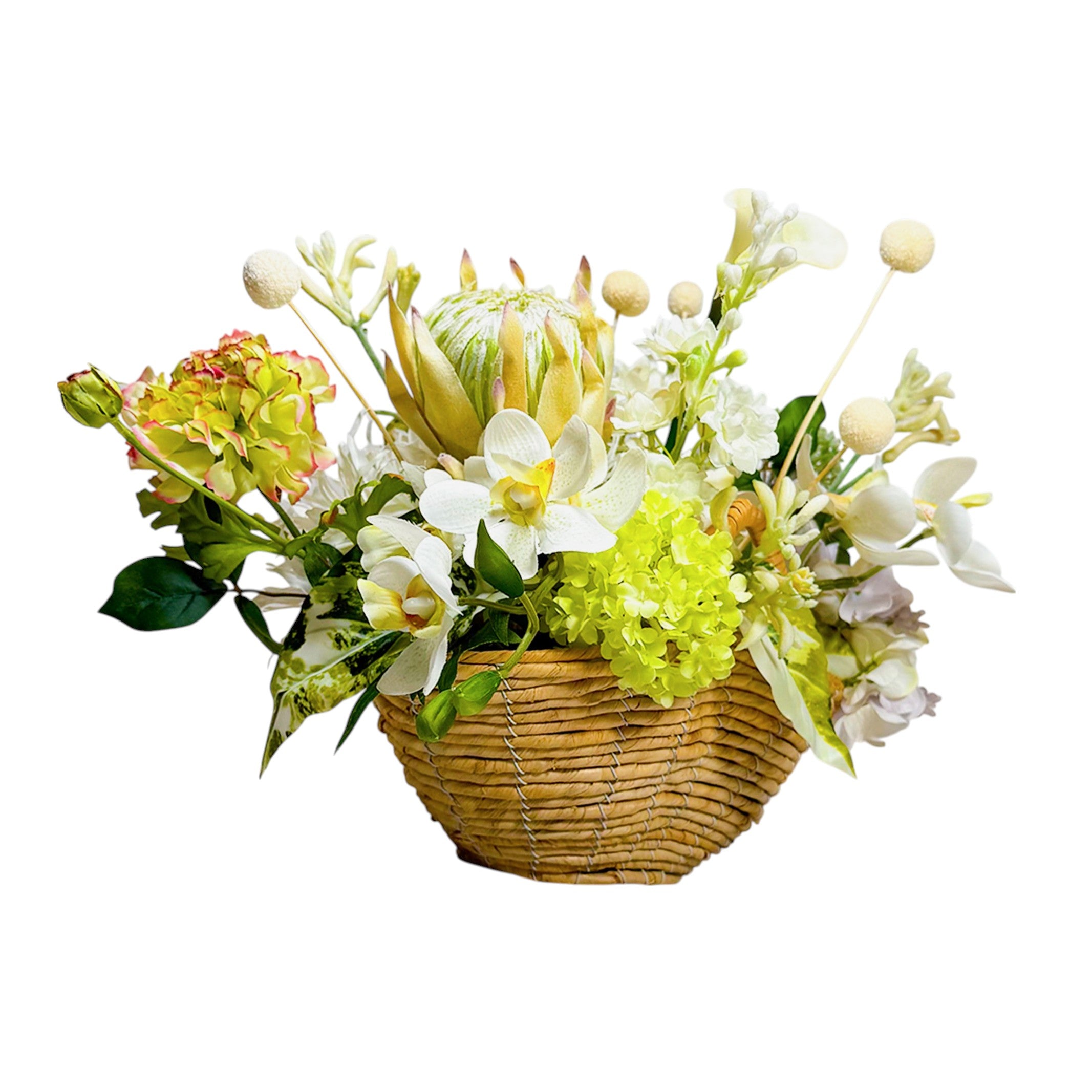 ホワイトとグリーンを基調としたアレンジには、上品なカラー、蘭、胡蝶蘭、紫陽花、ラナンキュラスが咲き誇り、目を引く美しさ。デルフィニウムやカンガルーポー、グリーンのポトスがナチュラルなアクセントに。白く丸みのあるクラスペディアが、ポップで愛らしい印象を添えます。