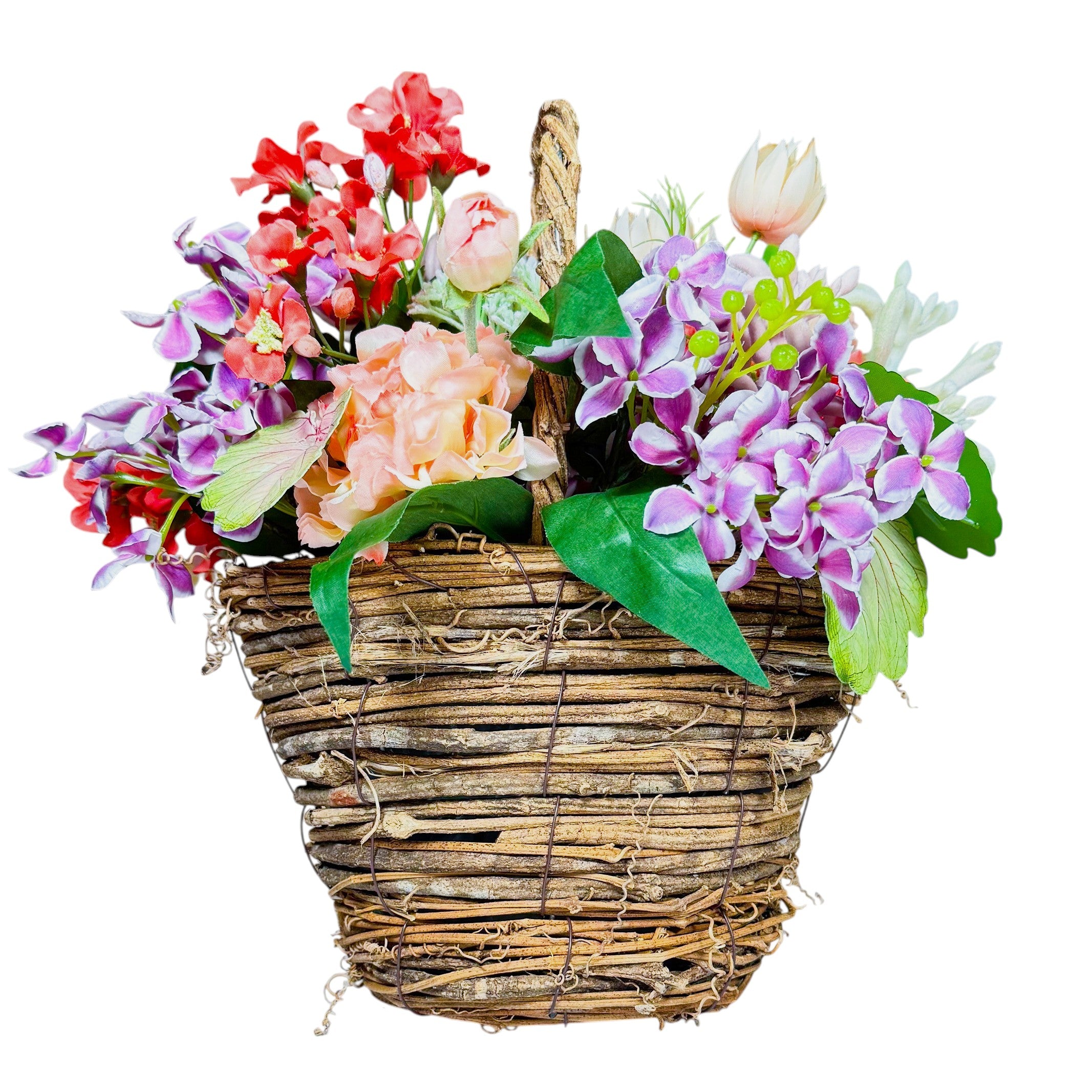 ナチュラルで気取らず、可愛らしさを添えるバスケットアレンジは、誰からも愛される人気アイテム。中でも、花々をぎゅっと詰め込んだタイプは、ロマンチックでキュートな魅力に満ちています。上部に持ち手があるため、吊るしたり、テーブルにそのまま置いたりと楽しみ方も自在です。