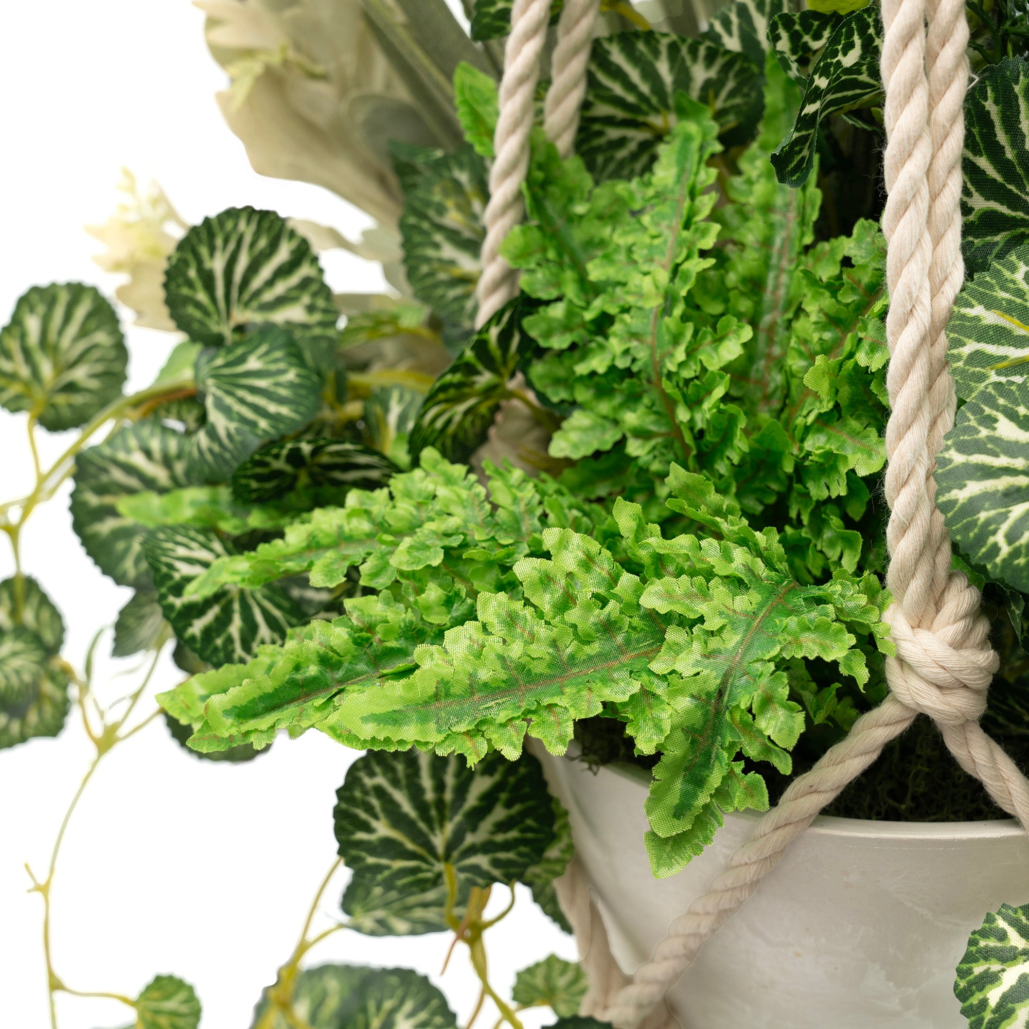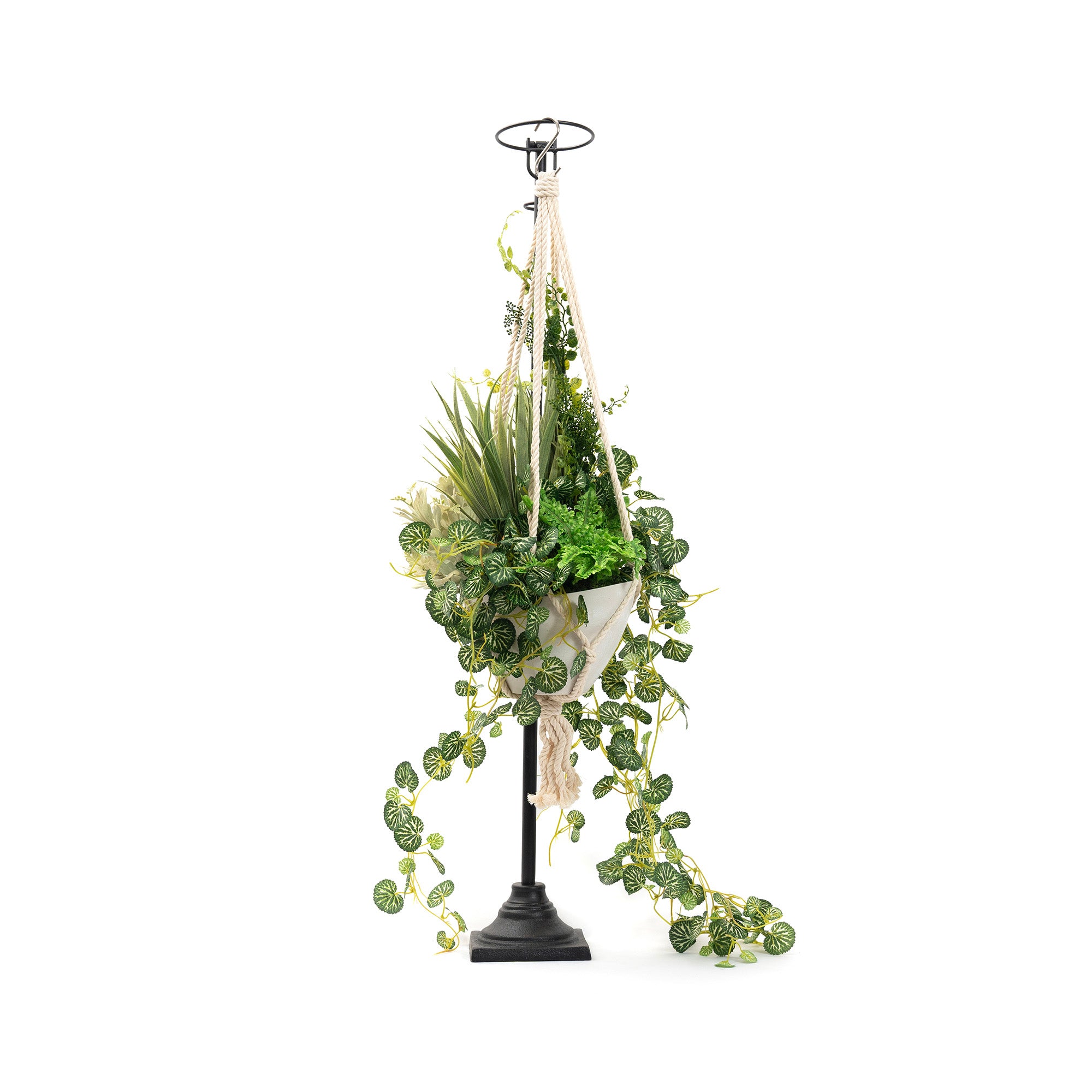 ハンギングで吊るすだけで、空きがちなスペースをおしゃれに演出。狭いお部屋や床に植物を置けない場合でも空間を上手に使えます。またグラスと玉シダ、ベゴニアのそれぞれ異なるグリーンがナチュラルかつ、丁寧に暮らしている印象を与えます。中でもベコニアの縦のシルエットが洗練され、ファッショナブルです。オフィスや書斎、開店祝いなどに人気の品です。<注:S字フックは付属しません>