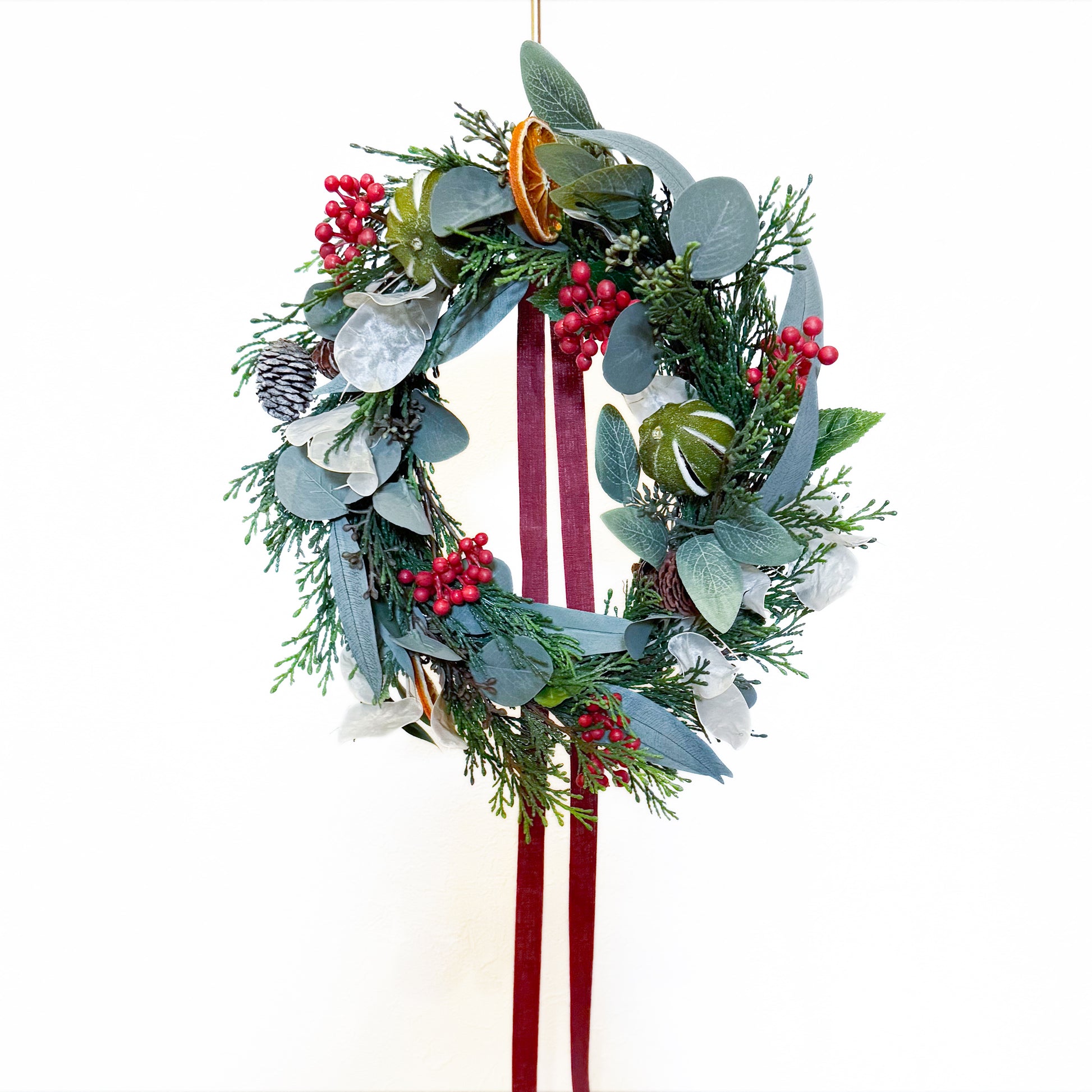 シダ、ユーカリをベースに、ルナリア、松ぼっくり、赤い実がクリスマスらしさを演出。ワインレッドリボンがファッショナブル。またライムとオレンジのドライフラワーがアクセントになり、ナチュラル・ボタニカルな印象を与えます。