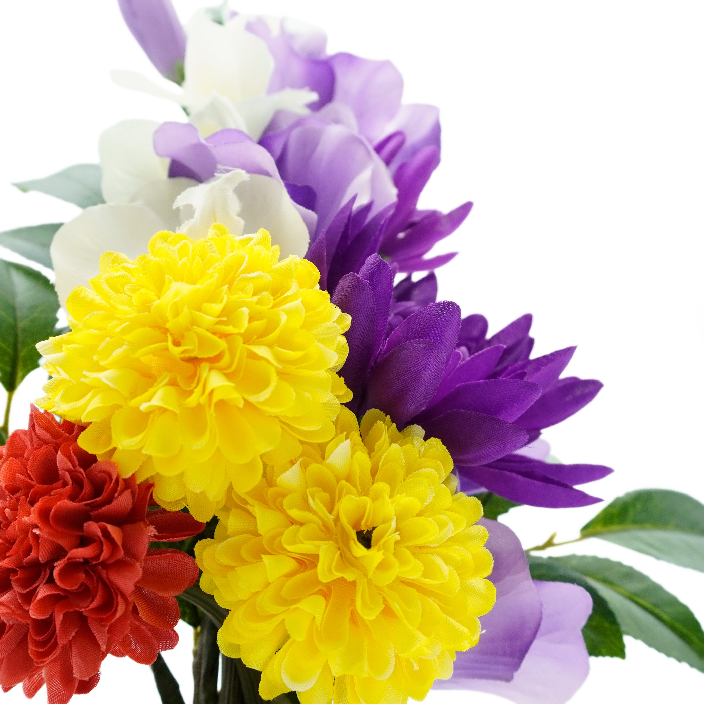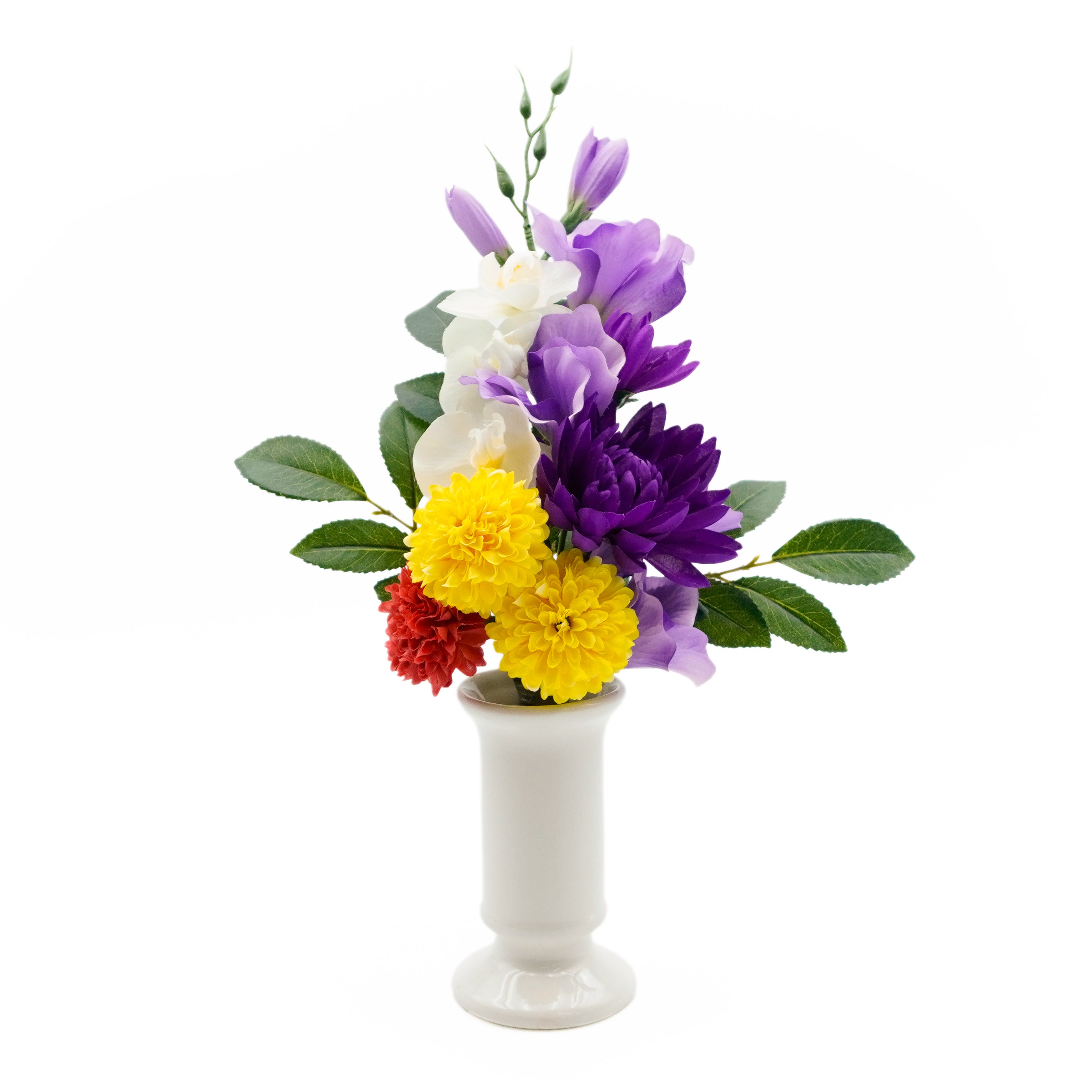 現代のインテリアや仏具にもマッチする華やかな仏花です。生花は夏場や長期不在時に枯れたり、臭いの心配がありますが、アーティフィシャルフラワーは美しさそのままで、お手入れが手軽です。美しいグラジオラス、胡蝶蘭、ポンポンマム、マム、ラスカススプレーの造花で素晴らしい色彩と輝きを表現。仏様への最高の敬意を込めた花々で心を癒します。生花を頻繁に買いに行けない高齢の方や、お彼岸やお盆をはじめとした仏壇などに重宝するアレンジメント。