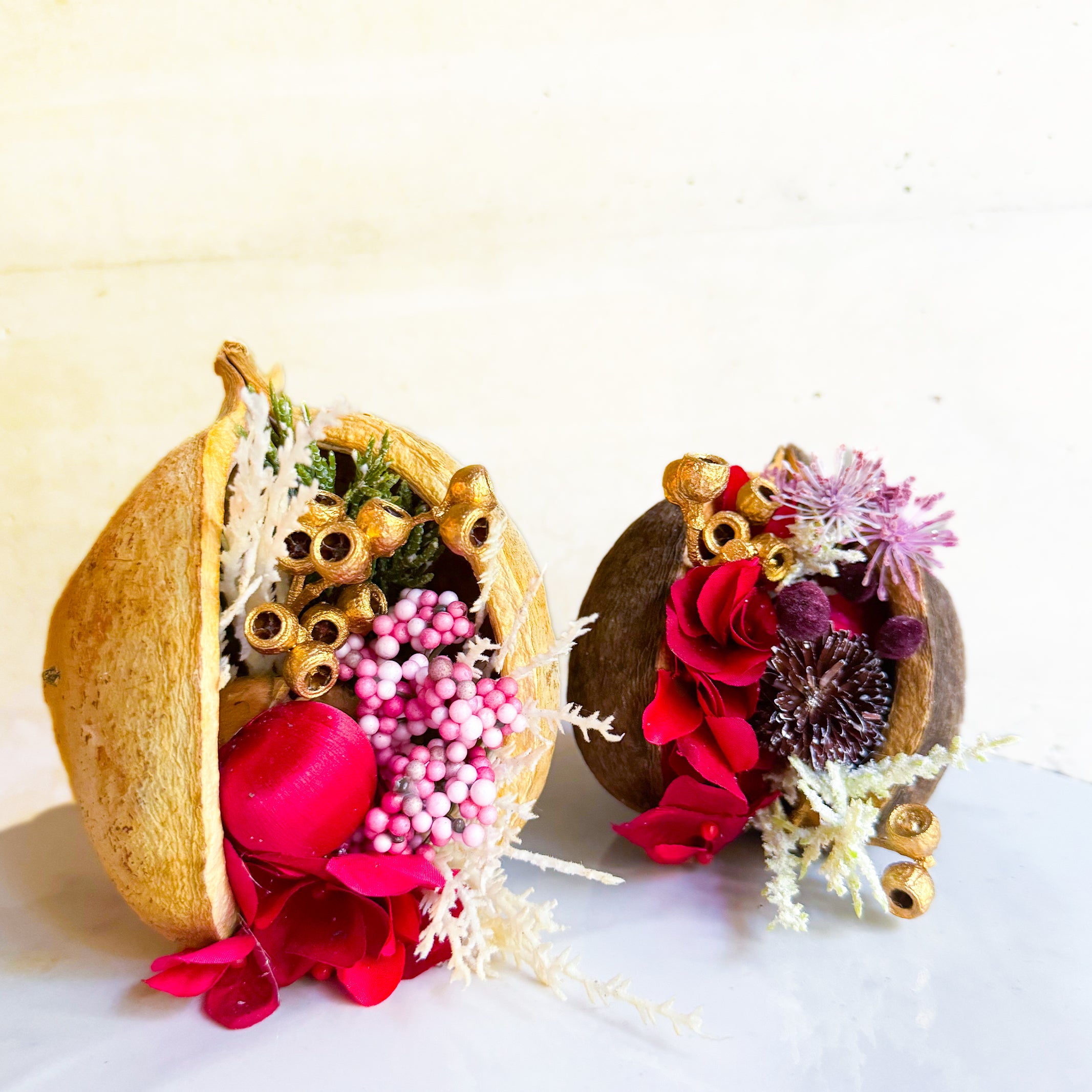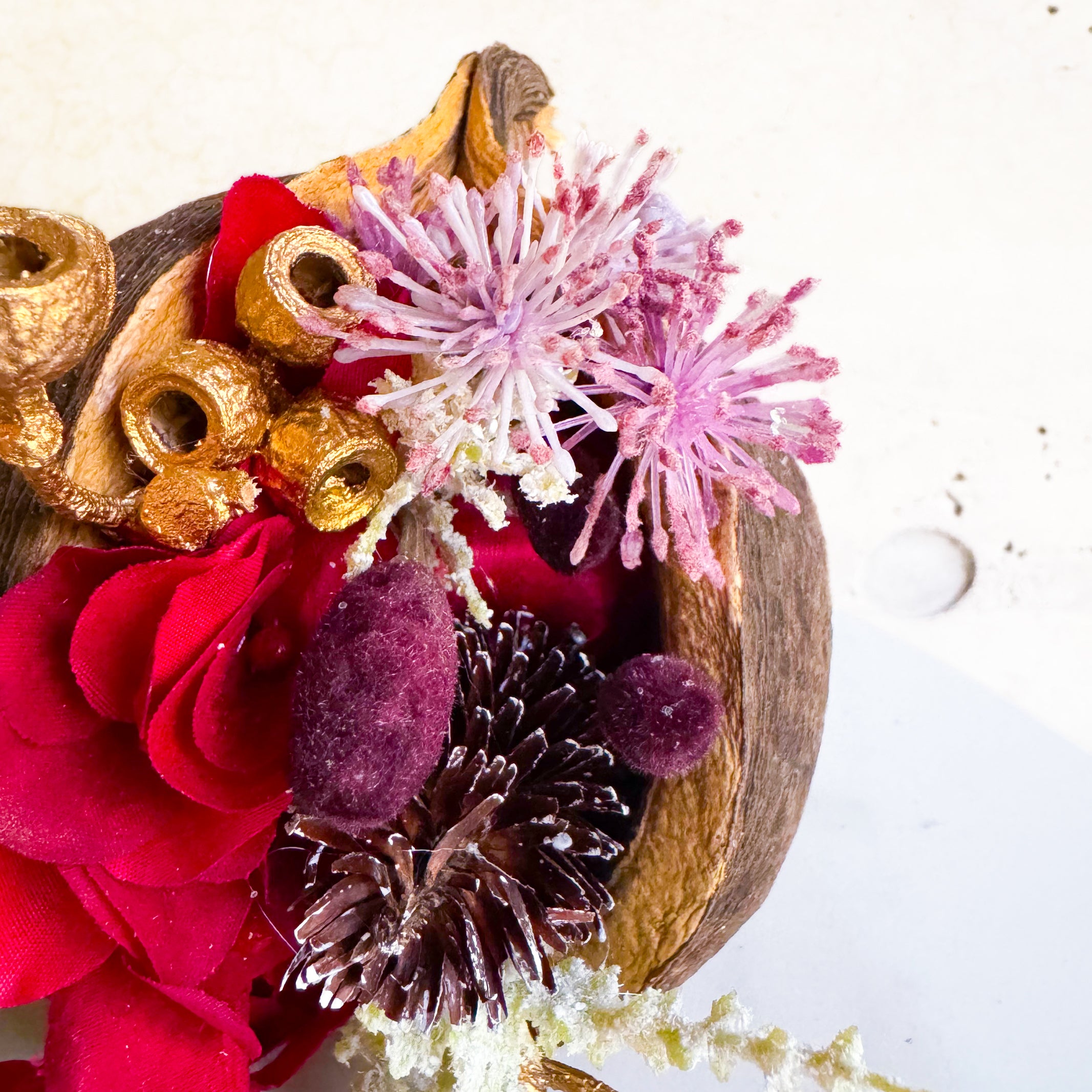 - ナチュラルカラー ・花材:ブッダナッツ、ピンクペッパー、ゴールドのアンバーナッツ、ヒバ、赤いオーナメント ●ブラウンカラー ・花材:ブッダナッツ、ゴールドのアンバーナッツ、紫陽花、たんぽぽ、 ワレモコウ、ヒバ、松ぼっくり