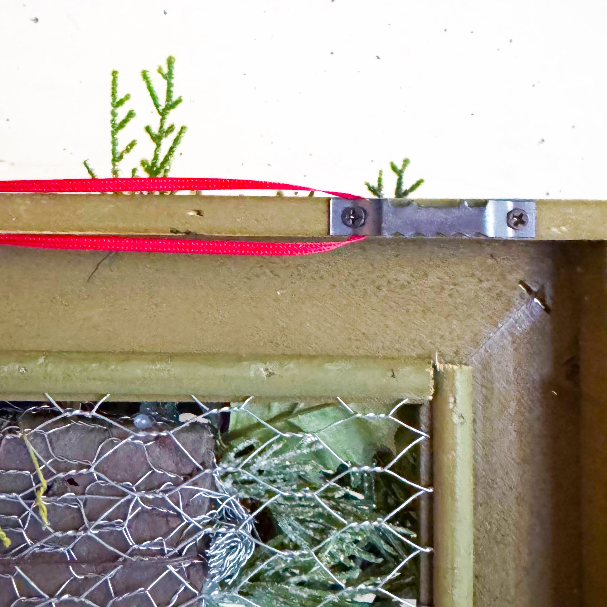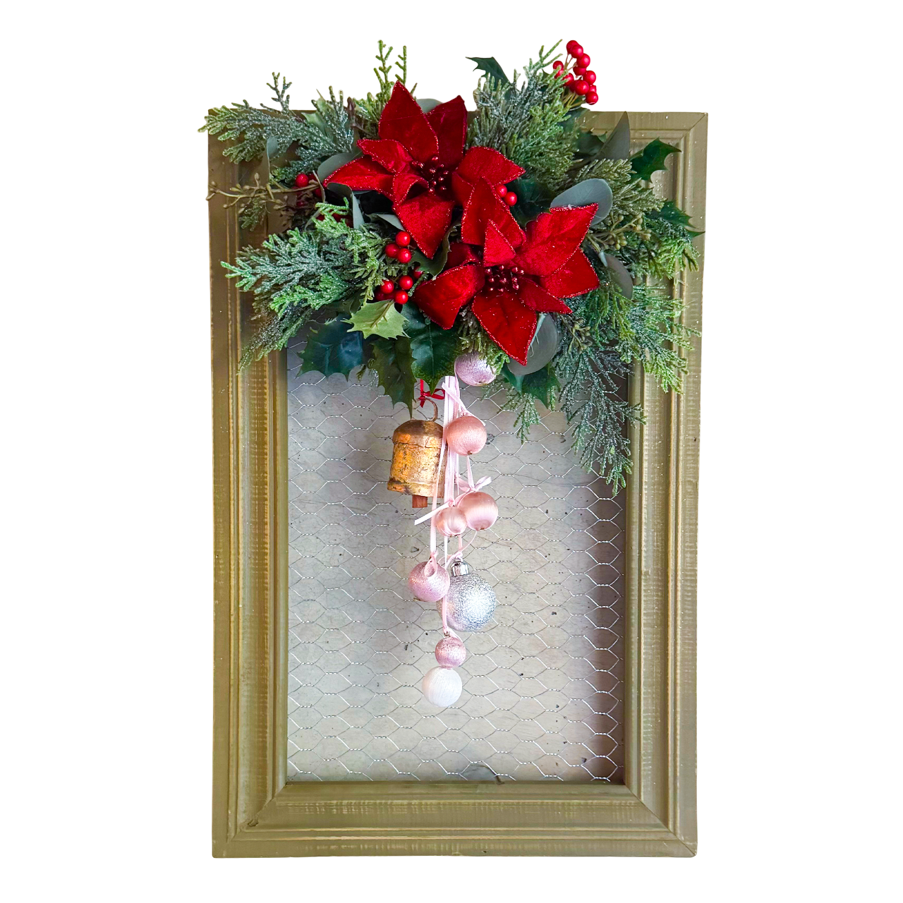 - 花材:ポインセチア、ヒイラギ、ヒバ、ユーカリ、ピンクのオーナメント ・その他:フレーム、網、リボン、ベル