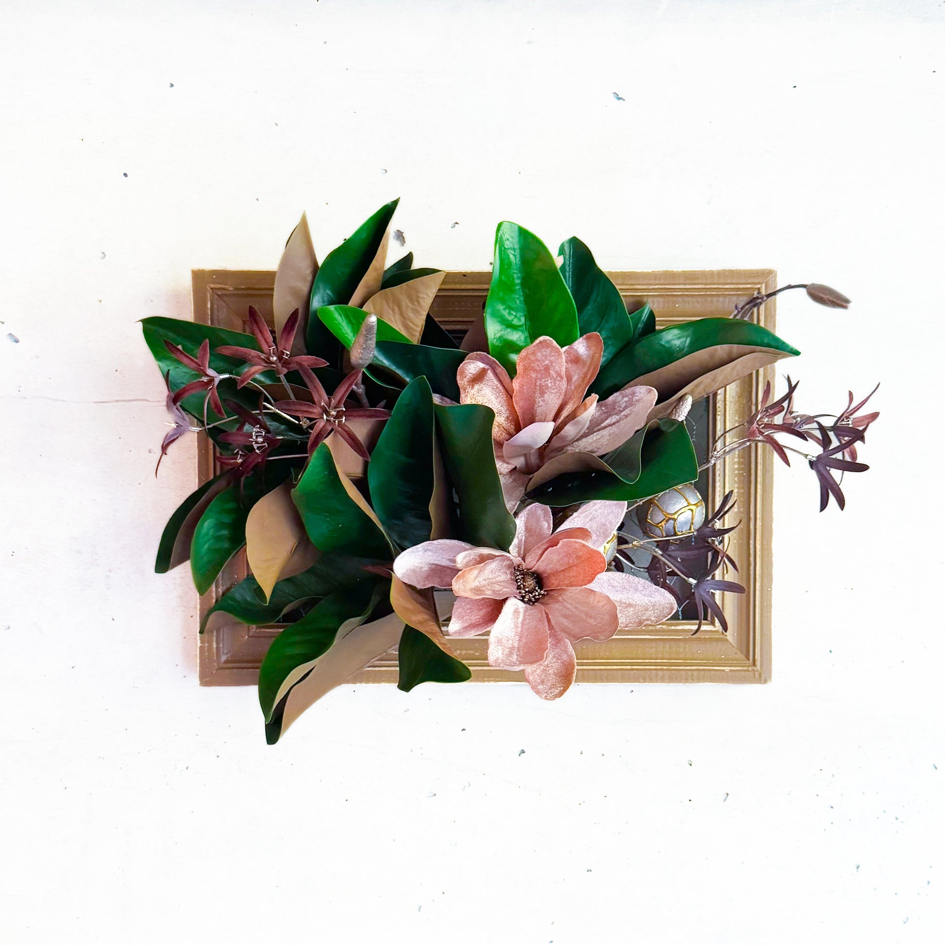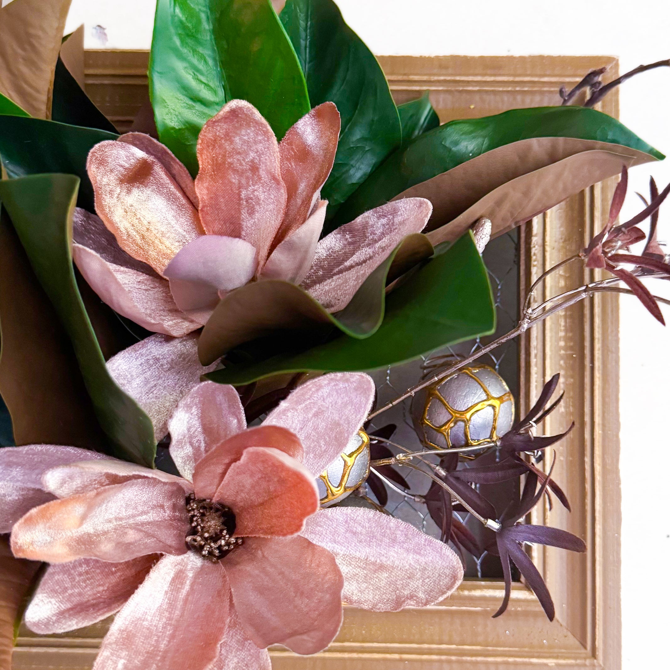 - 花材:マグノリアの花と葉、ブラウンリーフ ・その他:フレーム、網、オーナメント