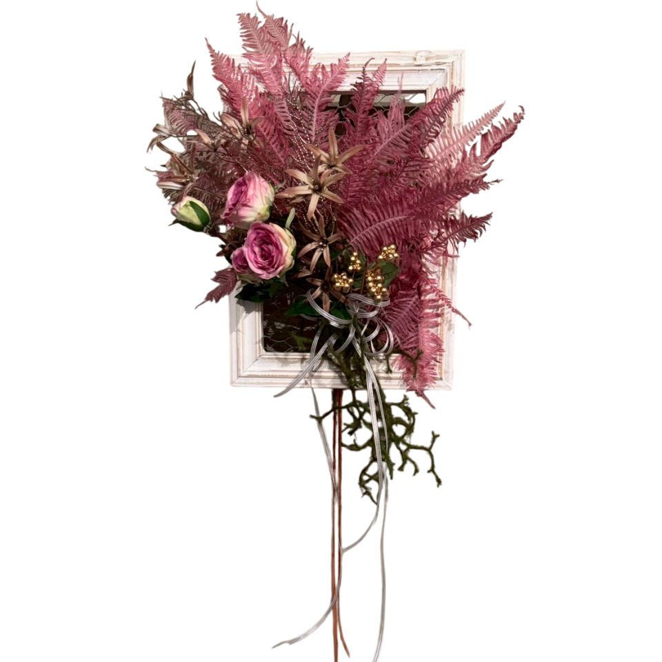 - 花材:ローズ、ピンクシダ、ヒカゲノカズラ、シダ ・その他:フレーム、網