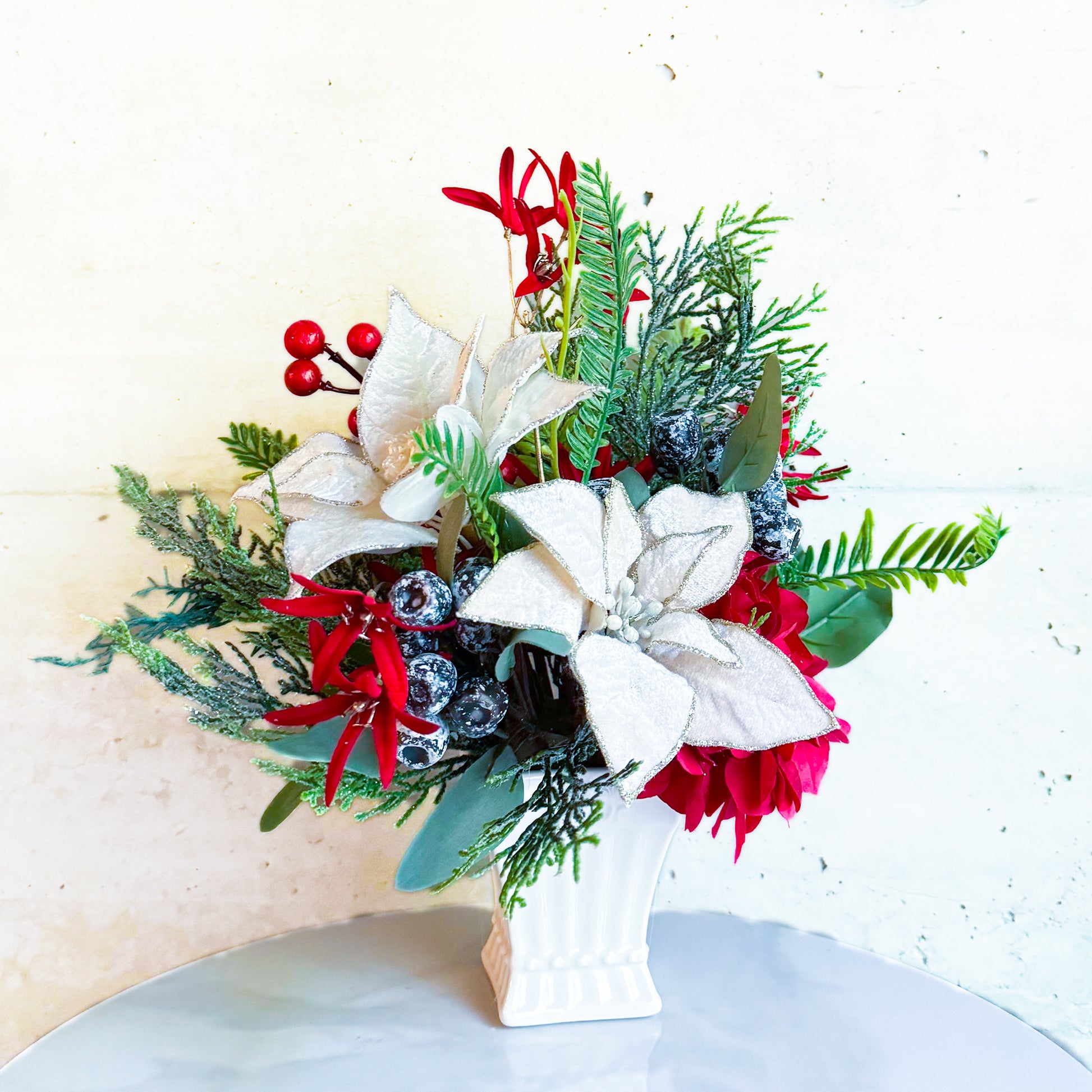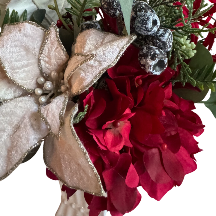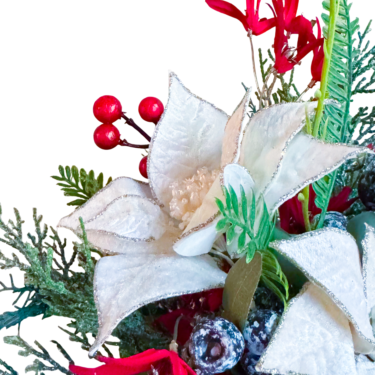 陶器のような質感を持つ高級感のあるプラスチックベースには、赤いアジサイをはじめ、縁にラメをあしらったホワイトポインセチア、華やかなレッドフラワー、ユーカリの実、ヒバ、ユーカリ、シダを贅沢にアレンジ。