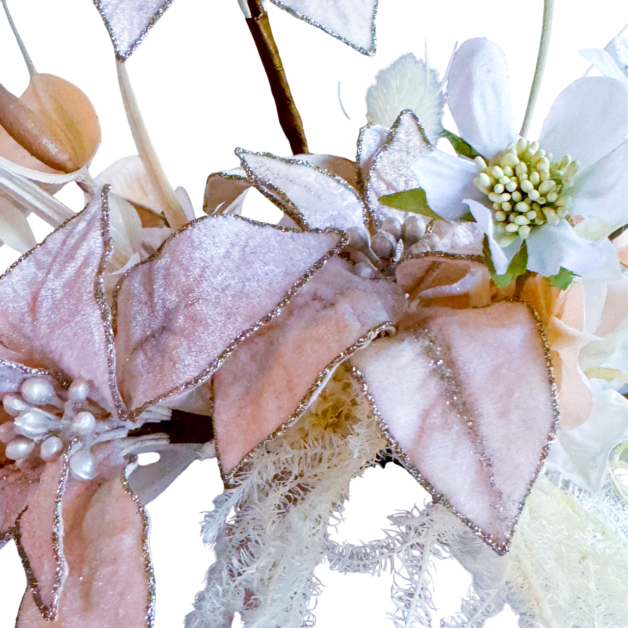 - 花材:ヒカゲノカズラ、ベージュのポインセチア、アンスリウム、ホワイトリーフ、ラスカスの葉 ・その他:花器
