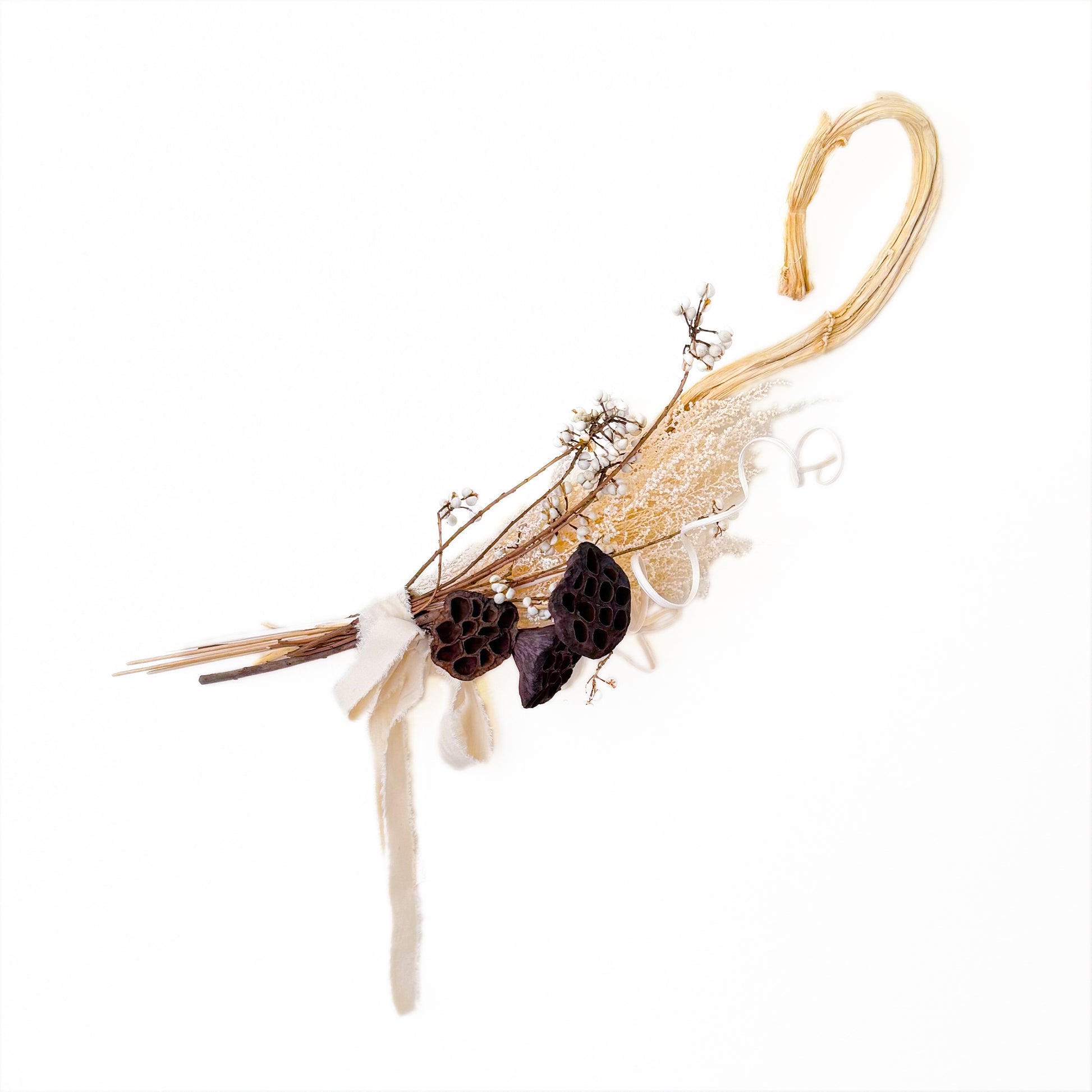 珍しいバナナスティックをメインに、蓮やナンキンハゼ、ドライフラワーのストーベ、ケイエイカールをコットンリボンで束ねた、おしゃれなデコレーションです。