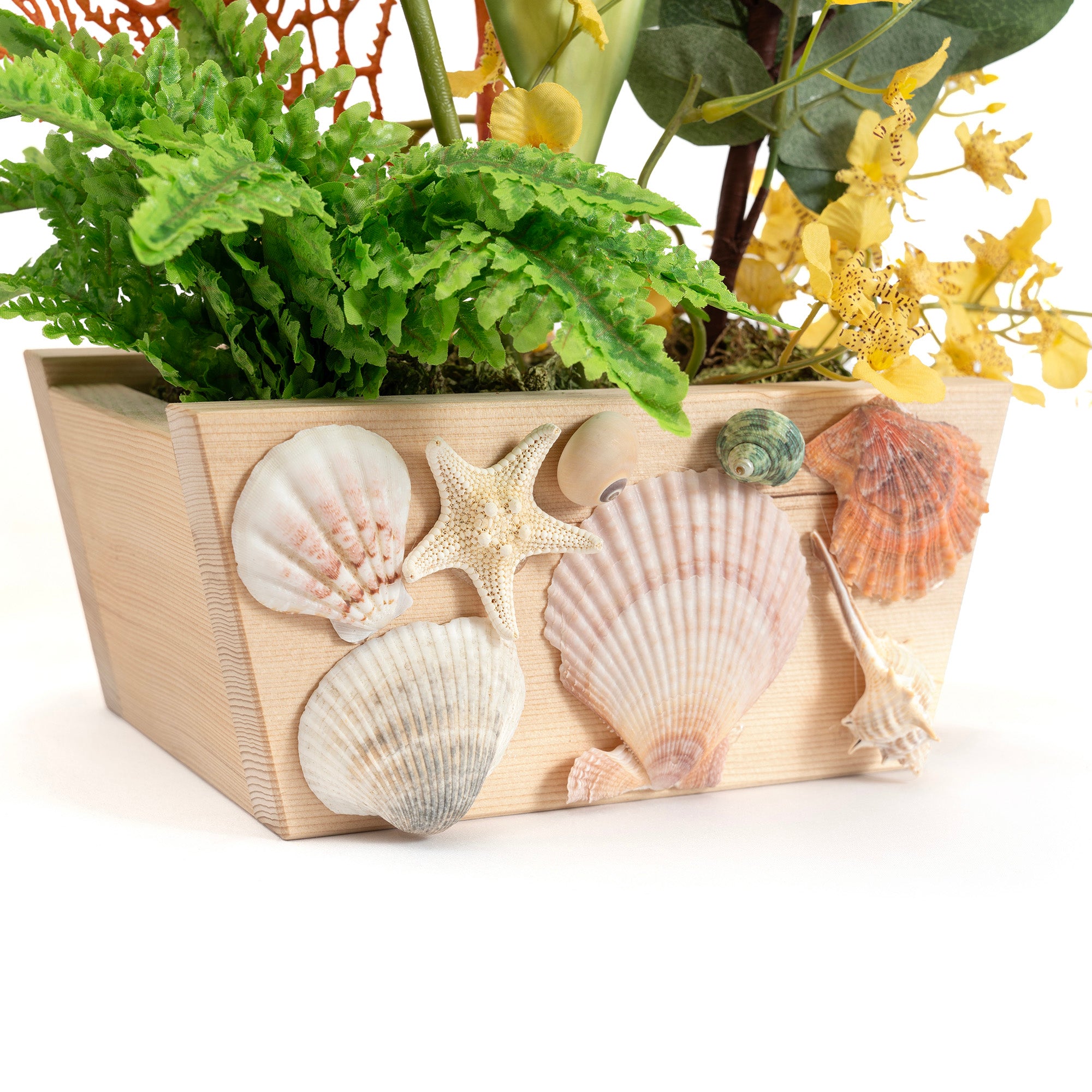 貝殻を散りばめたプランターにオレンジが眩しいサンゴ、インド及びマレー地方を原産とするマメ科の落葉樹であるレッドが鮮やかなデイゴ、華やかな黄色い花として知られるオンシジューム、オウムのくちばしのようなヘリコニア、玉シダがバランス良くデコレーションされた豪華なアレンジメント。置くだけで鮮明な色使い、珍しい植物の美しさに目が奪われる存在感のある一品なので、贈り物にも喜ばれそうです。お部屋のワンポイントに、開店祝いなどのお祝いにもおススメです。