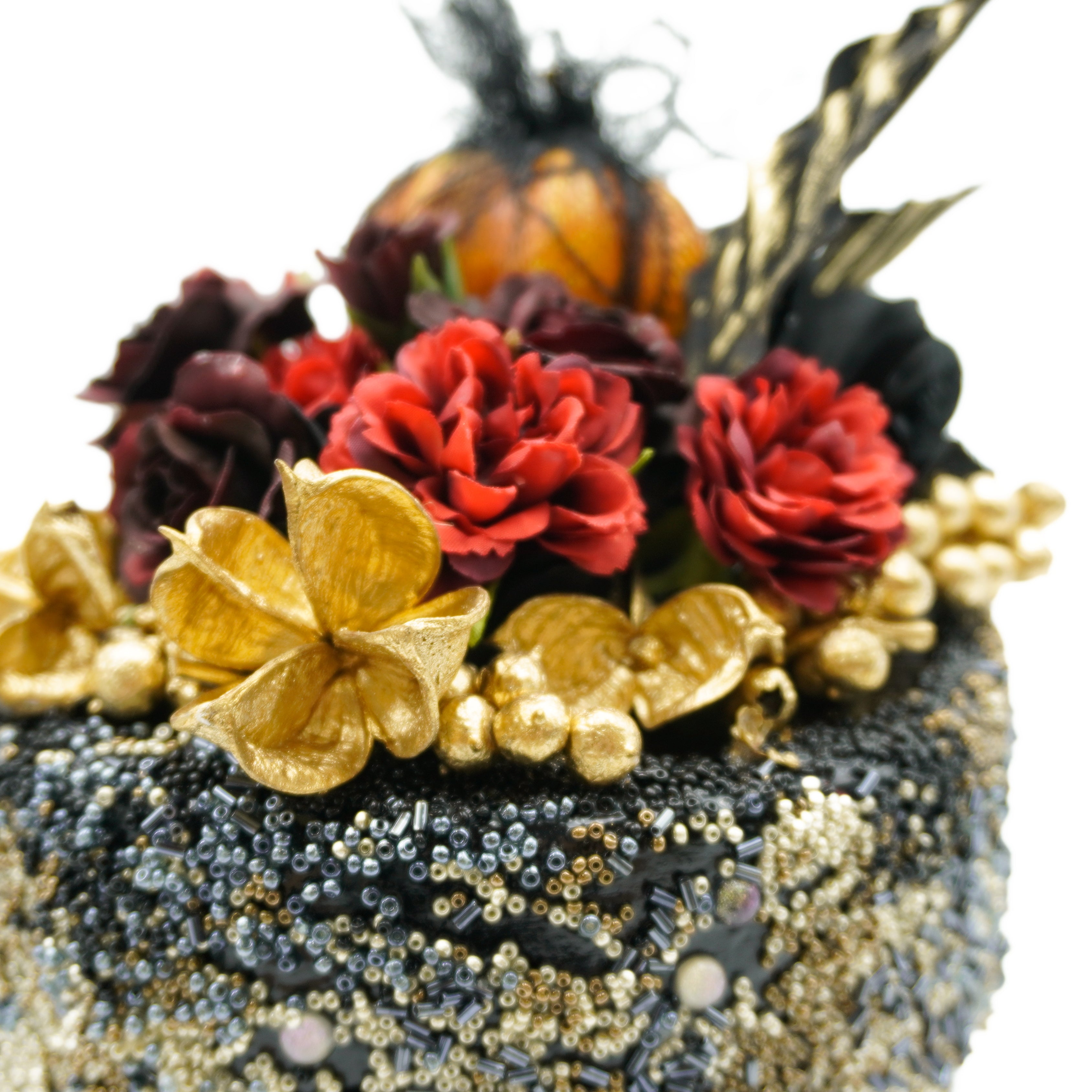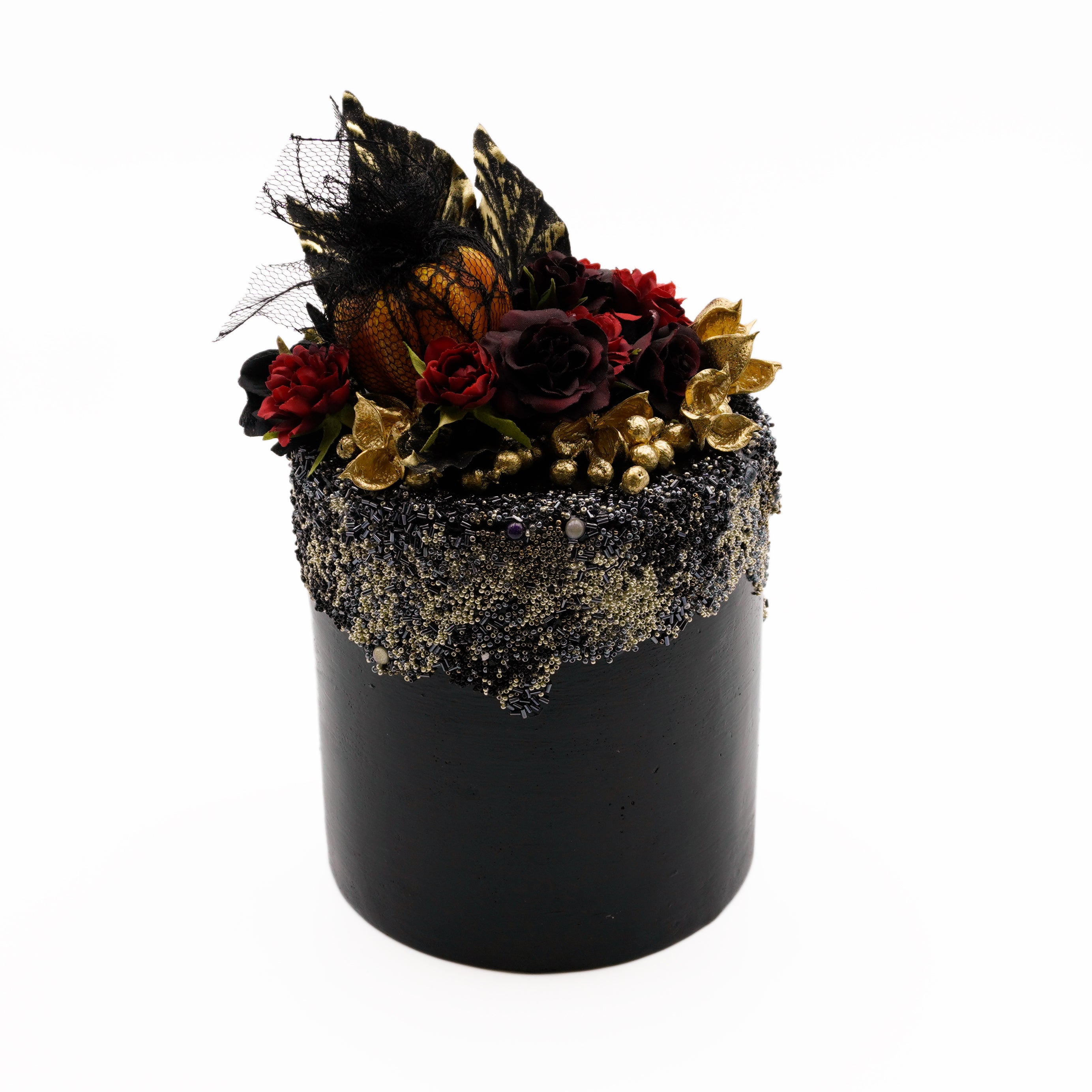高級感溢れるブラックなケーキをベースに美しいバラとアジサイの花やゴールドのドライパーツとリーフで彩られた、ダークな雰囲気漂うエレガントなクレイケーキ。おしゃれでゴージャスなデザインになっており、ひときわ目立つ一品なので、ハロウィンパーティーのデコレーションや撮影の風景に華やかさをプラスされたい時、特別なアイテムをお探しの際におすすめです。<注:この商品は食べられません><注:ドライフラワーは乾燥しているため、散りやすいものや壊れやすい場合がございます。繊細な商品なため飾る場所や季節等により、ご購入後の色の変化や劣化具合は異なります。>
