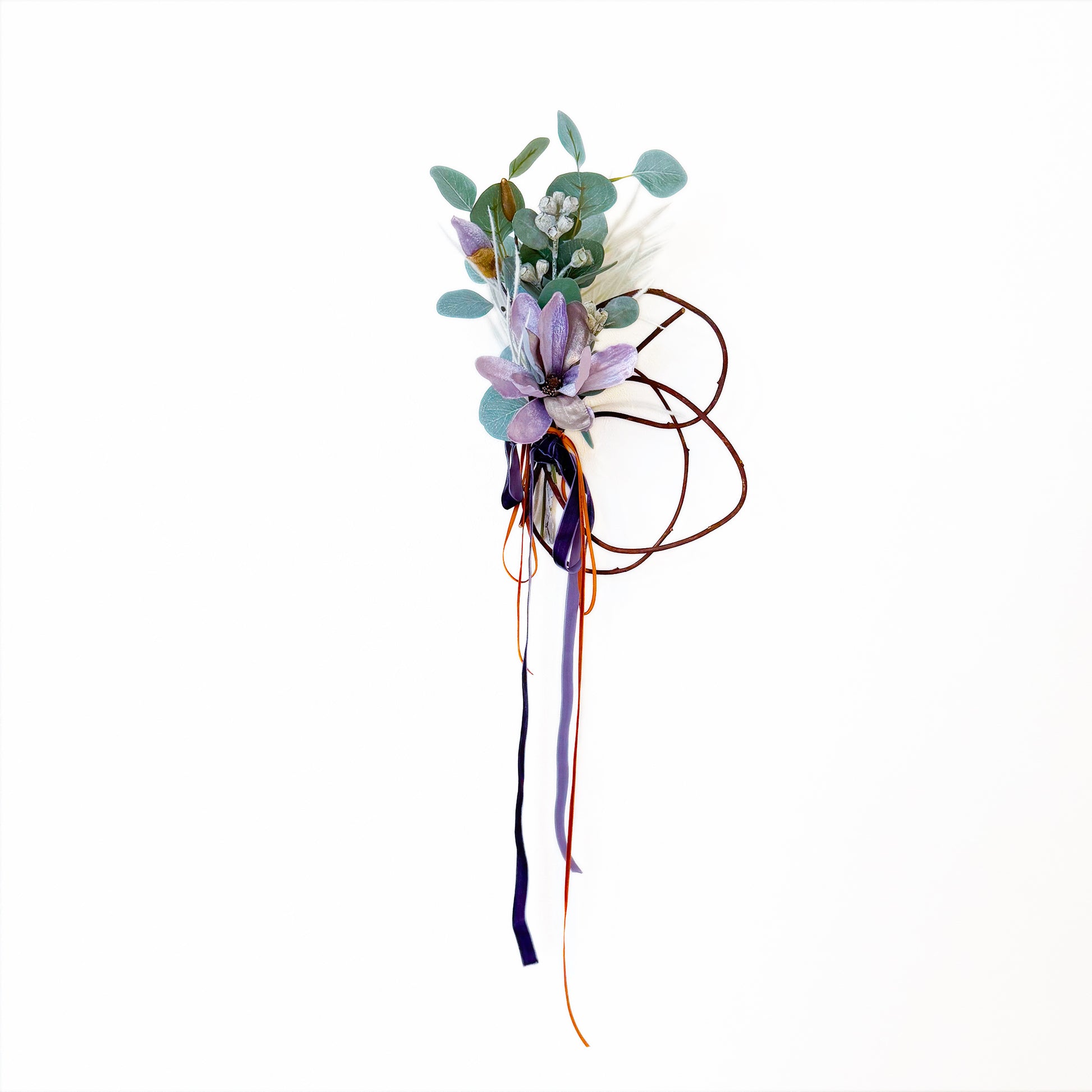 パープル、オレンジのベルベットリボン、枝のアレンジメント、清楚なパープルのモクレンが一際目を引くスワッグ。ユーカリの葉がナチュラルな印象なので、様々な空間に馴染みます。