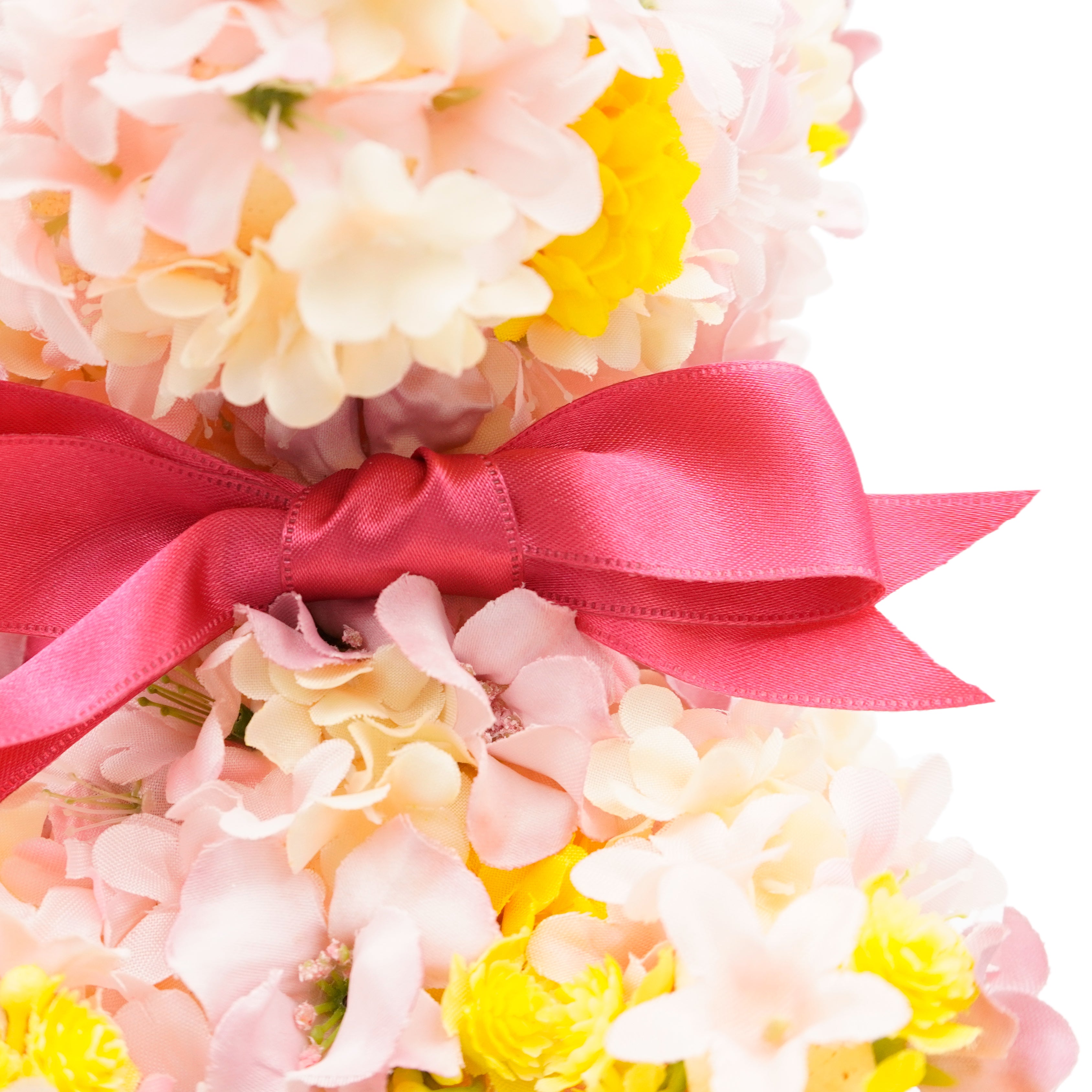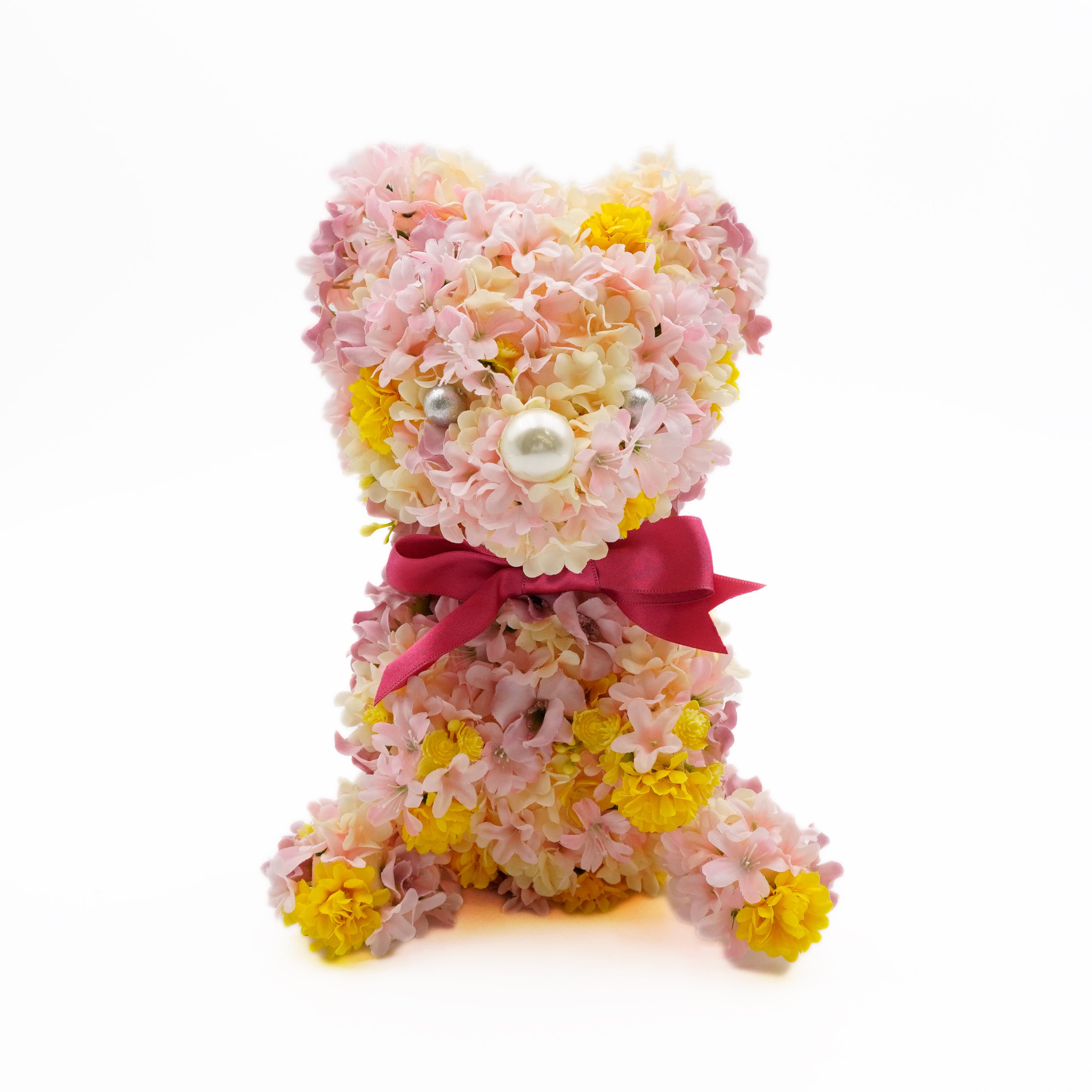 ピンクやイエローを基調としたお花でデコレーションされたベアのオブジェはプレゼントに最適なアイテム。世界中で様々なキャラクターとして愛されているクマを熟練の造形職人がスチロールを削って制作し、手作業でアーティフィシャルフラワーをアレンジ。大きな球形に集まった小さなスノーボールの花、穂のようになって咲く姿がとても印象的なライラック、ブロッサムにフェイクパールやリボンが可憐かつ、ラグジュアリーです。子犬程の大きさなので、玄関やウェルカムスペースなどに飾るだけで、場が華やぐでしょう。