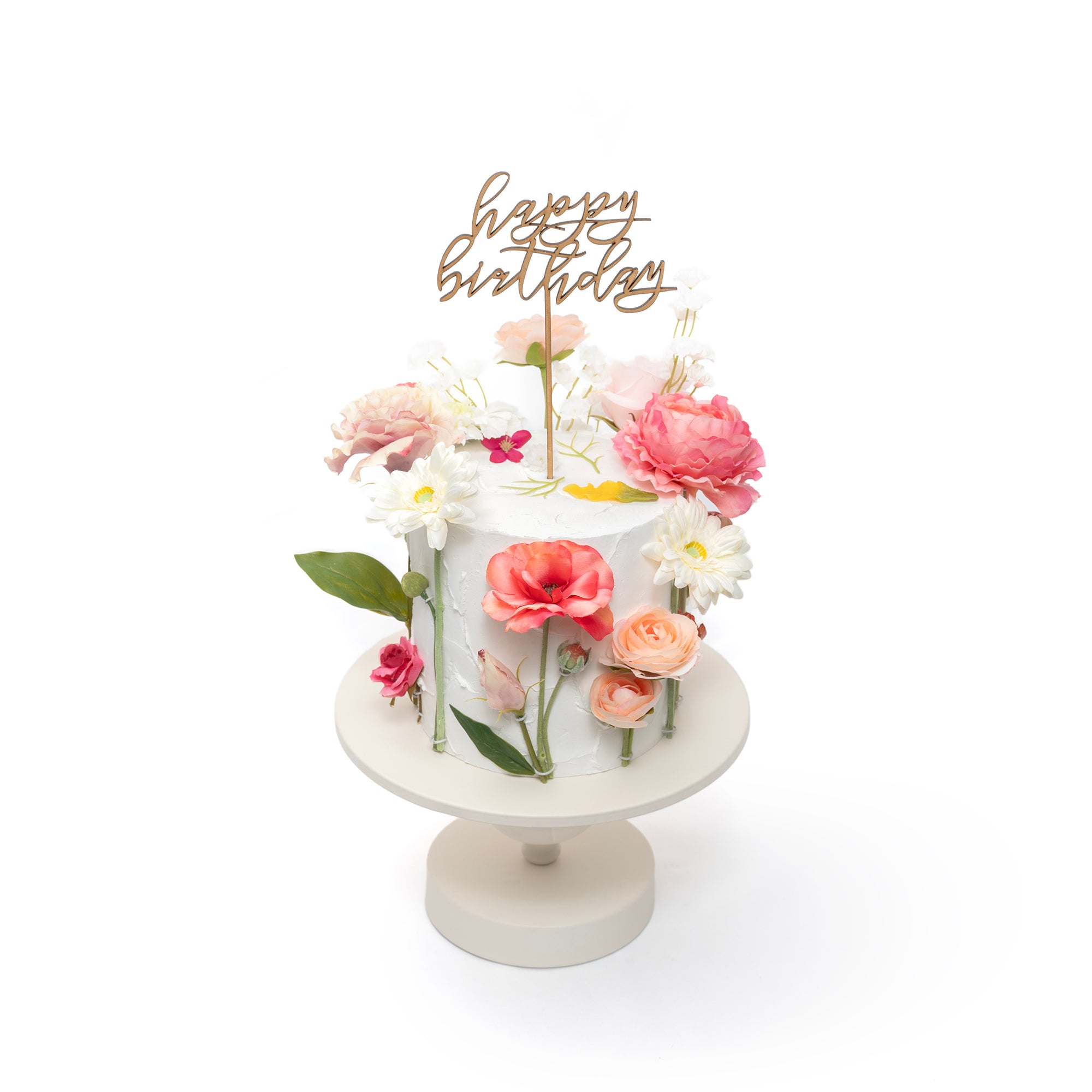 ガーベラ、ラナンキュラス、スカビオサ、バラ、ポピー、アネモネなど華やかな花々がホワイトベースのケーキの周囲をファッショナブルに彩るゴージャスなクレイケーキです。ケーキ中央にお誕生日のピックを差せば、バースデーパーティの主役に。ピックを使用せず、ウェディングパーティーや様々なお祝いシーンのデコレーションや撮影小物として場を華やかに装うのもおすすめです。<注:ケーキ台、ケーキトッパーは付属しません。(別売り可能)この商品は食べられません。ケーキ裏面に製造工程で生じる小さな穴が開いている場合がございますが、返品交換対象外となります>
