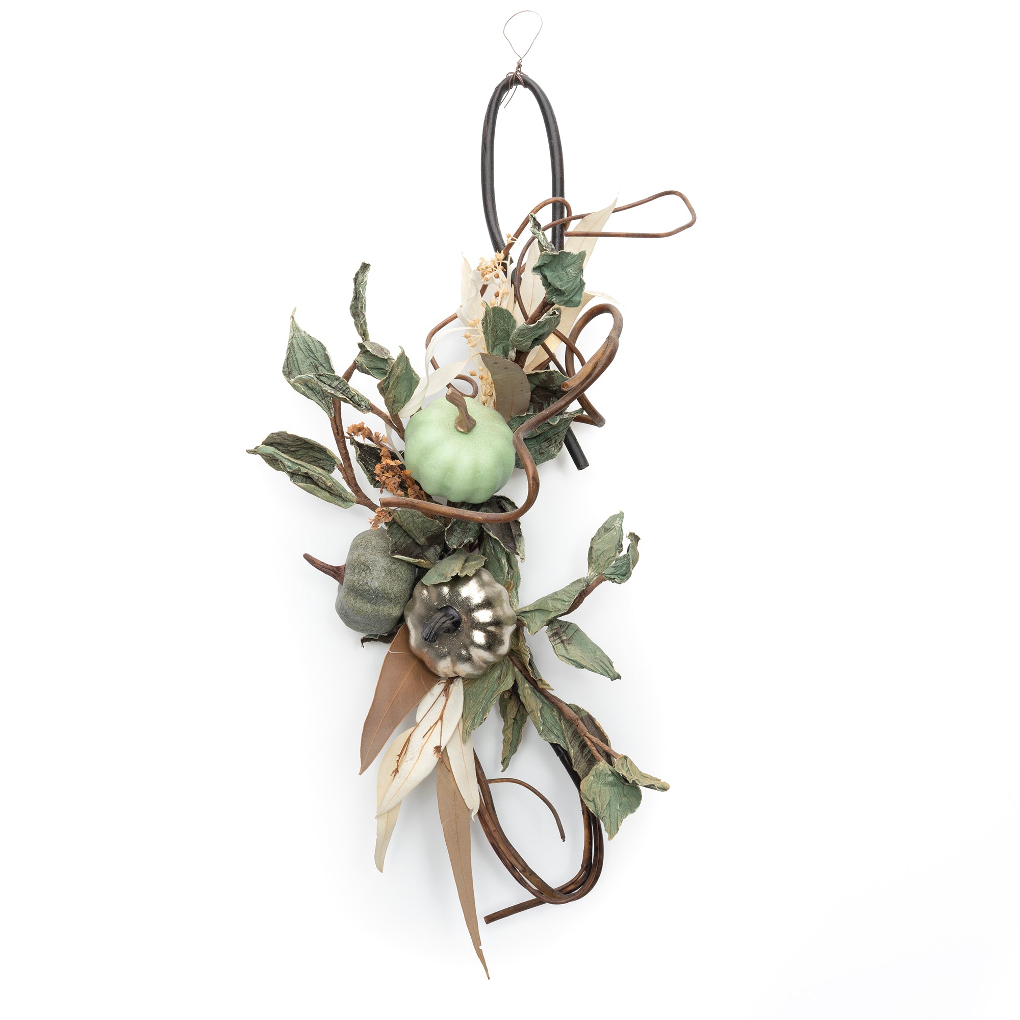 グリーンパンプキンをメインにナチュラルかつシックさを醸し出すモダンなアレンジメントです。カラフルな空間が苦手な方や、落ち着いた装飾をお探しの方におすすめです。シンプルの中にもインテリアとしてファッショナブルな印象を与える秀逸なアイテムです。老若男女問わず使いやすいため、プレゼントにも。仕様(サイズ、重さ、素材)