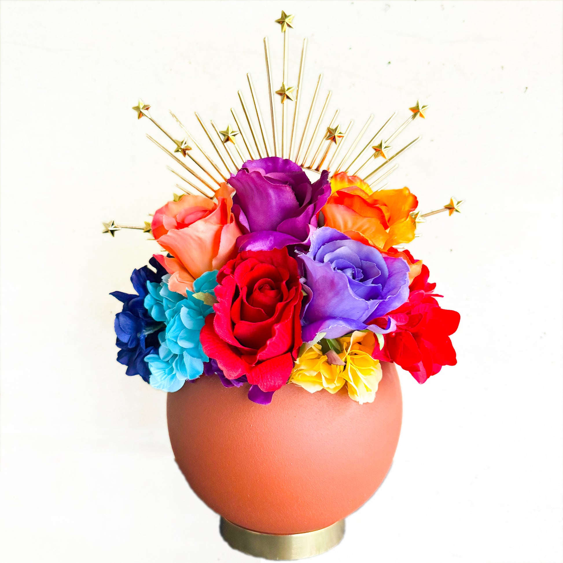 テラコッタカラーの丸みを帯びたベースは、温かみとモダンな雰囲気を兼ね備え、ゴールドのスターオーナメントが祝祭のきらめきを添えます。