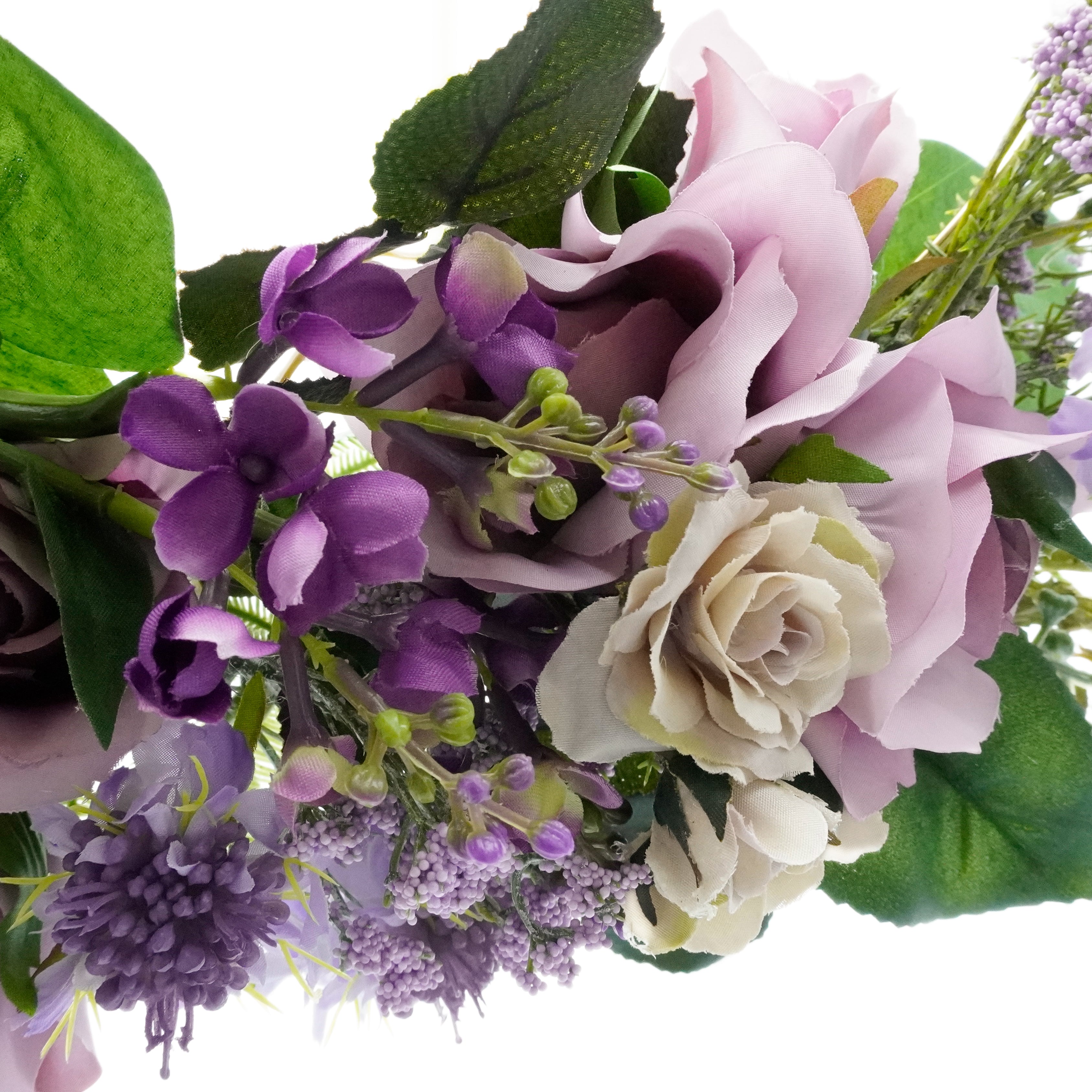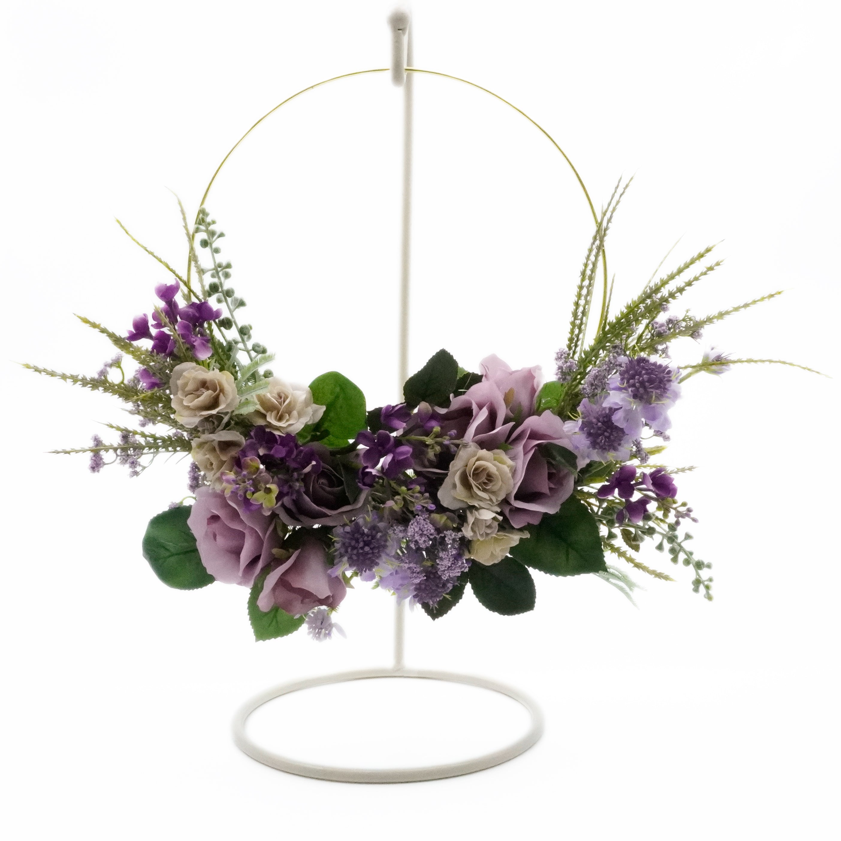 この愛らしいフープブーケは、輪っかの形から「永遠」を意味し、縁起のいい形をしております。ローズ、スカビオサやアカシアベリーを使用した淡いパープルの色合いは、やわらかくロマンティックな雰囲気を演出できます。