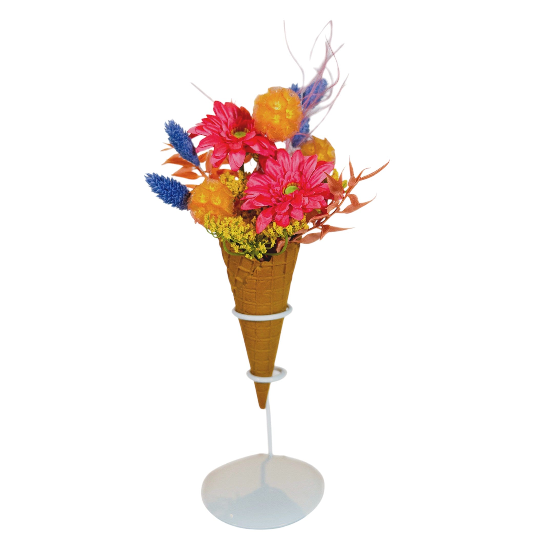 まるでアイスクリームのような可愛らしさ。ワッフルコーンに入ったアーティフィシャルフラワーのブーケは、見た目のインパクトも抜群。付属のカップホルダーを使えば、玄関やカウンター、デスクの上などにそのまま飾れます。ブーケ部分だけを取り外して、お気に入りの花器に移すことも可能。渡しやすく飾りやすい、自由にアレンジできるおしゃれなアイテムです。