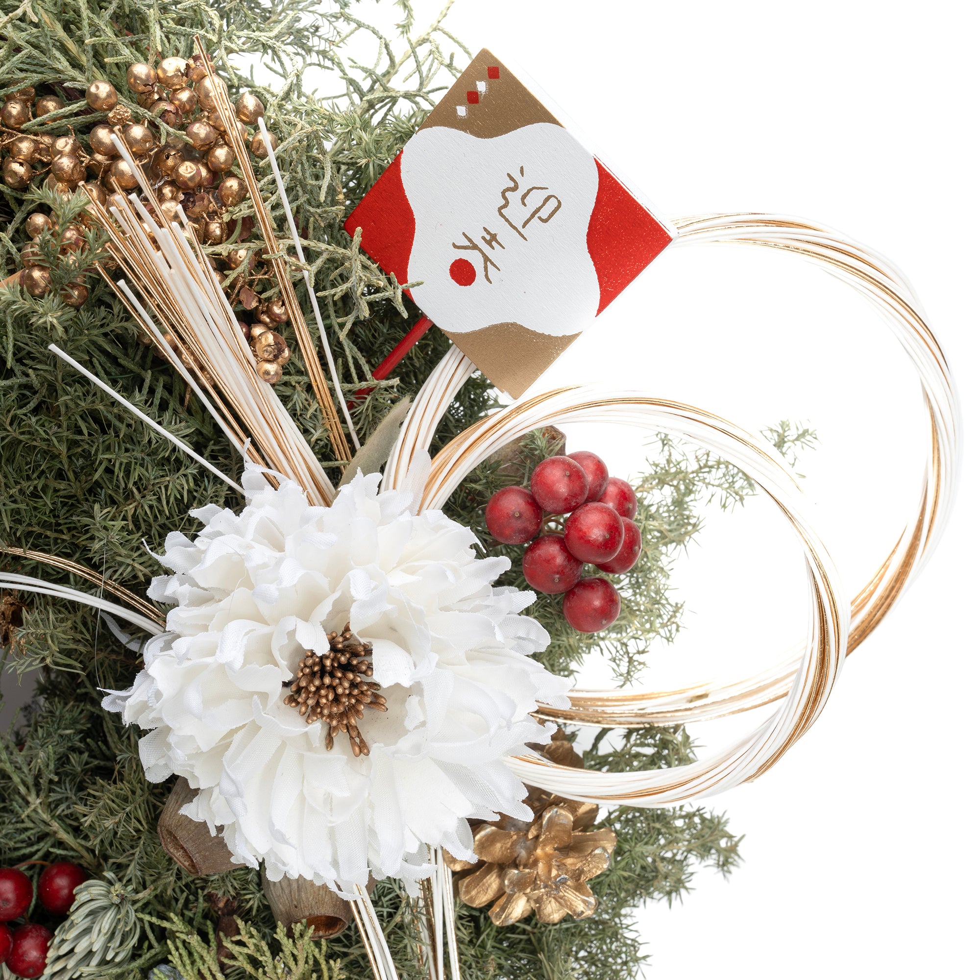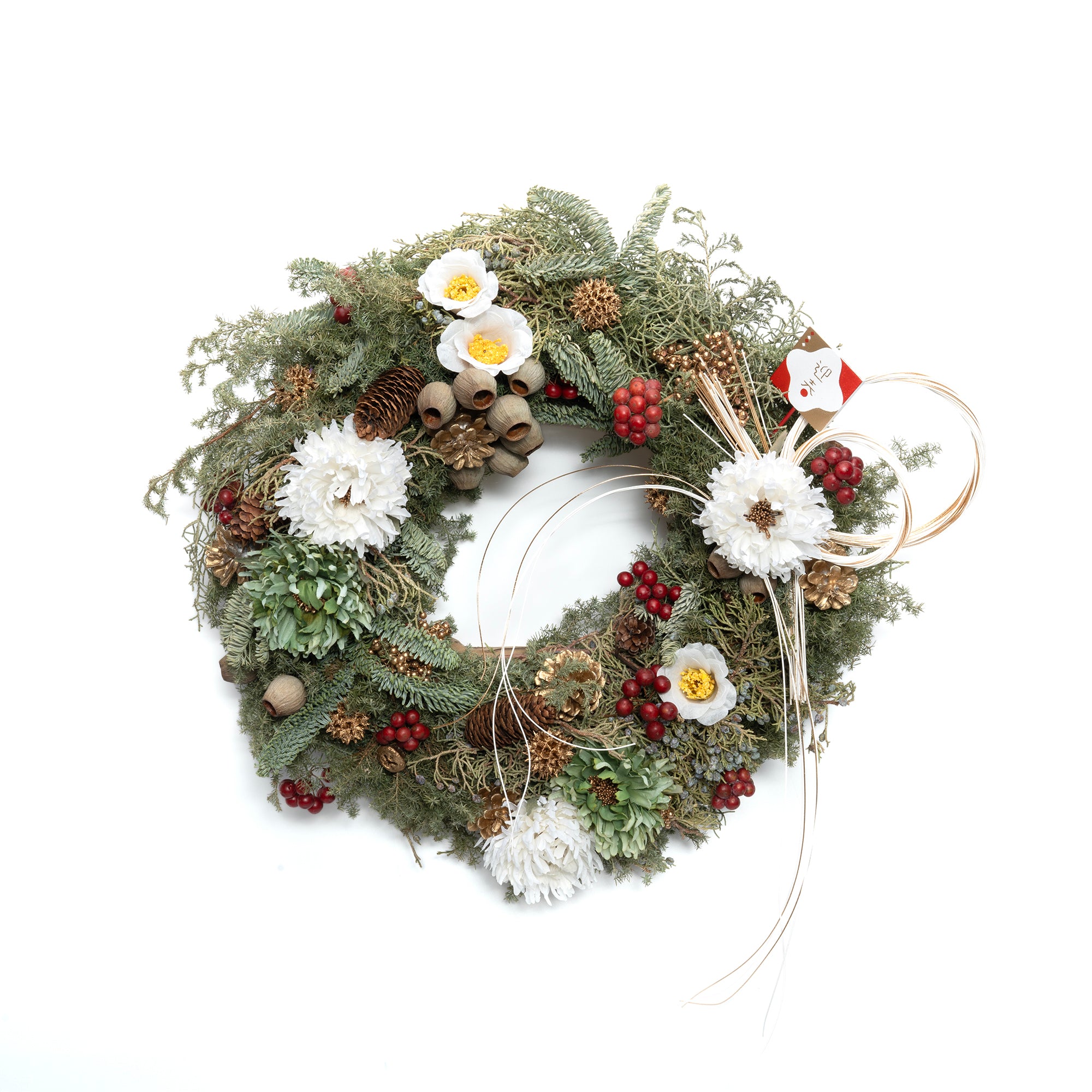 神様をお迎えするのに相応しい和リース。ドライフラワーで作られナチュラルで柔らかな印象を与え、あらゆる空間に馴染みそうな万能なアレンジメントです。福に満ちた新年を迎えるべく、「魔よけ」や「人との縁」の意味を込めた水引、花言葉が不老長寿と言われる松ぼっくり、縁起のよい紅白の椿と菊がモダンの中にたおやかに和を感じさせます。神様をお迎えし、福を呼び込みたい皆様におススメしたい飾りです。