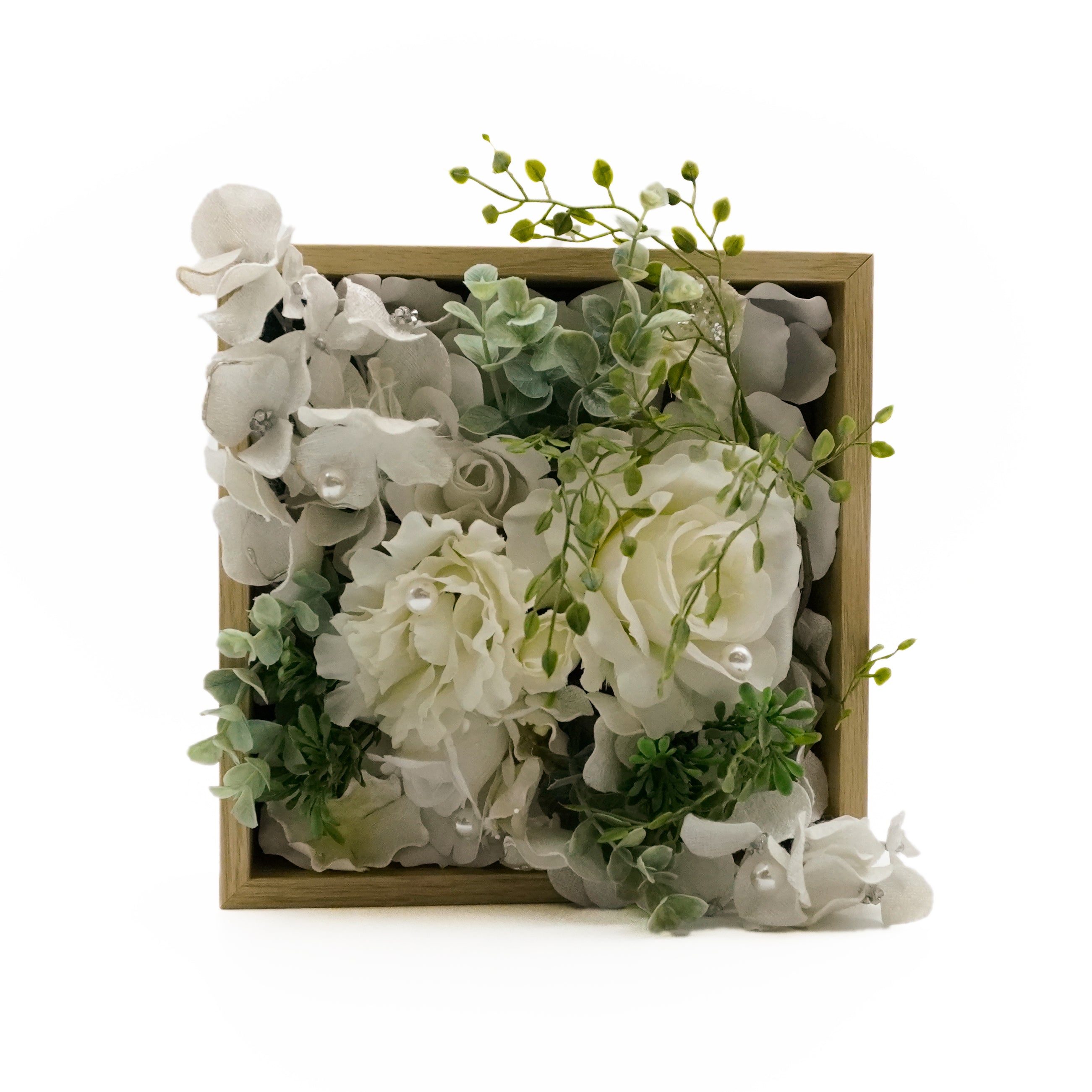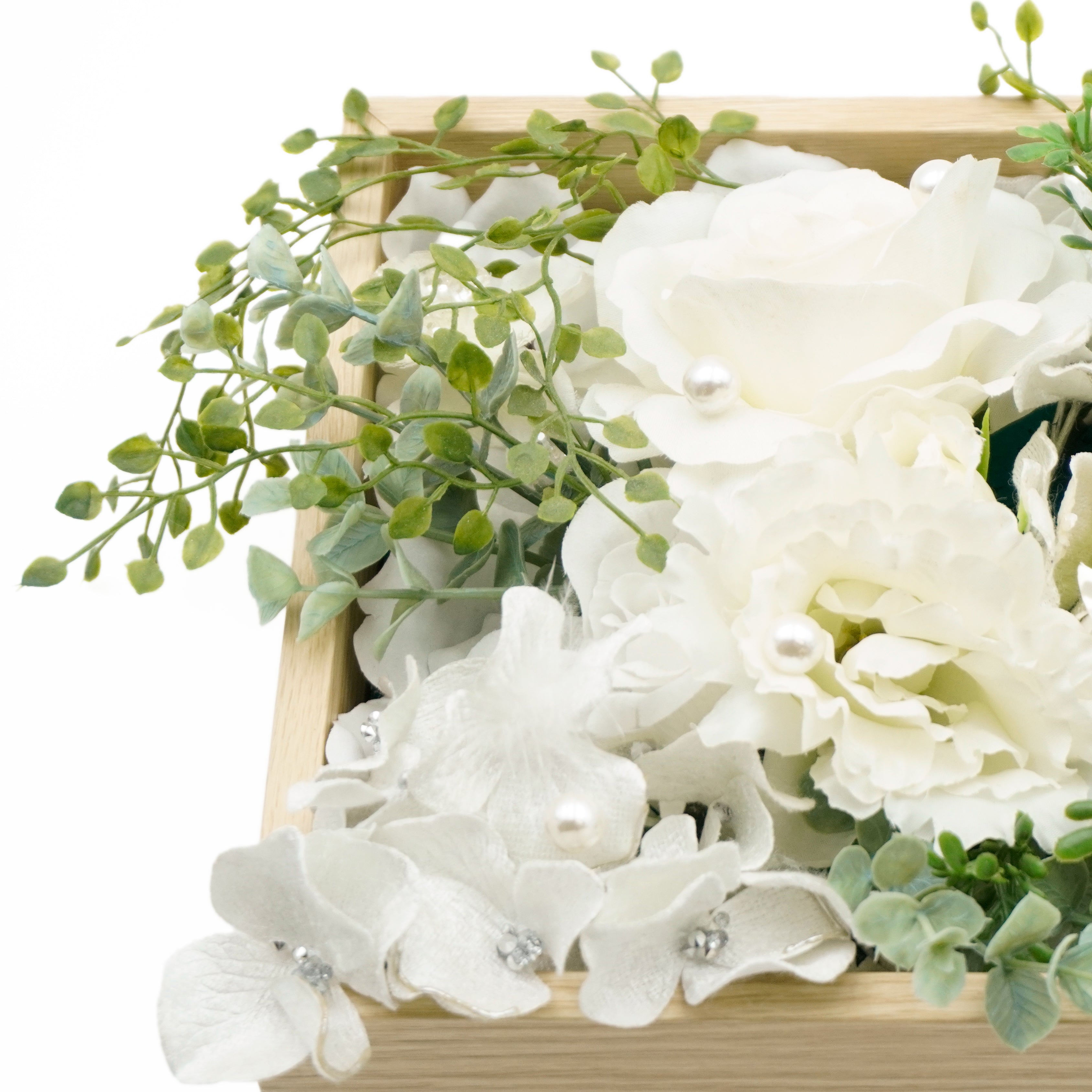 真っ白なウェディングドレスに身を包む花嫁さんをイメージし、ところどころにパールやラメをちりばめたボックスフラワーです。