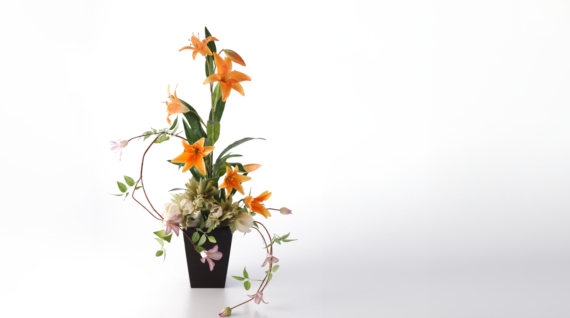 エレガントでたおやかな印象を受ける百合や芍薬(シャクヤク)のアレンジメントです。和紙造花にしか出せない凛とした、空間を引き締める厳かな佇まいのおかげで、置くだけで高級感が漂います。花言葉が「華麗」であるオレンジの百合はとても華やかです。また芍薬、テッセンのツルの動きや木蓮の咲き乱れる様は「立てば芍薬座れば牡丹歩く姿は百合の花」の言葉のように、所作の美しさを感じさせます。プレゼントとしても、ご自宅で愛でるアーティシャルフラワーとしても素敵です。