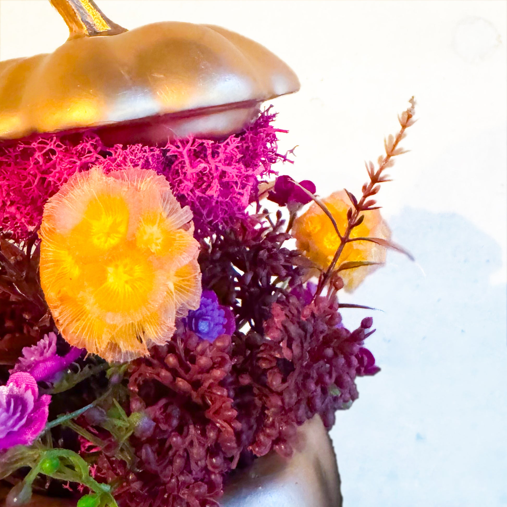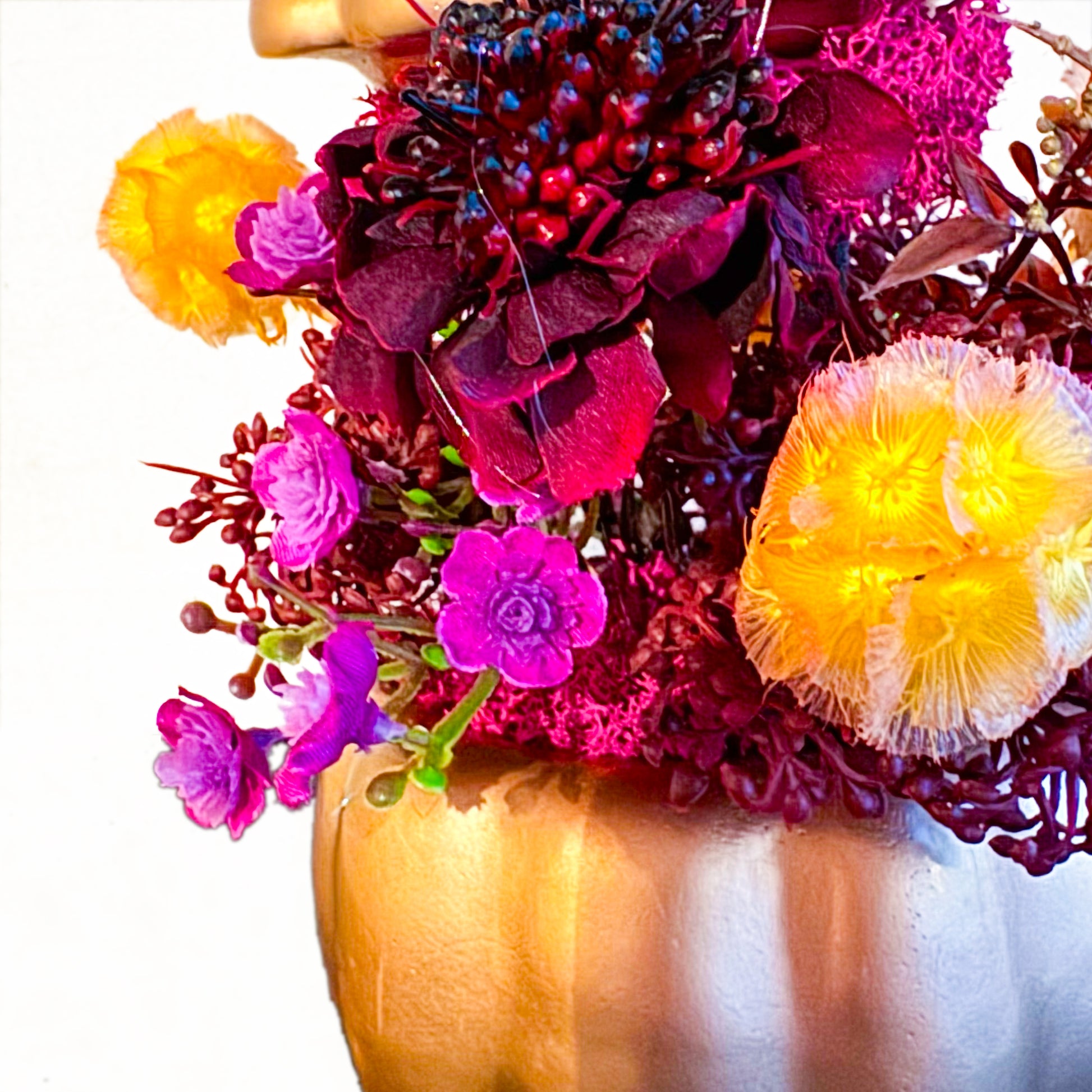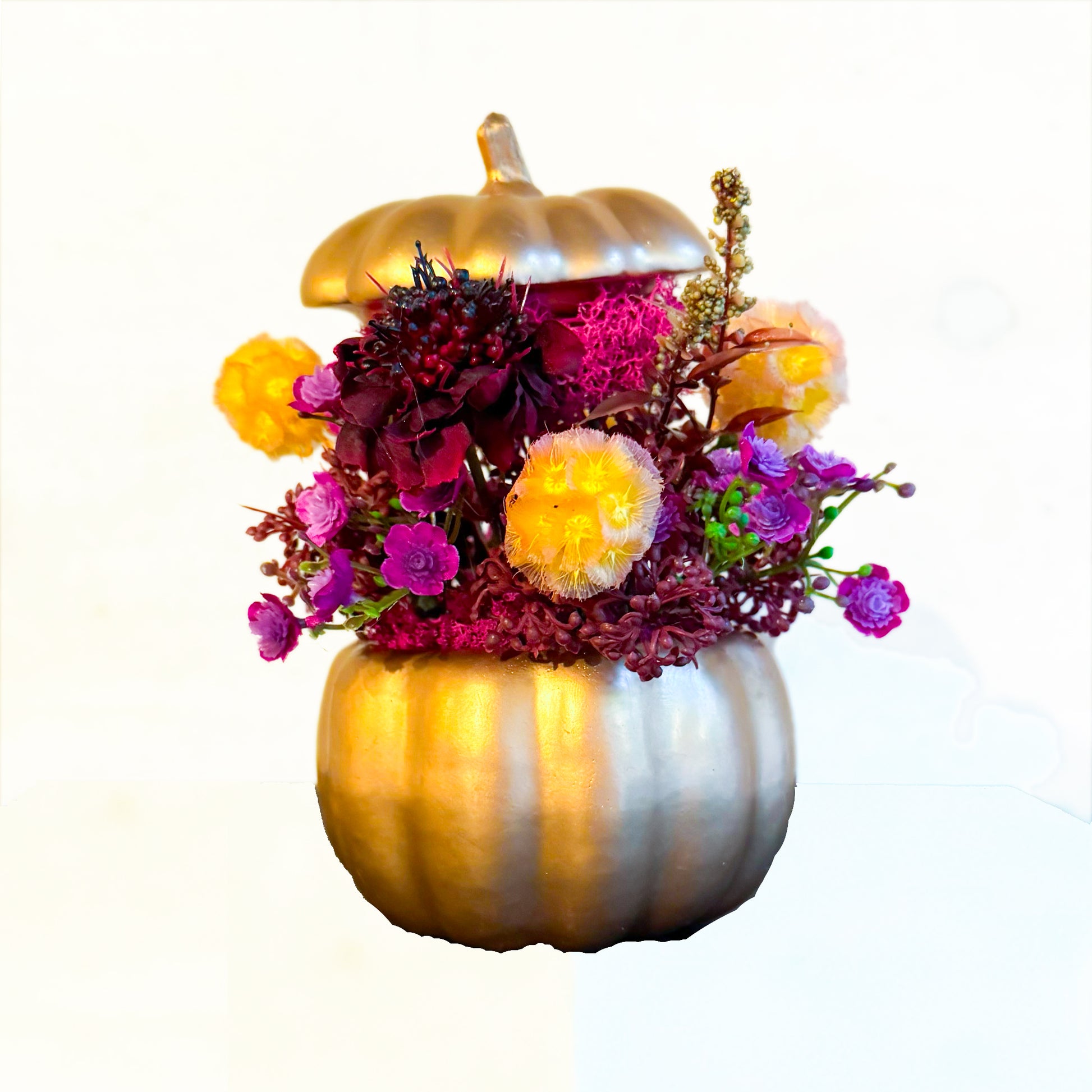 ゴールドに輝くパンプキンベースに、深みのあるバーガンディや鮮やかなパープル、柔らかなイエローの花々をアレンジ。