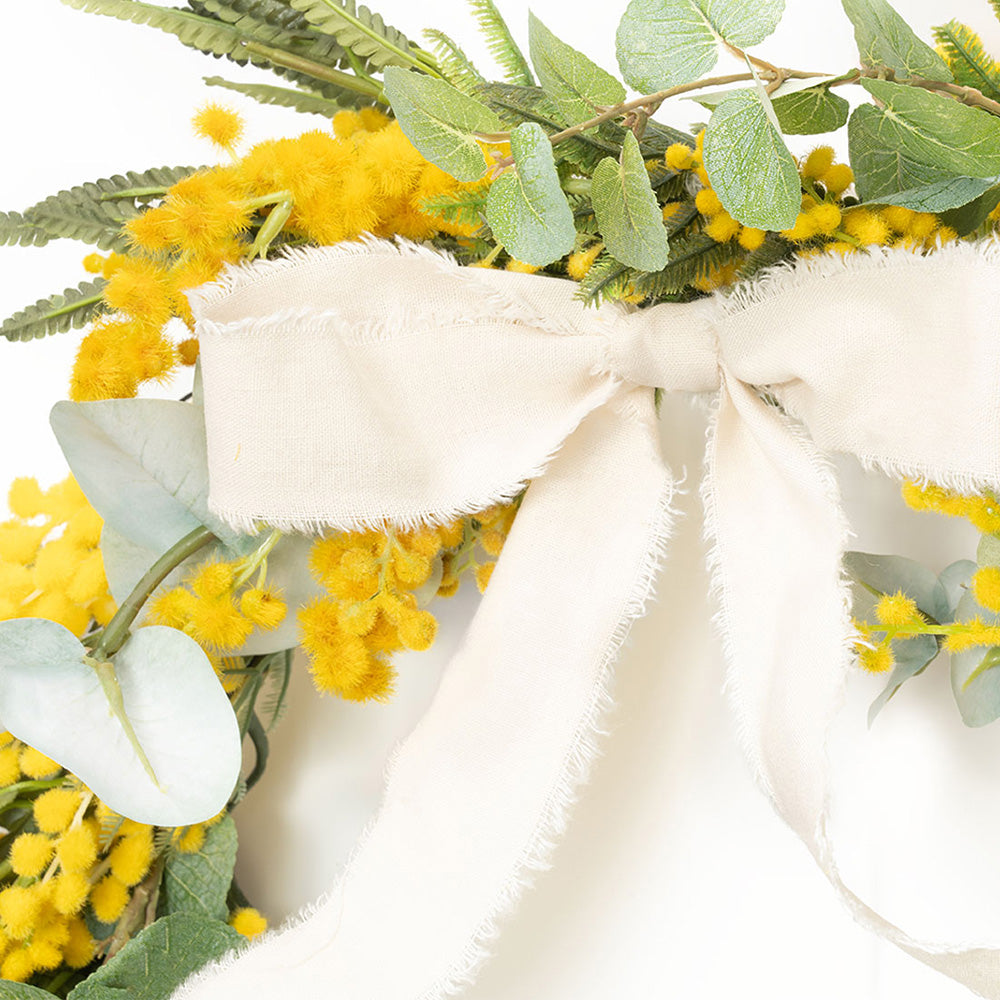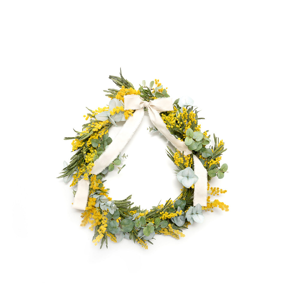 ミモザの花言葉は「感謝」。イタリアでは3月8日に男性から女性へ、感謝の気持ちをこめて、ミモザの花をプレゼントする文化があるそうです。感謝を伝えたい方への贈り物に最適ですね。またユーカリは「永遠の幸せ」を意味するので、結婚祝いのプレゼントにも。尚、玄関にリースを掛ける事に「魔除け」の意味があるため、新築祝いや引っ越し祝いにもおすすめです。