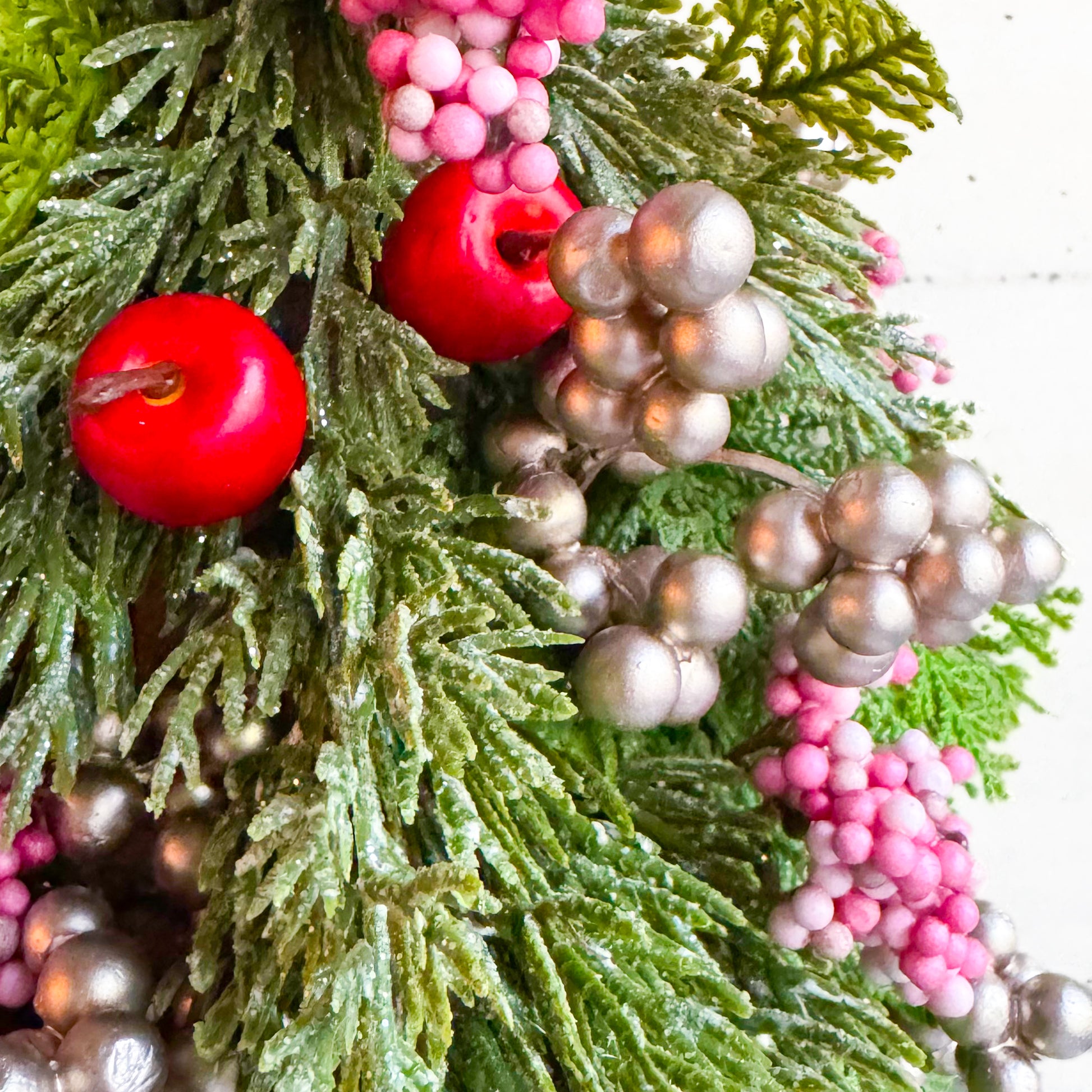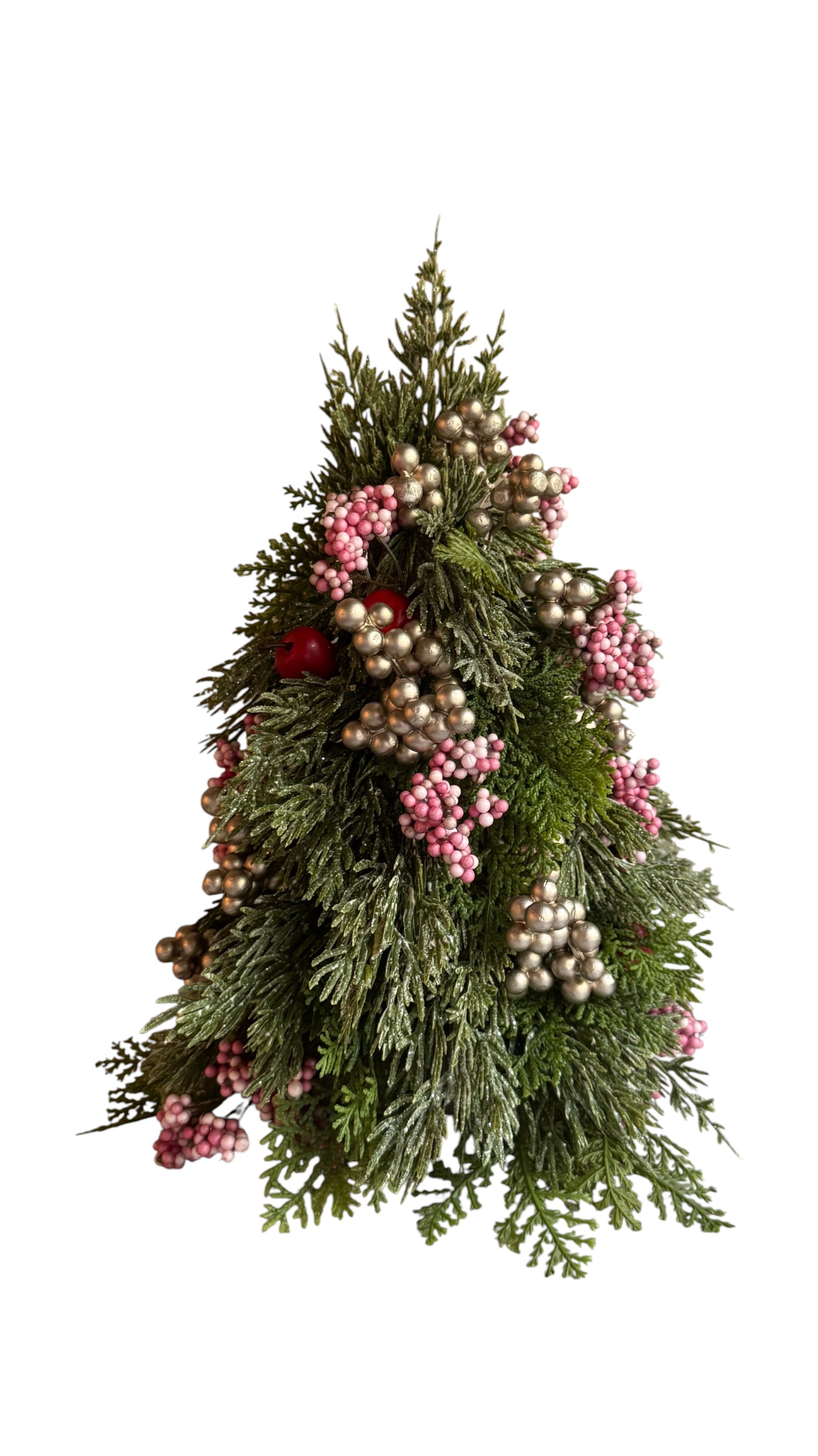 ヒバ、シダ、サイプレスをベースに、ピンクペッパーベリーやゴールドベリーをあしらい、アクセントにアップルをプラス。ピンクを基調としたふんわりとしたフォルムが愛らしく、思わず心惹かれるミニツリーです。