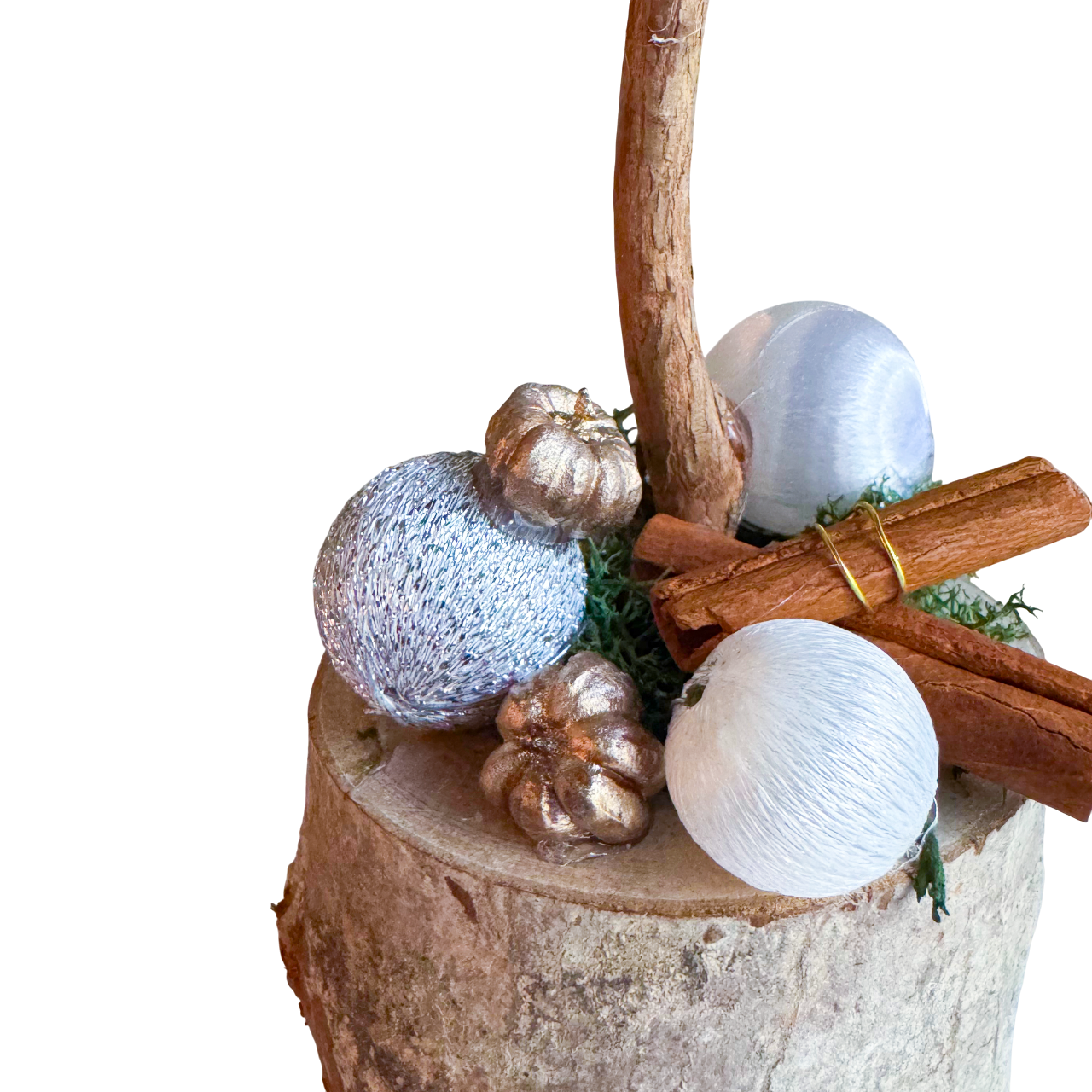 - 花材:ミニカボチャ、モス ・その他:花器(丸太の木)、ミニライト風オーナメント、オーナメント、星のオーナメント