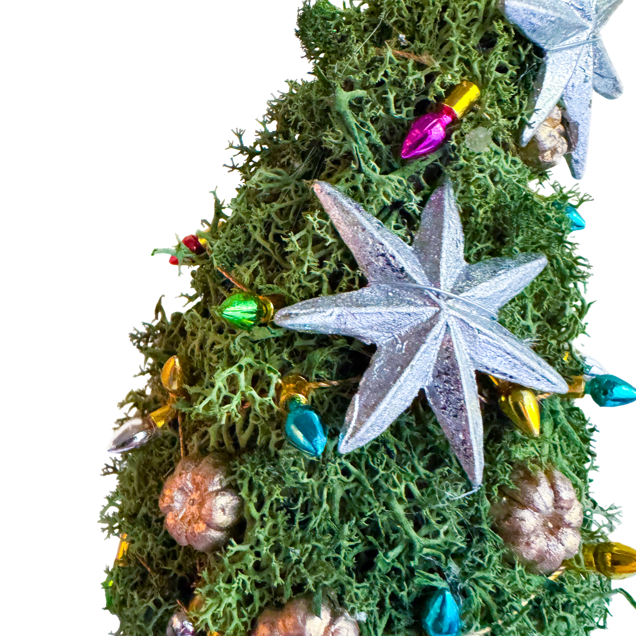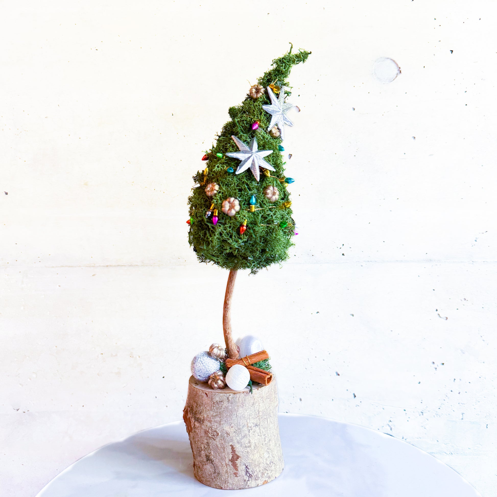 まるでおとぎの国の妖精や小人が遊びに来たかのような、キュートで夢のあるミニツリー。ミニチュアのイルミネーションオーナメントがモスを優しく包み込み、丸太のようなベースにはミニカボチャやシルバー、ゴールドのオーナメントが華やかに飾られています。
