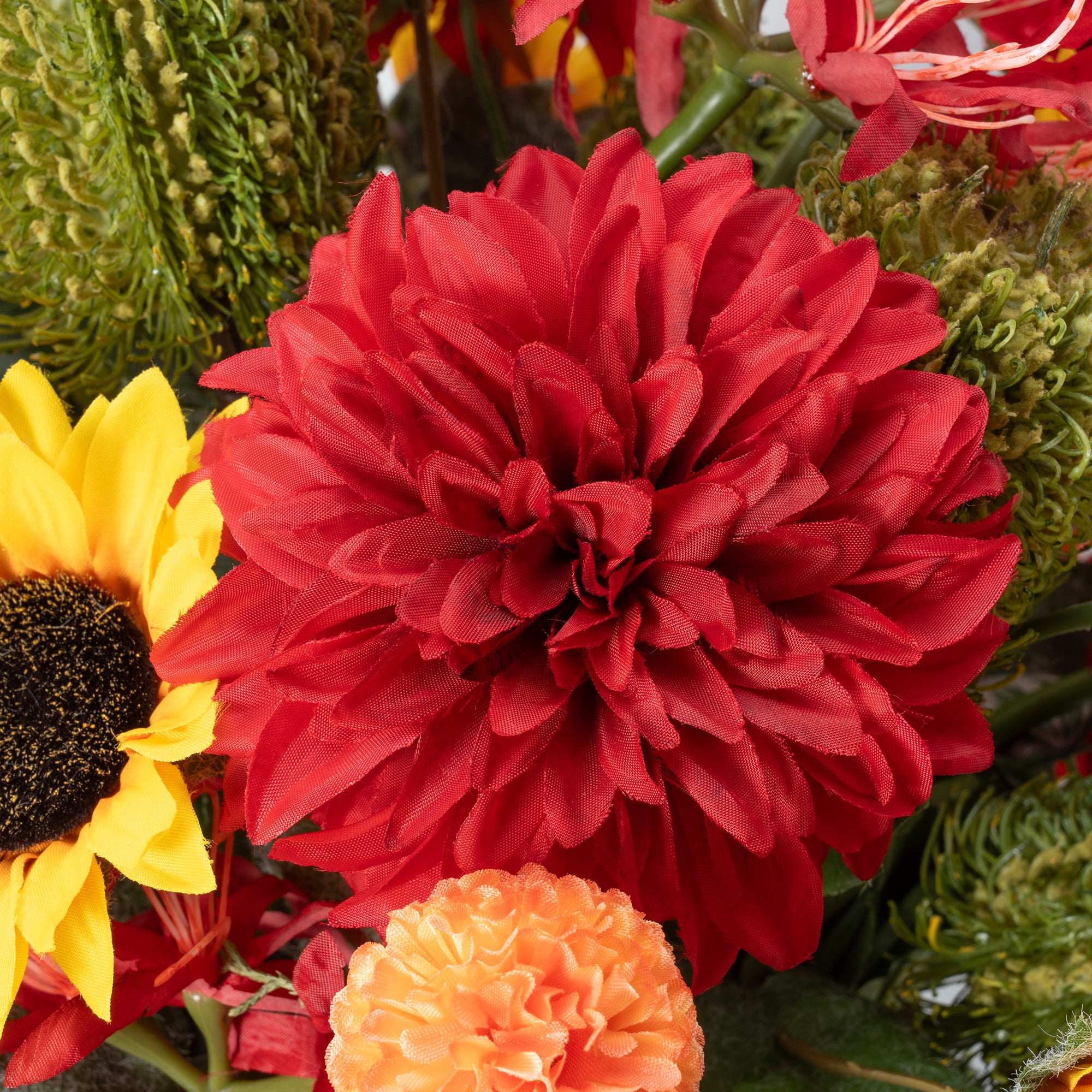 鮮やかなのに、どこか大人な雰囲気を漂わせるミステリアスなアレンジメント。花言葉は見たままの印象でもある「高貴」であるマム、「輝くほどの美しさ」のアマリリス、「華麗」なダリア。すべてが美しいに辿り着く豪華な花達に、ブラシのようなユニークな花、バンクシアや愛らしい向日葵が華やかに詰まっています。そこにあるだけで、輝きが増すかのようなアイテムは玄関など人目に付きやすい空間や、彩りを添えたい場所に。