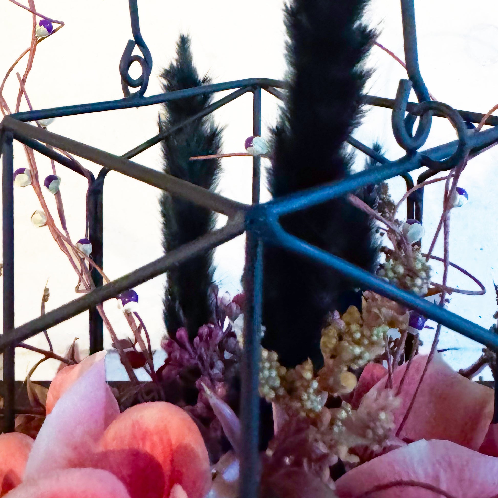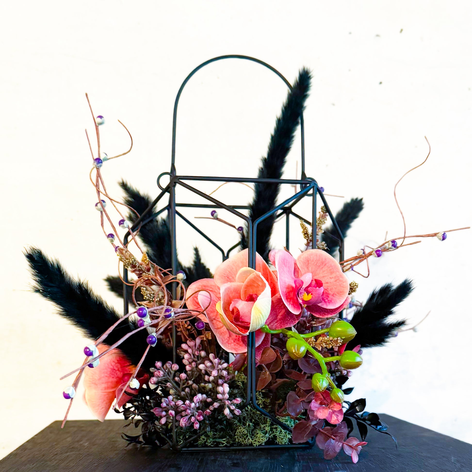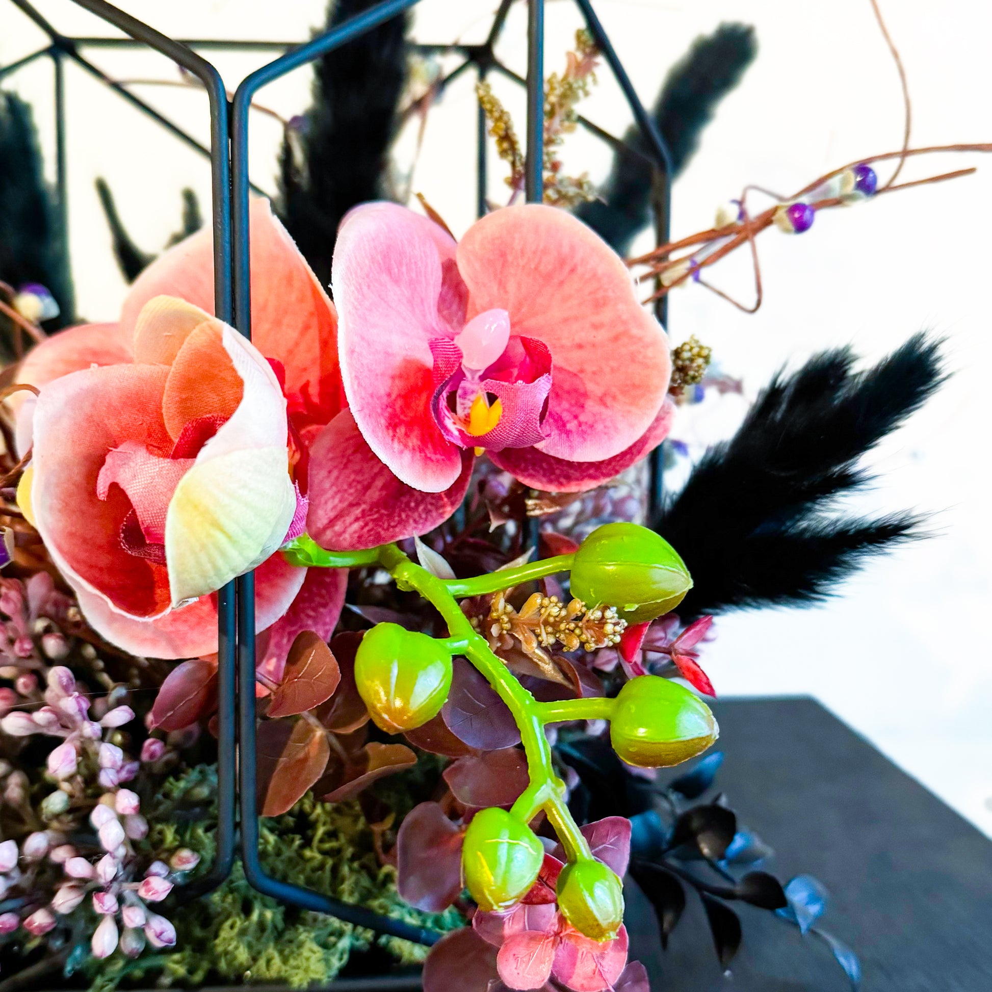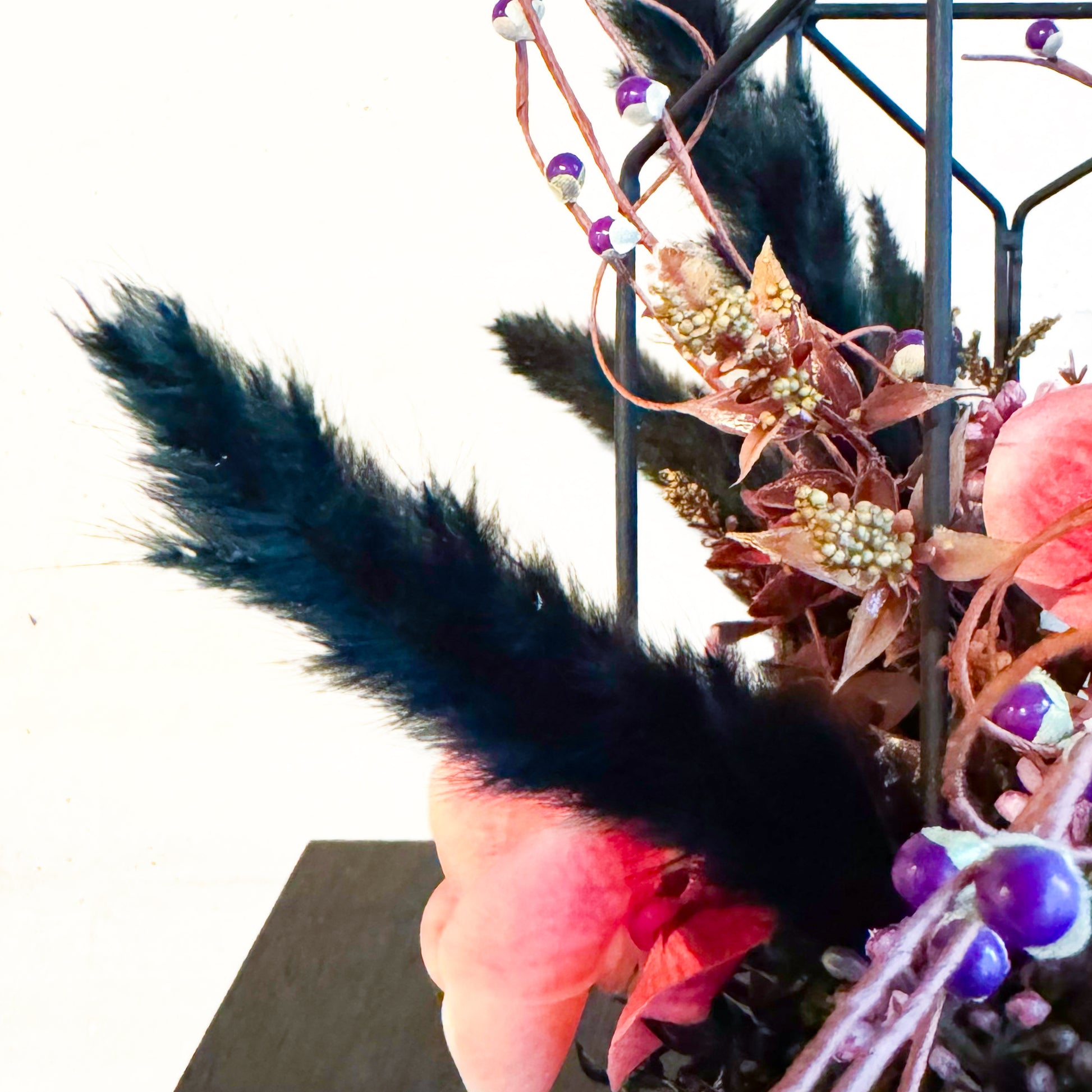 黒のアイアンフレームをキャンバスに、コーラルピンクの蘭がドラマティックに咲き誇るアレンジメント。
