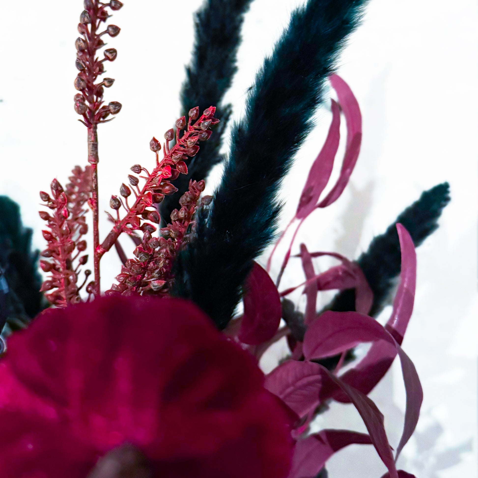 艶やかな花々と、黒の装飾やダークトーンの草花とのコントラストがモダンアートのような世界観を生み出しています。