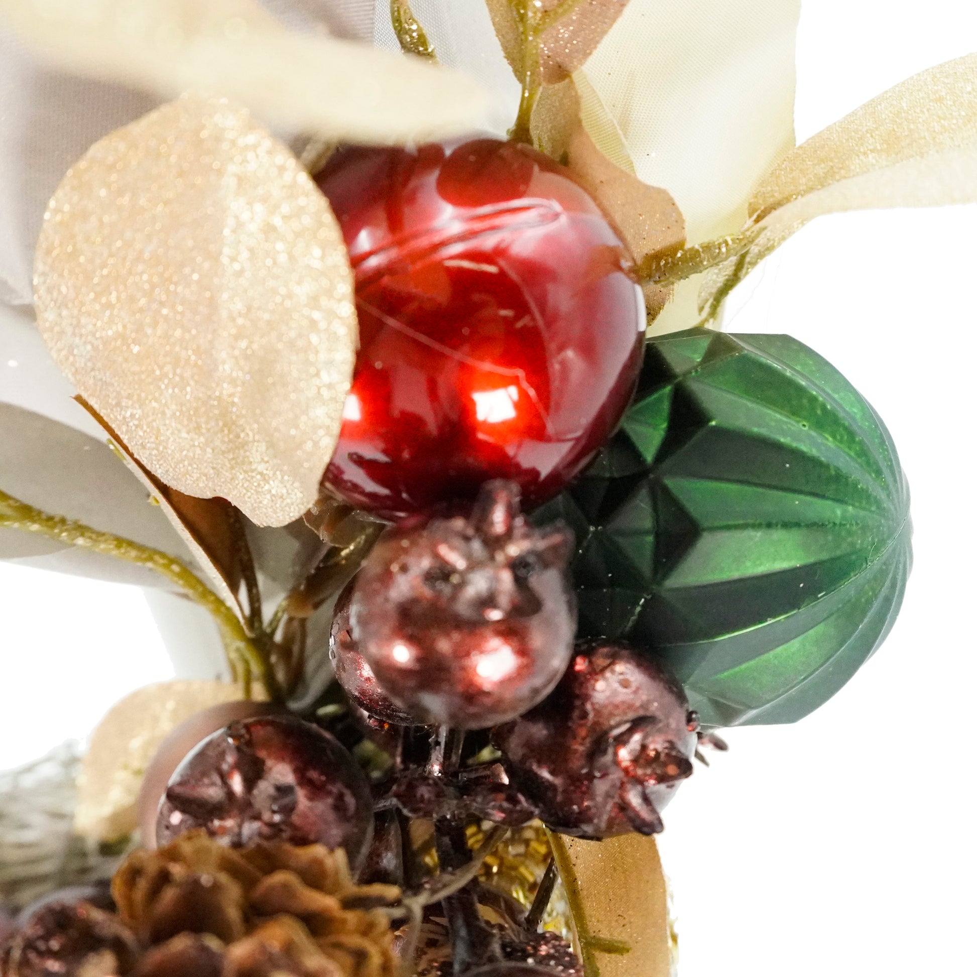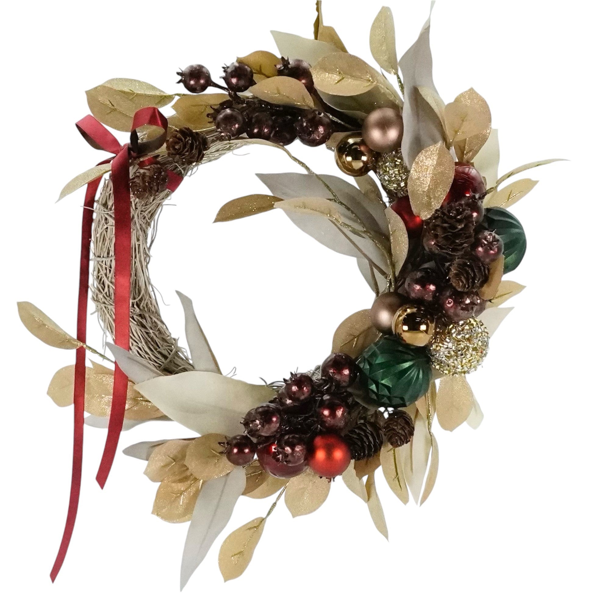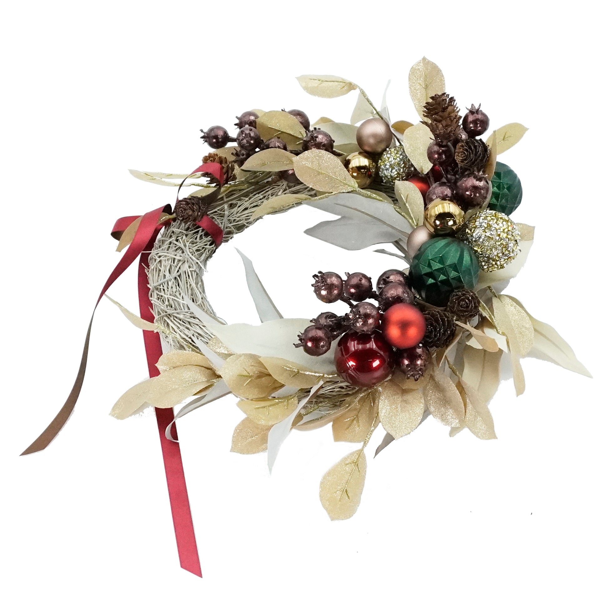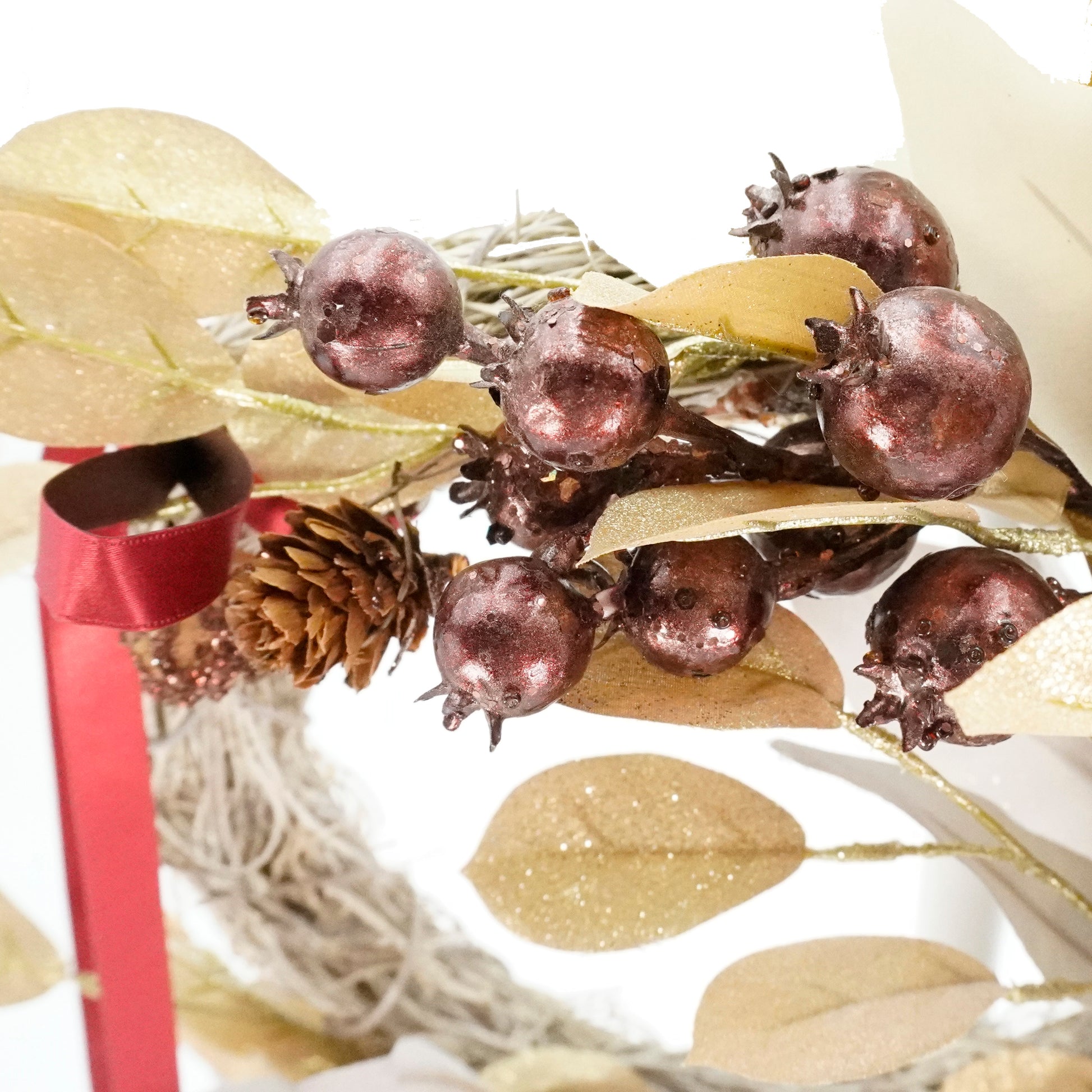 ナチュラルカラーのユーカリとラメの施されたリーフ、ブラウンのベリーオーナメントが添えられ、アクセントにクリスマスカラーの赤や緑も加えられています。ナチュラルな雰囲気と可愛らしさが融合した、高品質で上品な一品です。