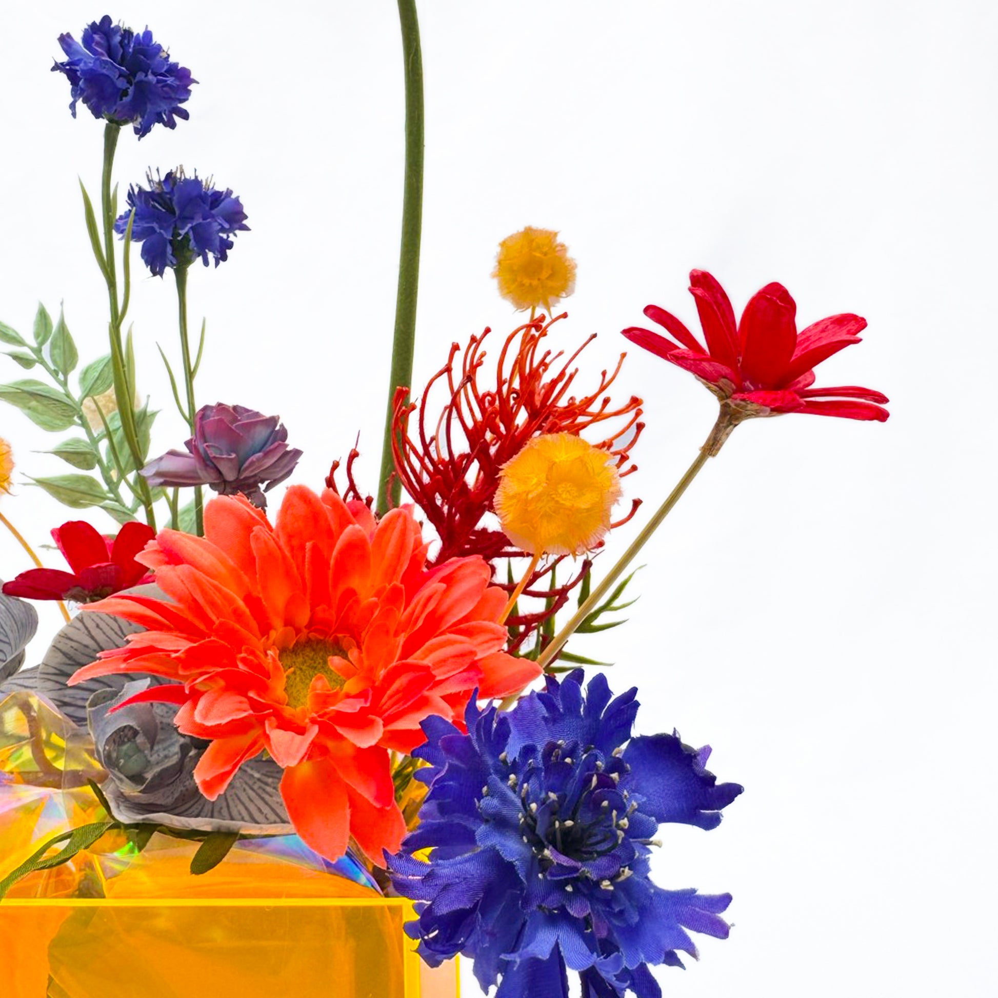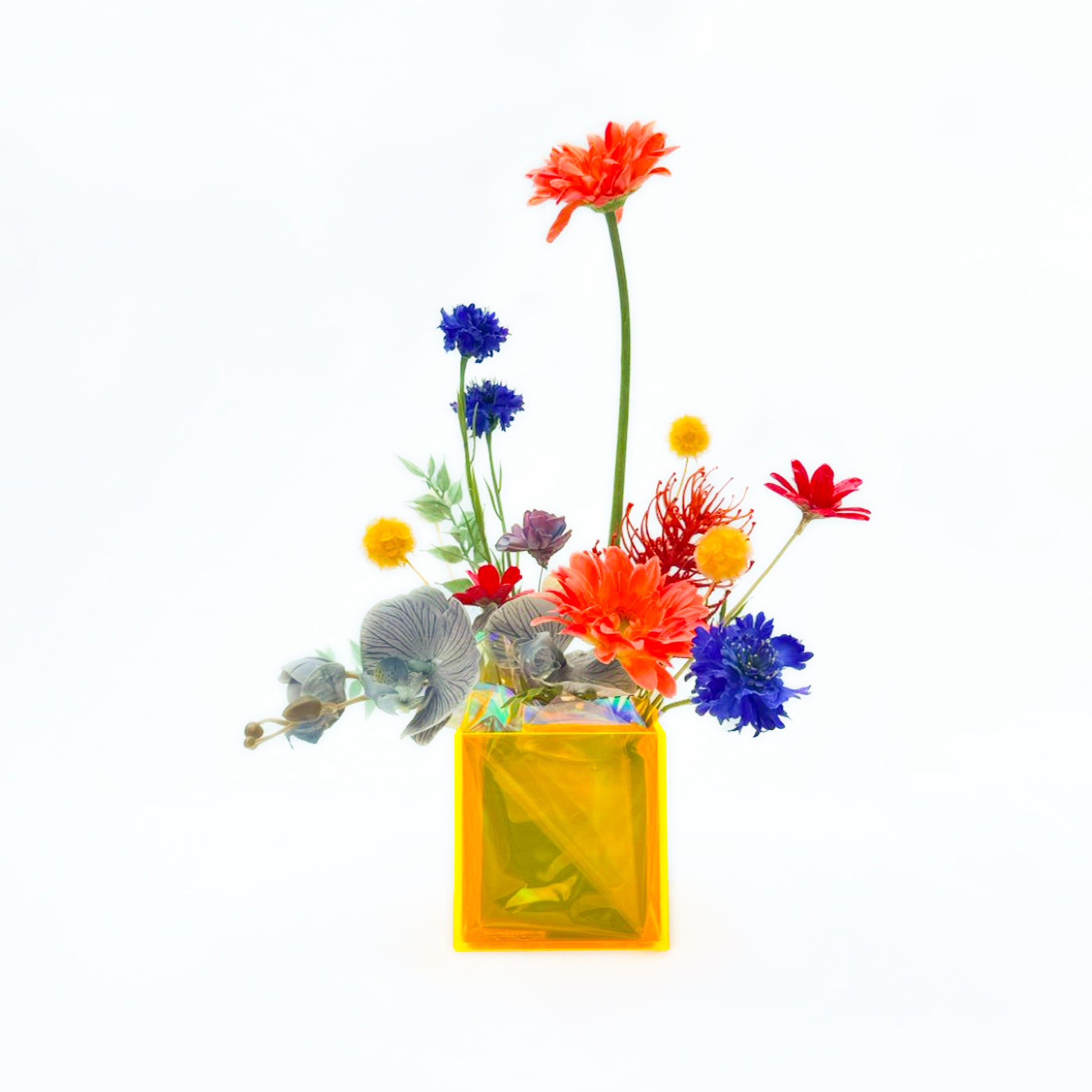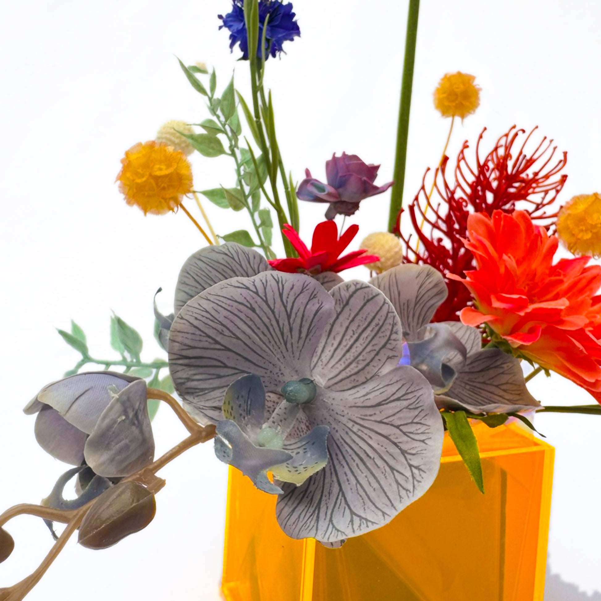 トランスペアレントなボックス型ポットに、ビビッドなネオンカラーを施し、オーロラフィルムとカラフルなモス(苔)でアクセントを加えた、ポップでファッショナブルなアレンジメントです。