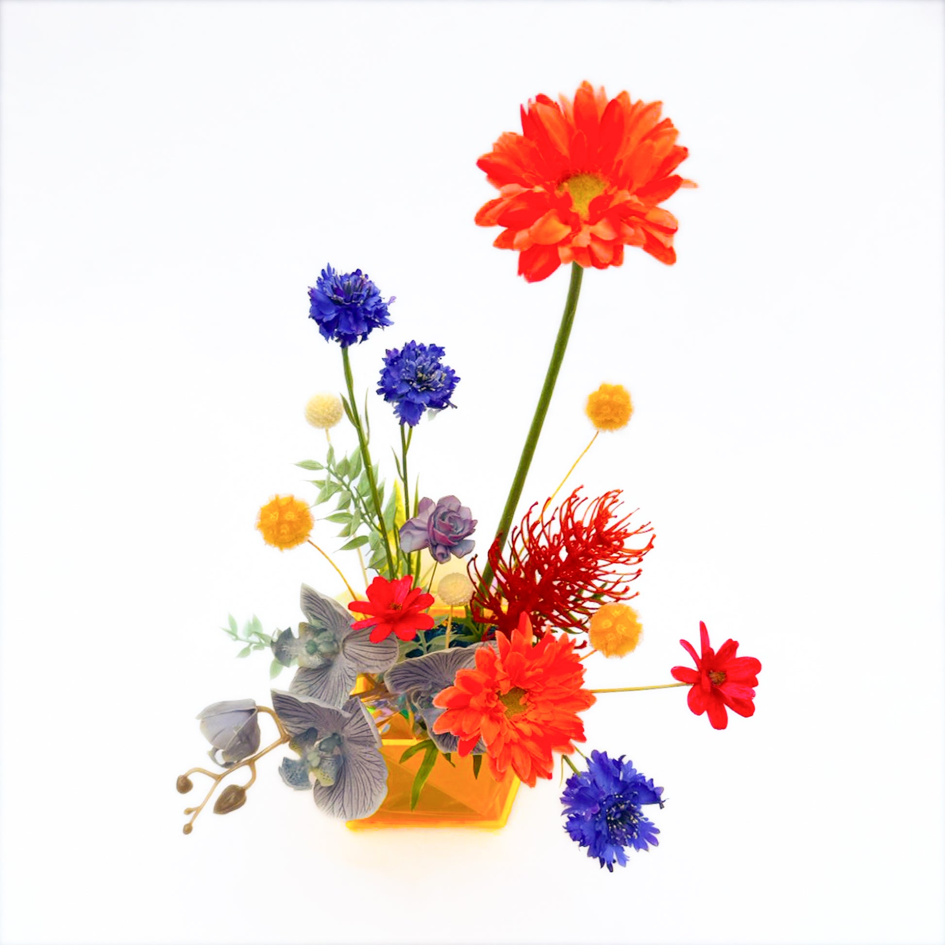 太陽に向かってすっと伸びる、ポップなオレンジのガーベラと、可愛らしいピンクのガーベラ。「幸福感」という花言葉をもつヤグルマソウ、ラウンド型が愛らしいクーゲルがやさしい雰囲気を添えます。スタイリッシュなデニムカラーの蘭と、赤いグレビレアがスパイスとなり、アレンジ全体を引き締めるおしゃれなオブジェに仕上がりました。イエローのポットと中のブルーモスもファッショナブルで素敵。置くだけで空間にモダンな彩りを添えられるこのアレンジメントは、ギフトにはもちろん、お部屋の印象を変えたいときにも最適です。<※付属品:ポット、モス*カラーはお選び頂けません。商品画像をご参照ください>