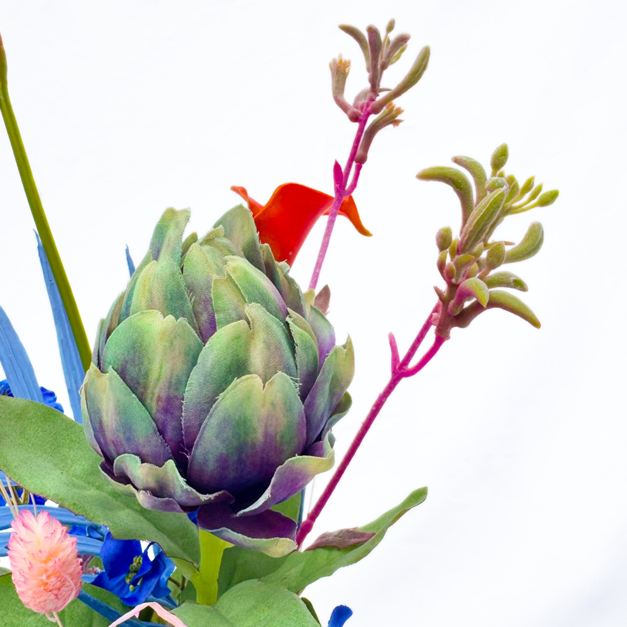 爽やかな風が吹き抜けるようなアーティチョークを主役に、エレガントなオレンジのカラーが空間を引き締めます。スタイリッシュなブルーのヤシ、個性的でおしゃれなカンガルーポー、鮮やかなブルーが映えるブルーブロッサムスプレー、ふんわりと甘さを添えるピンクブロッサムスプレーが、モダンに調和したアレンジメントです。イエローのポットと中のブルーモスがファッショナブル。トレンド感あふれるフレッシュな印象の中に、知的で重厚な趣も感じさせる逸品。大切な方への贈り物としてはもちろん、お部屋のアクセントにもおすすめです。