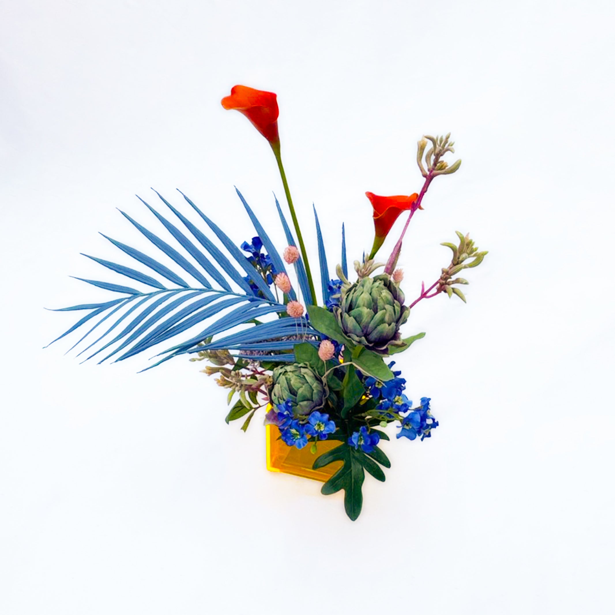- 花材:ブルーヤシ、アーティチョーク、カンガルーポー、ブルーブロッサムスプレー、ピンクポアプランツ、オレンジのカラー、青いモス