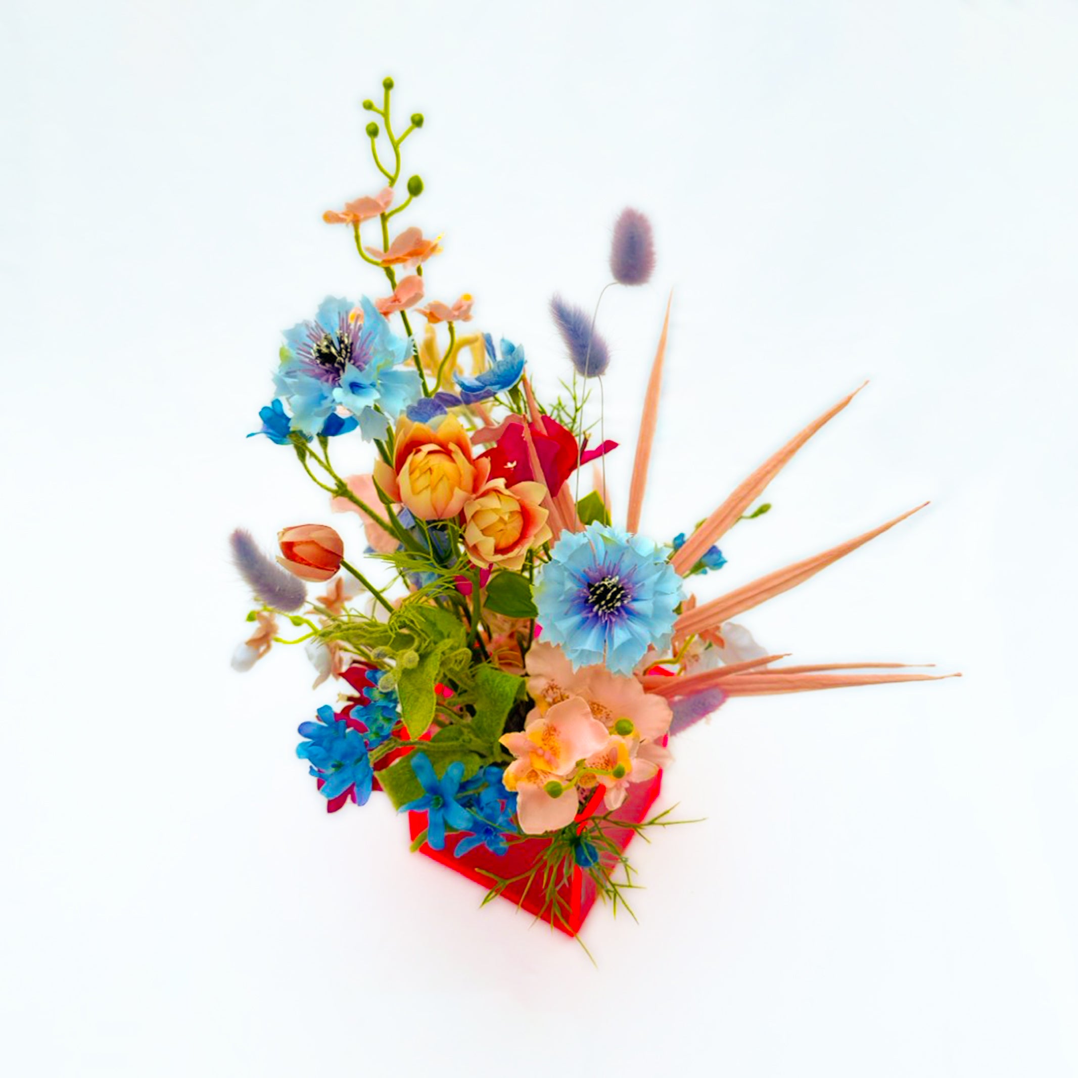 - 花材:セルリア、コーンフラワー、ブーゲンビリア、蘭、ブルースター、ピンクのヤシの葉、猫じゃらし、