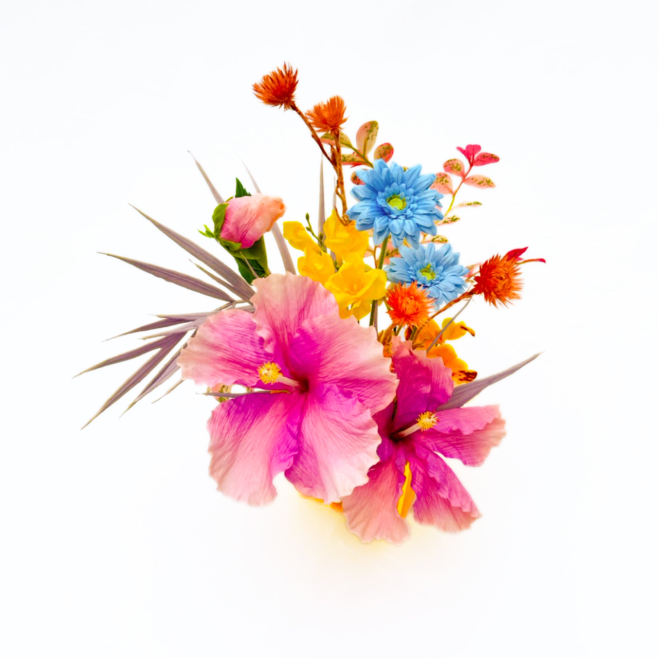 - 花材:ヤシの葉、ハイビスカス、あじさい、ガーベラ、、フリージア、エバーラスティング
