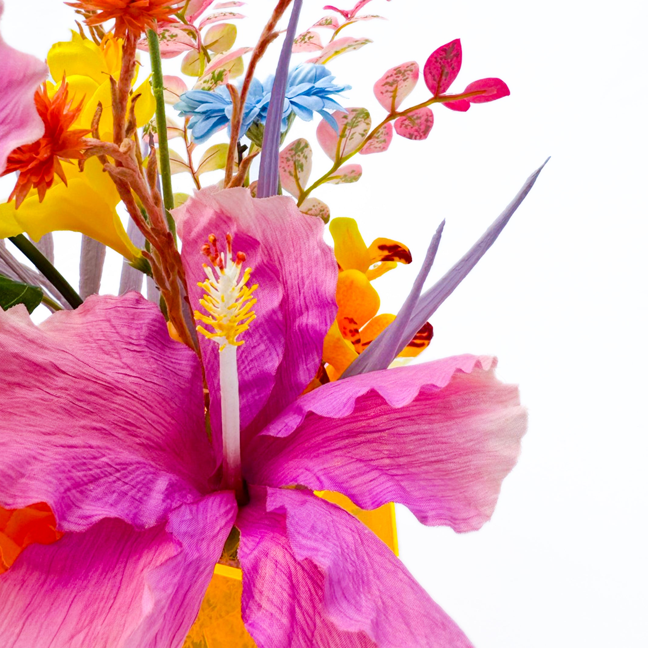 印象的なハイビスカスを主役に、パープルのヤシの葉がその魅力を引き立てます。ブルーが鮮やかに映えるガーベラ、優雅なイエローのフリージアやあじさい、オレンジのパール付蘭、そして「永遠の愛」という花言葉を持つ個性的なオレンジのエバーラスティングが、トロピカルな気分を誘う心地よいアレンジメントです。イエローのポットと、ホワイトグリーンのモスもファッショナブルなアクセントに。置くだけでお部屋を明るく彩り、気分まで晴れやかになるようなオブジェです。ギフトにはもちろん、店頭ディスプレイやご自宅のインテリアとしてもおすすめです。<※付属品:ポット、モス*カラーはお選び頂けません。商品画像をご参照ください>