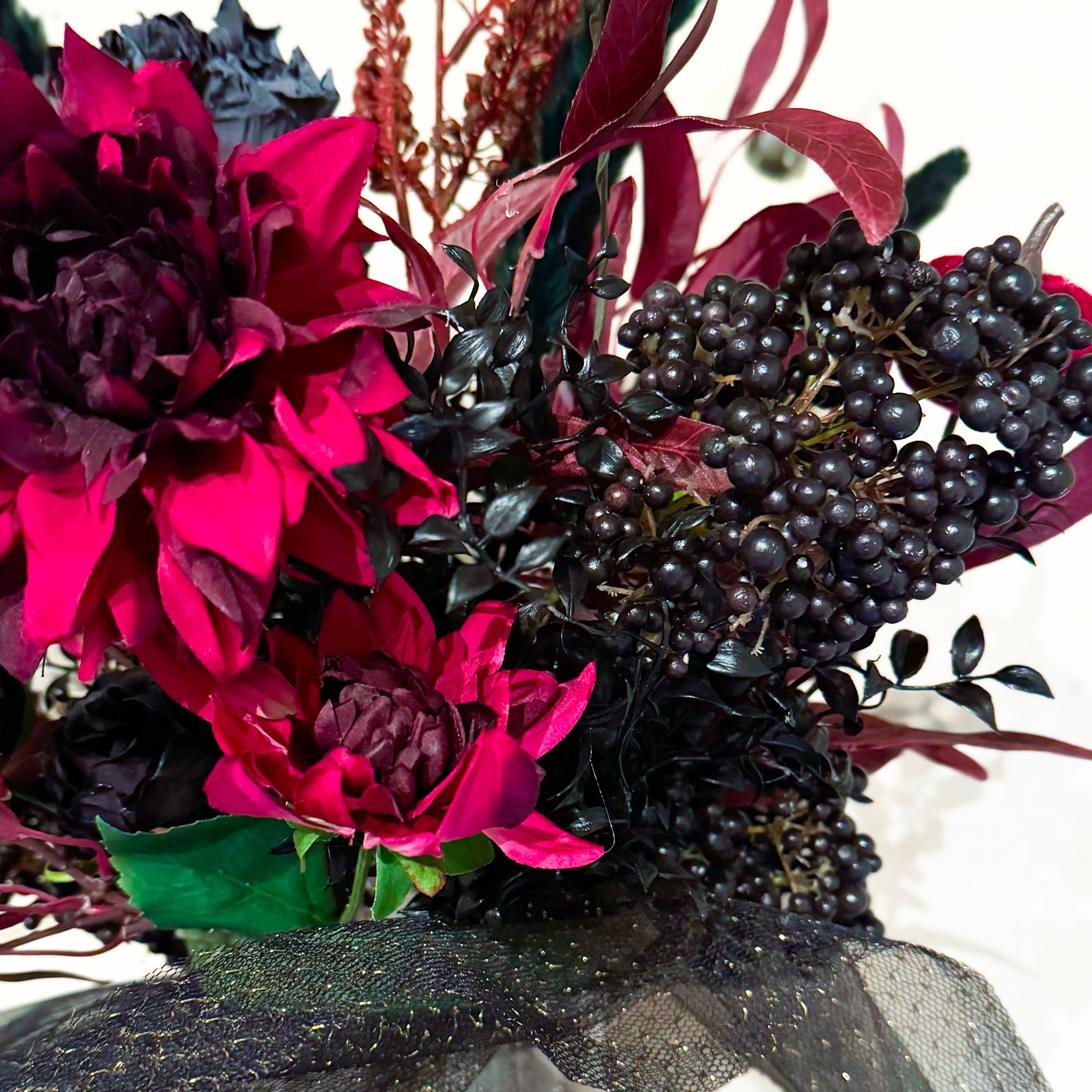 深紅のダリアやボルドーの花々を中心に、ブラックの実物やスモーキーな葉を合わせたドラマティックなアレンジメント。