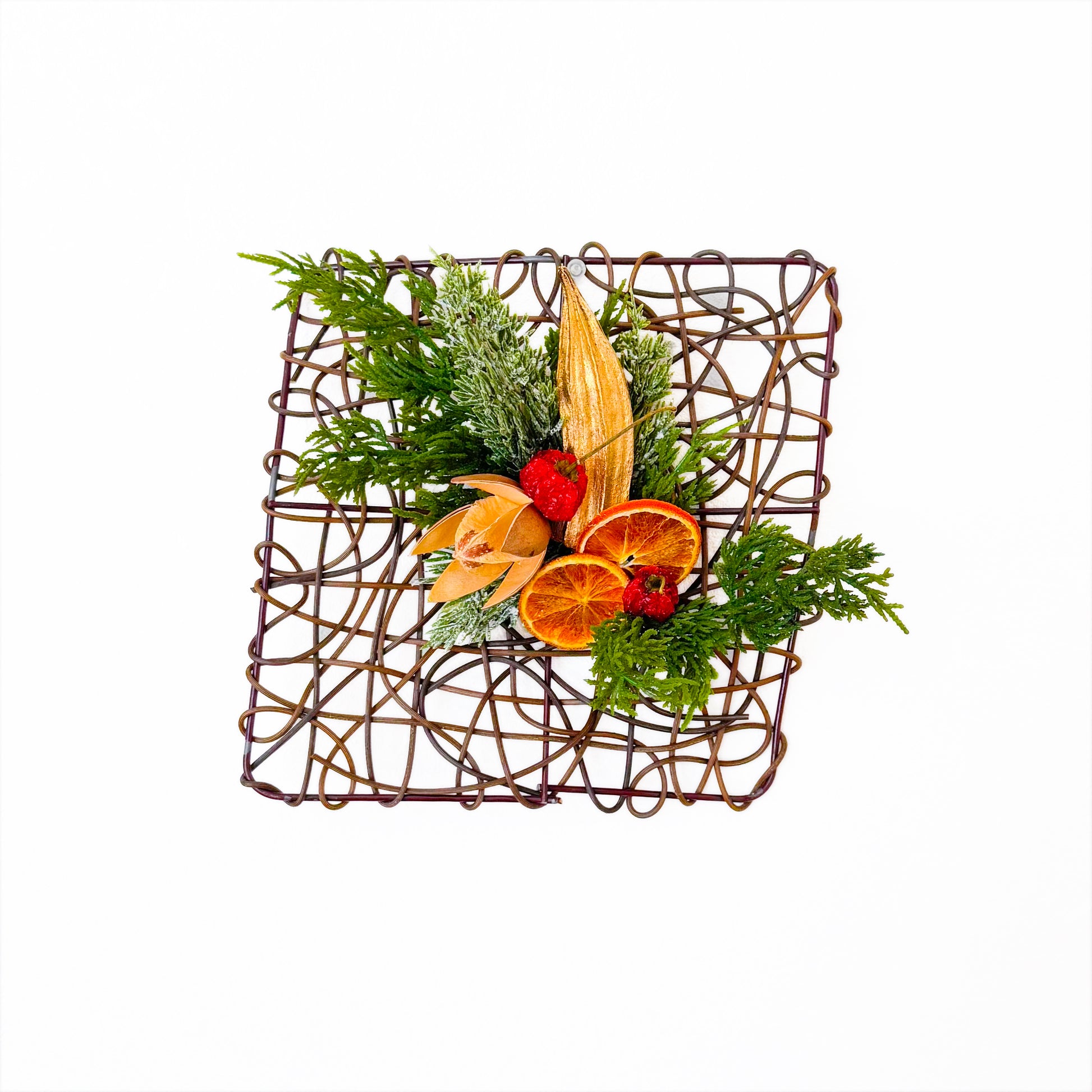 - 花材:ドライフルーツオレンジ、ドライオクラ、ドライ唐辛子、リリー、サイプレス(ヒノキ) ・その他:フレーム、網