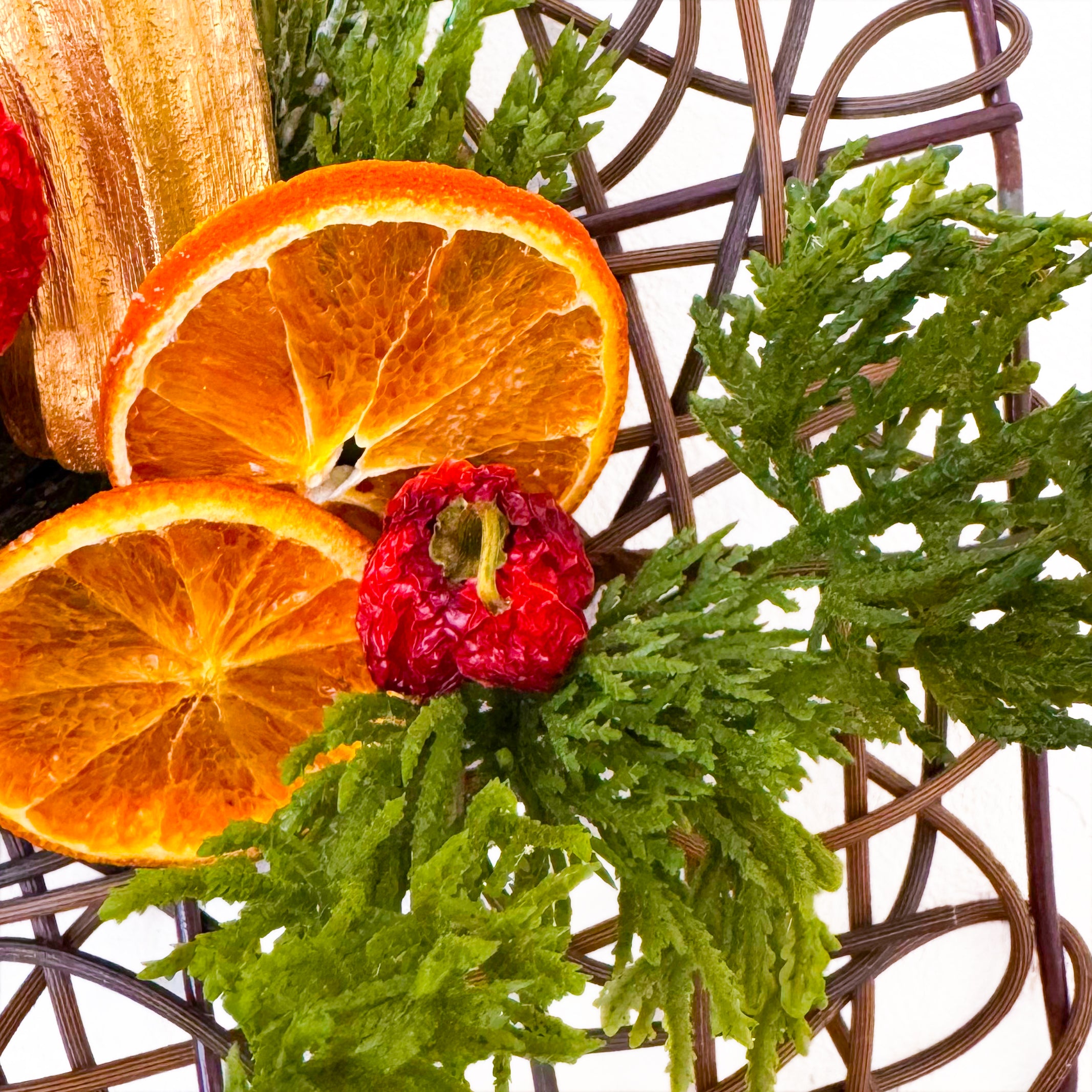 ブラウンのワイヤーにはドライフルーツのオレンジ、ドライのオクラ、ドライ唐辛子、リリー、サイプレス(ヒノキ)がおしゃれにデコレート。