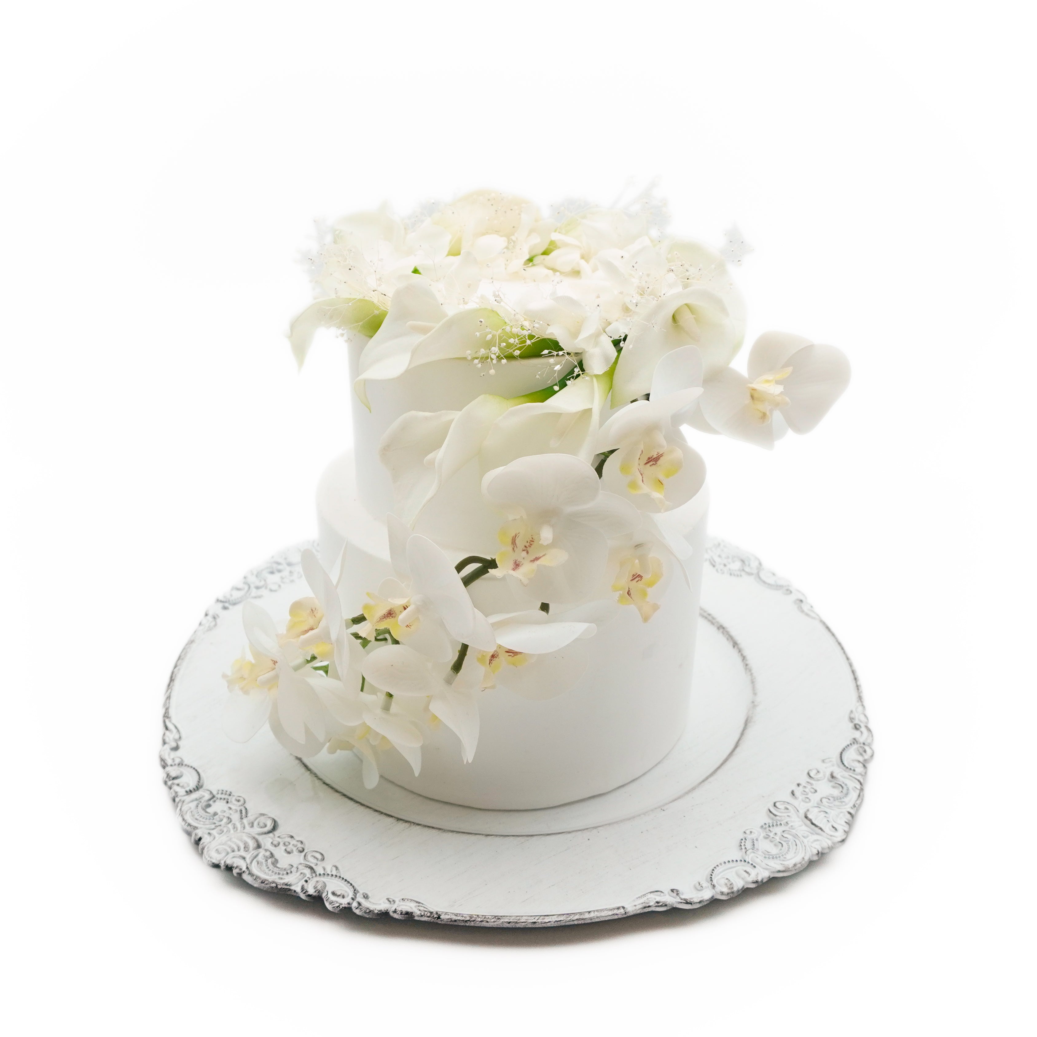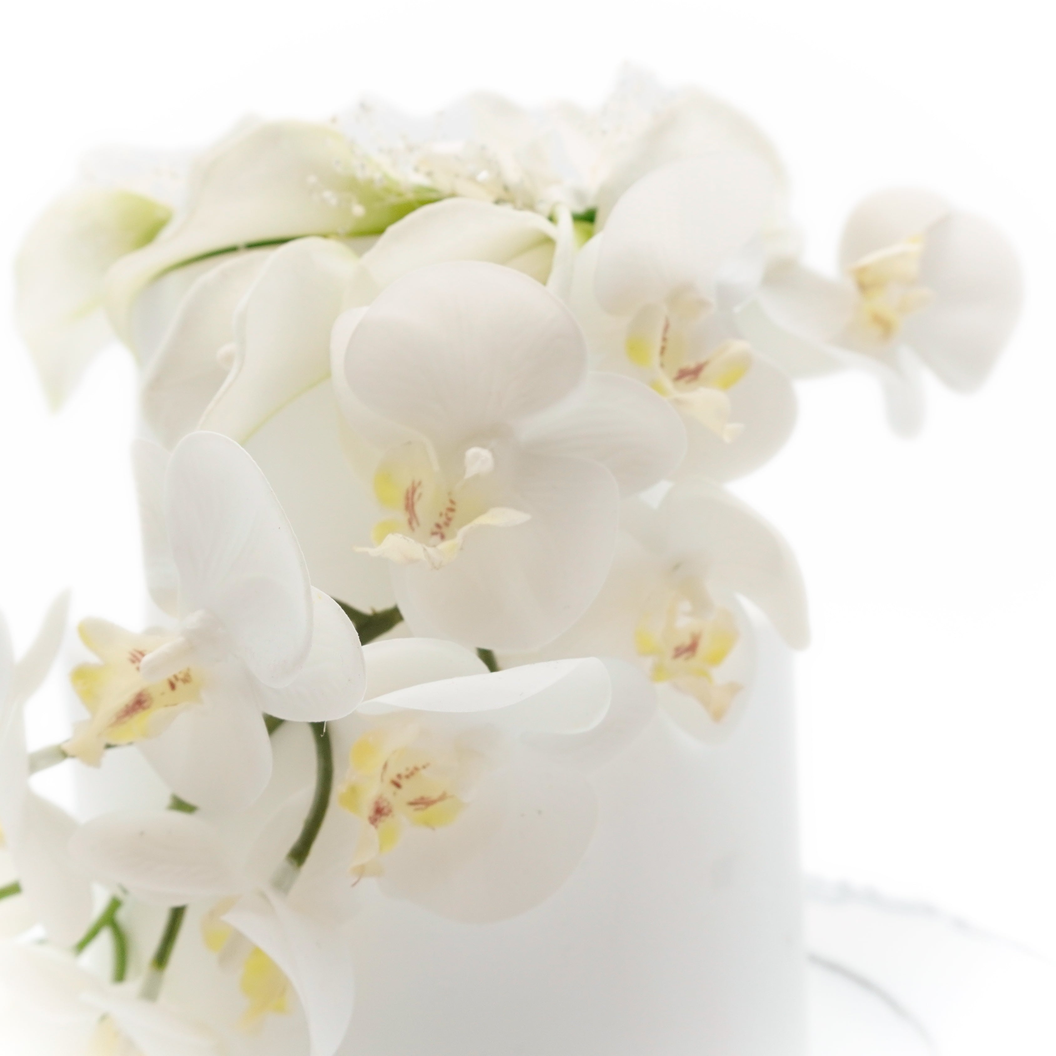 一目でピュアかつ無垢を連想させるホワイトベースの2段クレイケーキ。花言葉どおり華やかな花々が彩り添えたエレガントなオブジェ。「清らかな心」「無邪気」を表すかすみ草、「乙女のしとやかさ」のカラー、「優美」なセイントブバリア、「豊かさ」の胡蝶蘭は、どれもお祝いのシーンに欠かせない花です。繊細なアレンジは、かすみ草にドライフラワーを用い、シルバーラメで小粋に輝きをオンしています。ブライダルシーンやセレブ感のあるイベントで華を添えるデコレーションとしておすすめです。<注:ケーキ台は付属しません。この商品は食べられません>